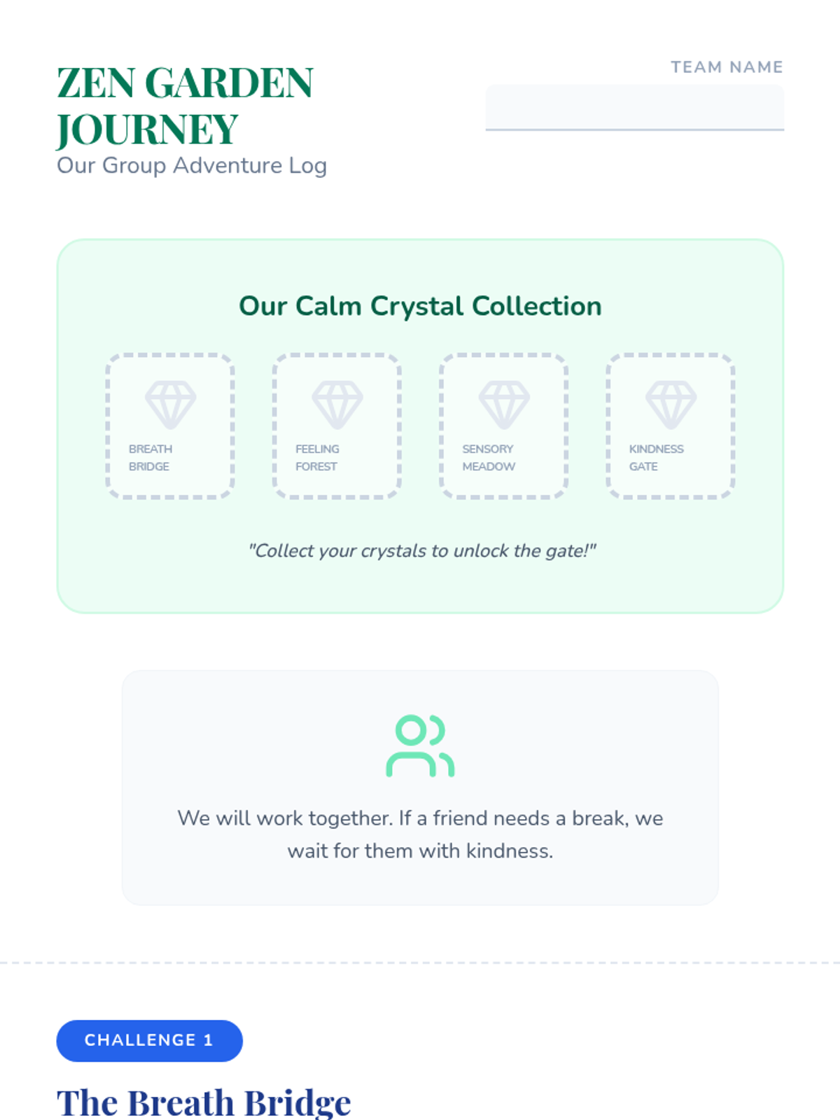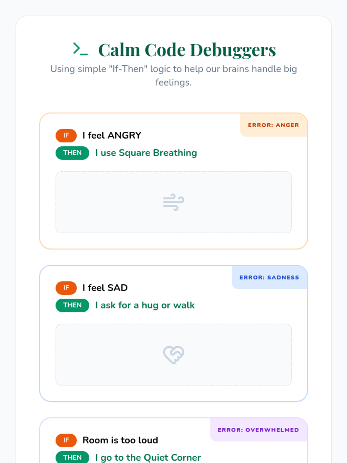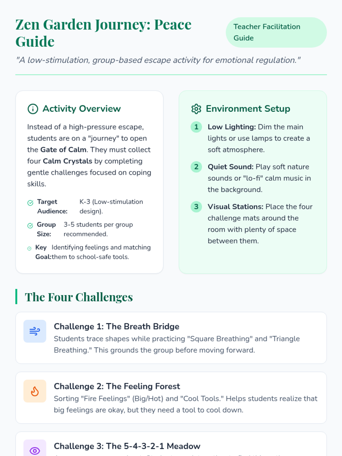 A gentle, non-stimulating escape room activity designed for K-3 students to practice school-based coping strategies and self-care during moments of emotional dysregulation. The lesson focuses on identifying 'big feelings' and matching them with appropriate 'cool-down tools' in a calm, supportive group environment.