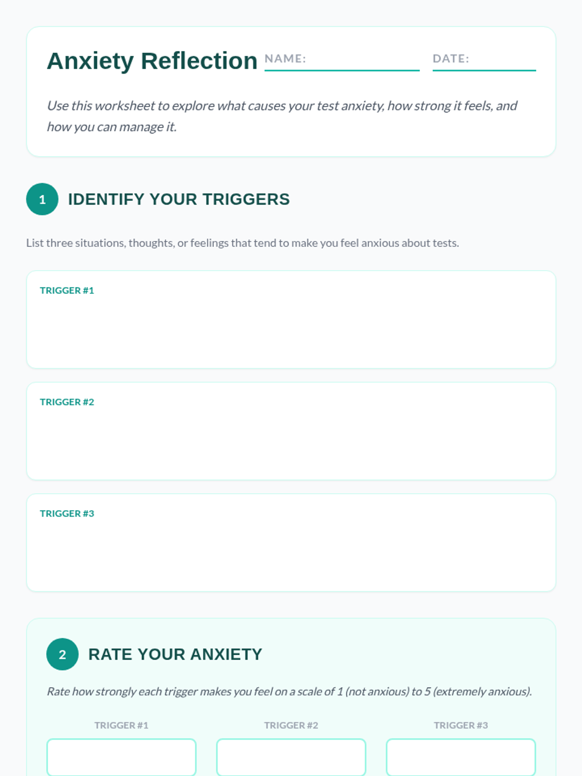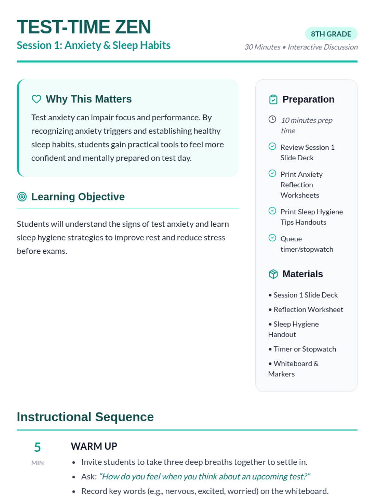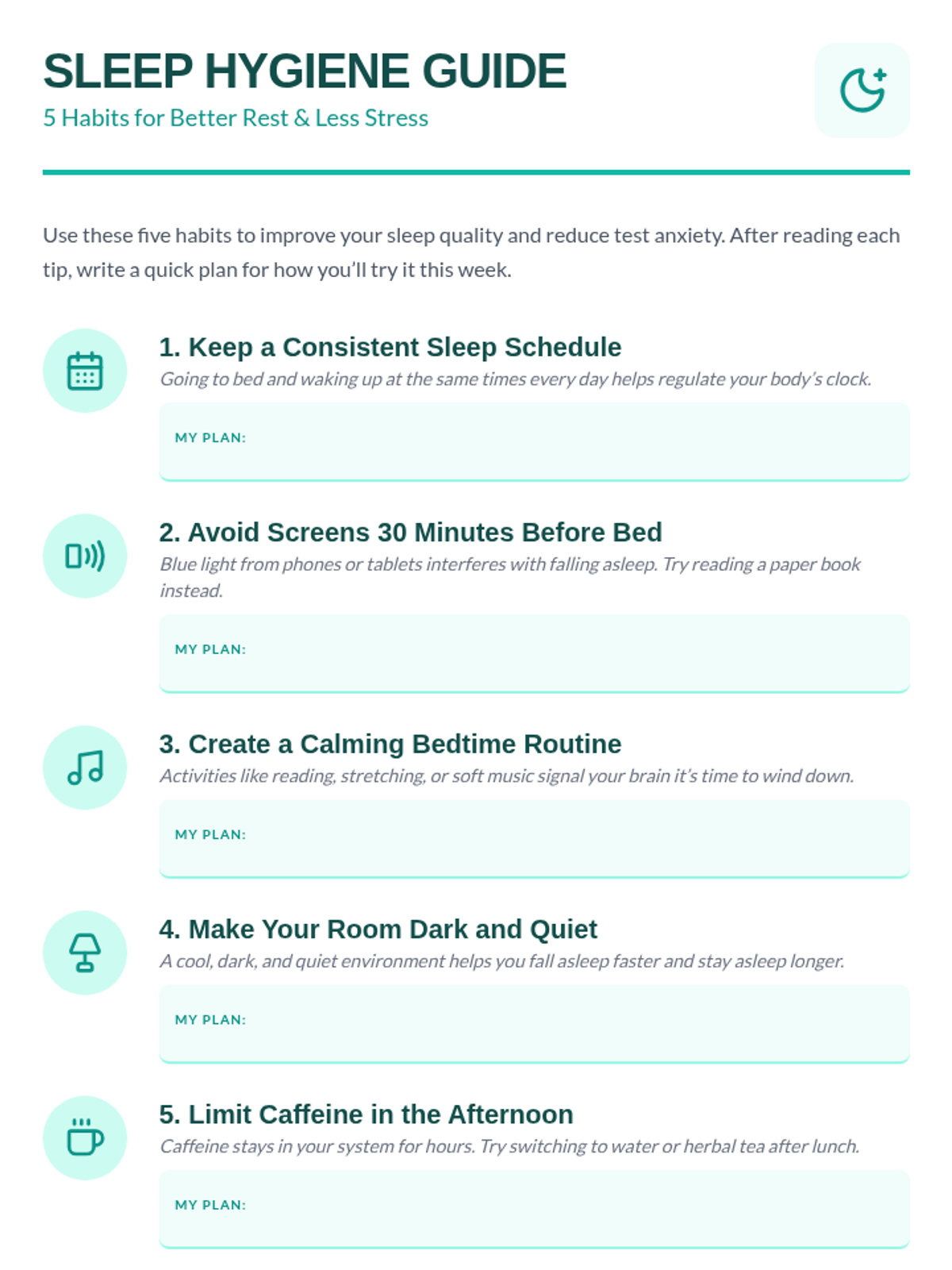 Students define test anxiety, identify personal triggers, and learn sleep hygiene strategies to improve rest before exams.