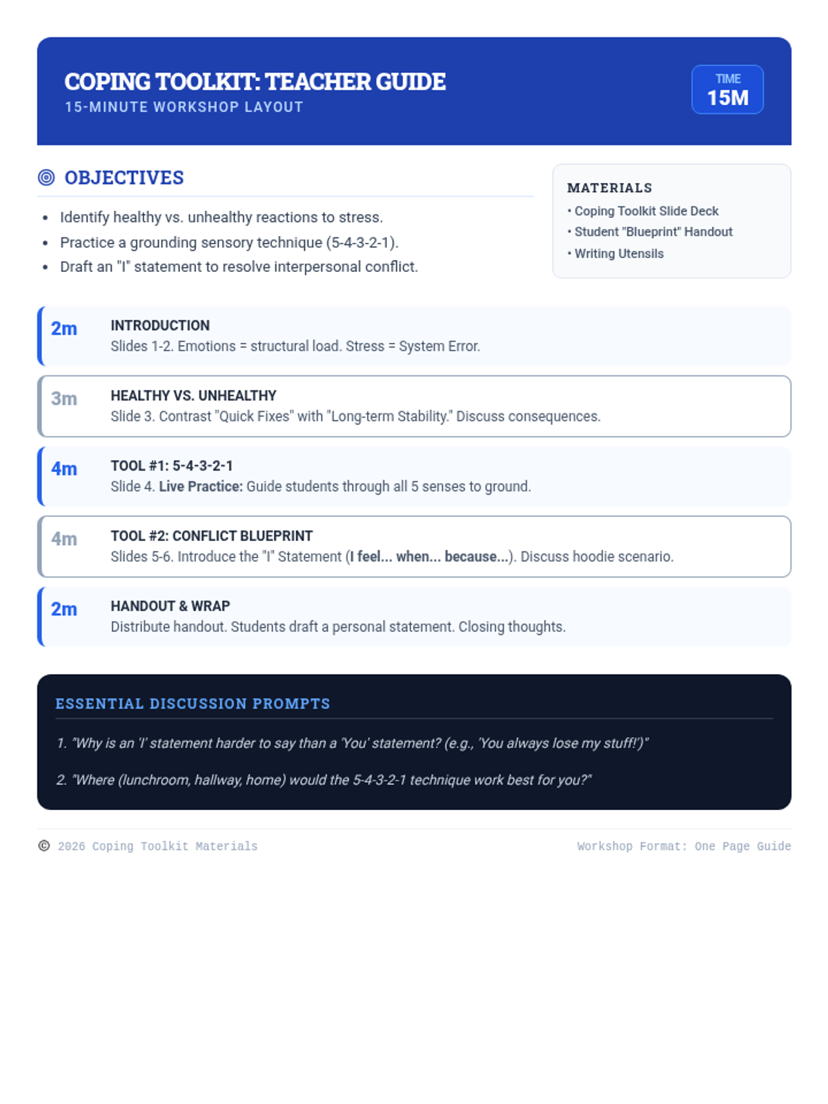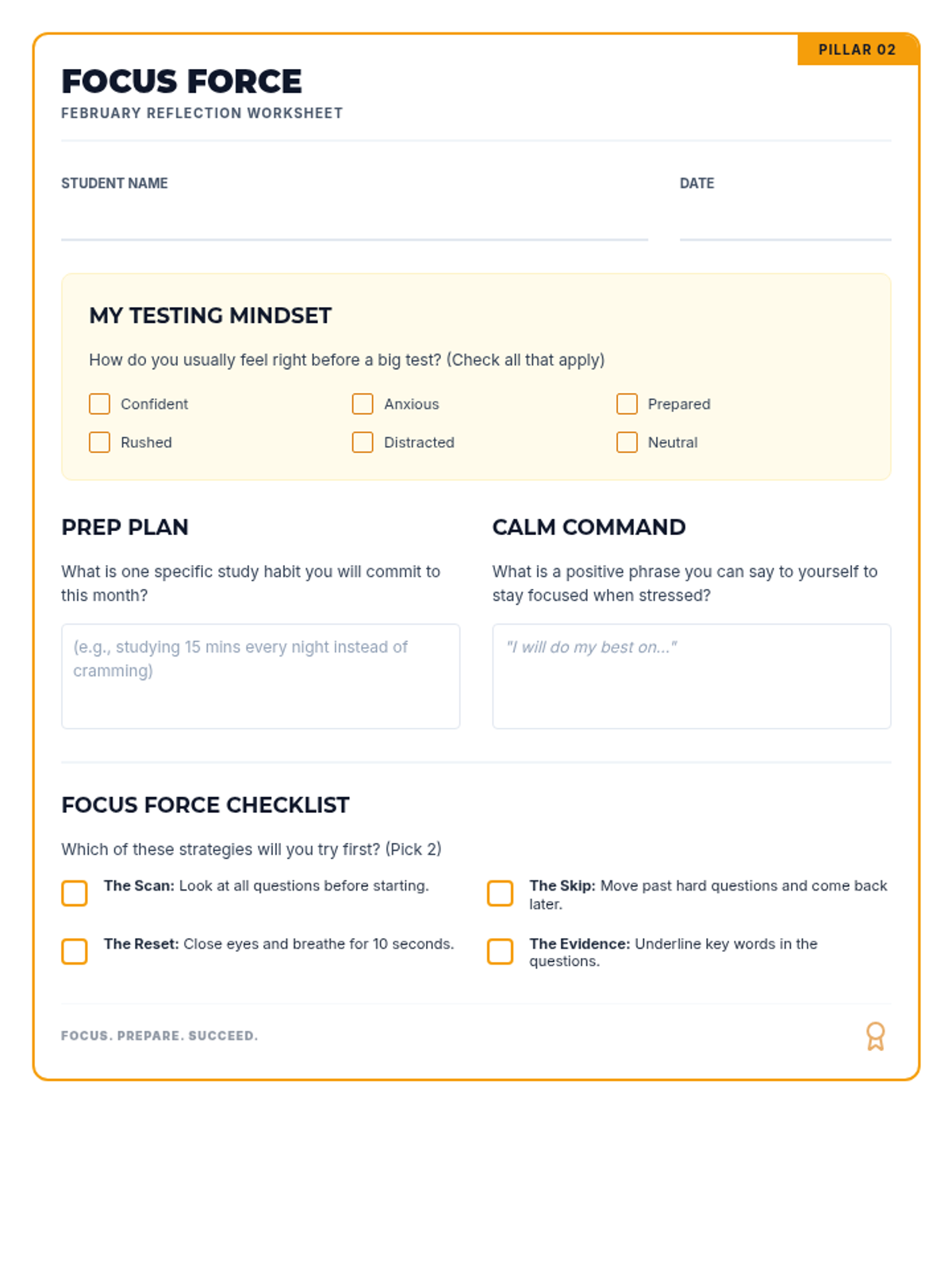 A comprehensive lesson designed to help students manage standardized test anxiety through physical relaxation techniques and cognitive reframing strategies. Students will learn to recognize stress signals and build a personalized toolkit for staying calm and focused.