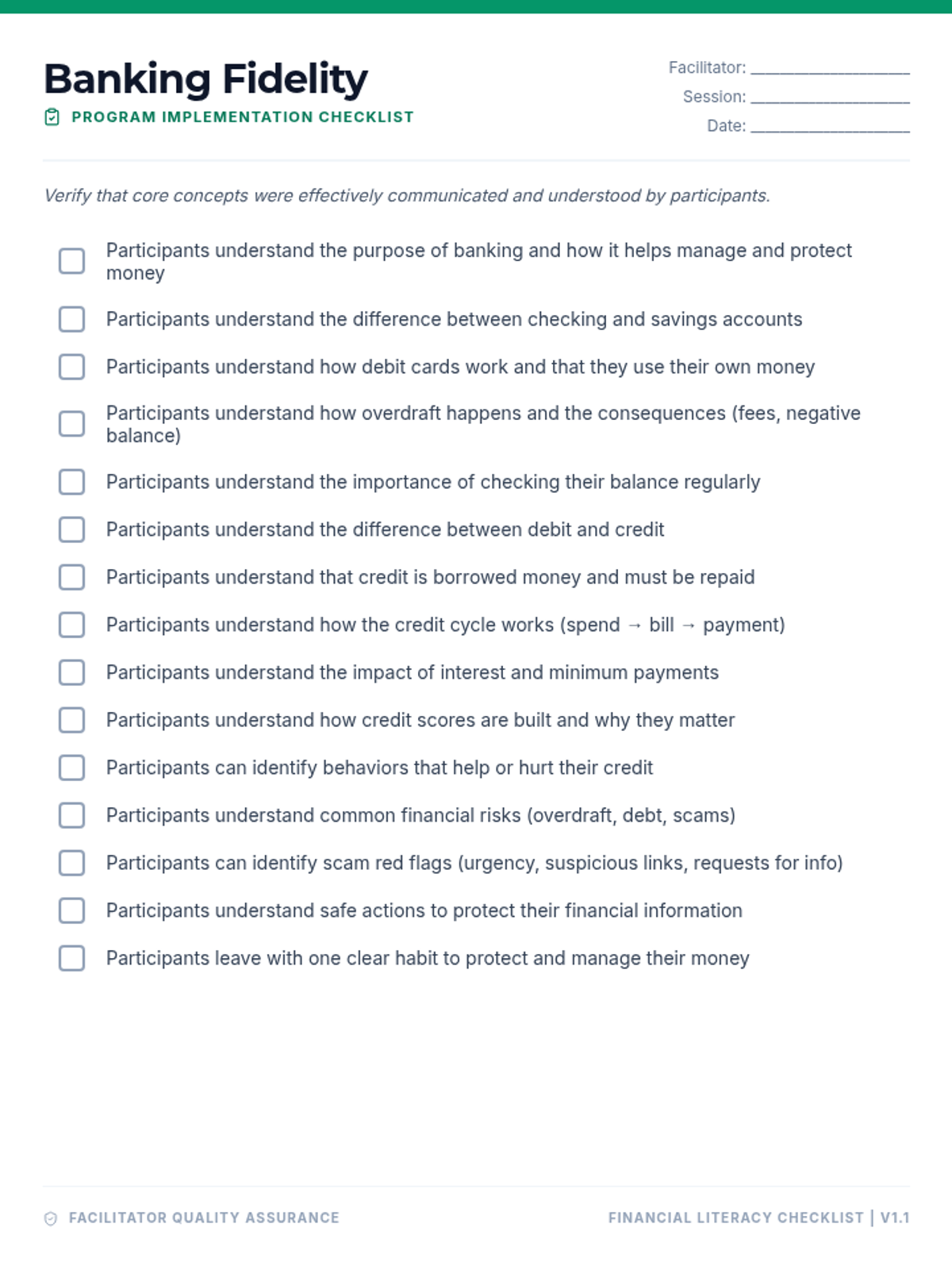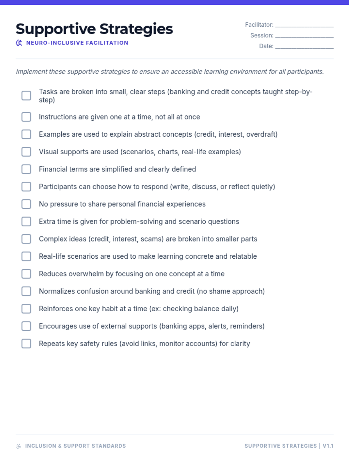 A set of professional tools for facilitators to ensure high-quality delivery and inclusive support during financial literacy sessions.