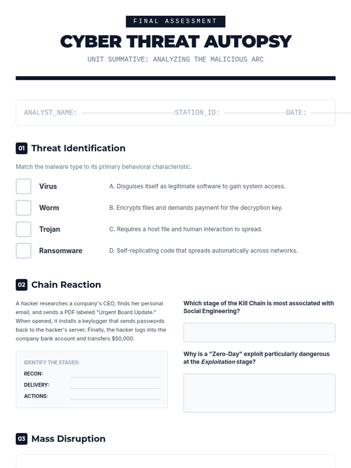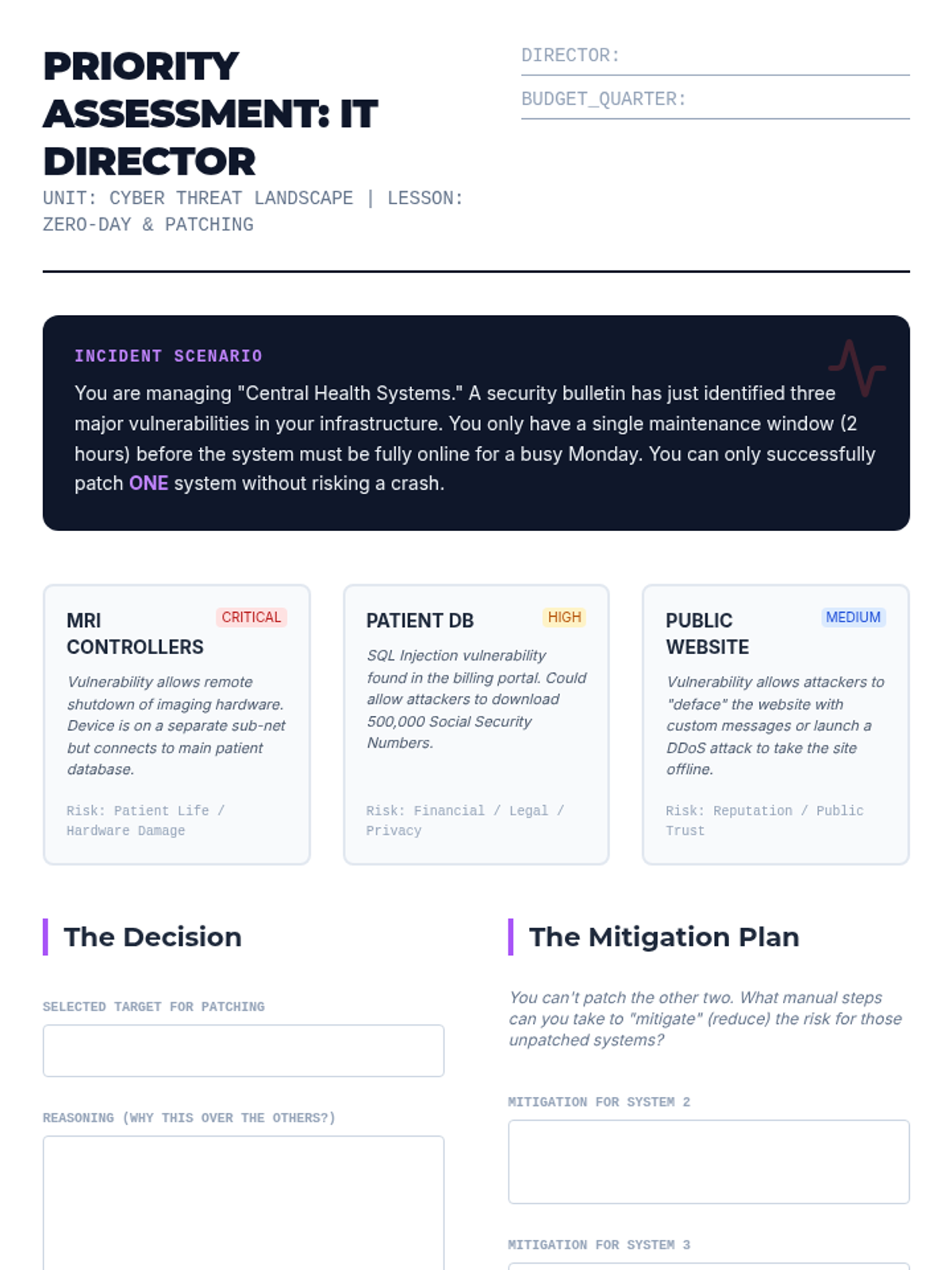 Students explore unknown vulnerabilities (zero-days) and the critical importance of patch management through a risk assessment simulation.