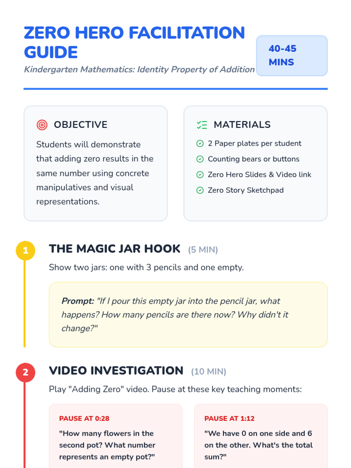 A Kindergarten math lesson where students use concrete manipulatives and paper plates to discover that adding zero to any number doesn't change the value. Students will practice counting, visual representation, and simple equation building through hands-on activities.