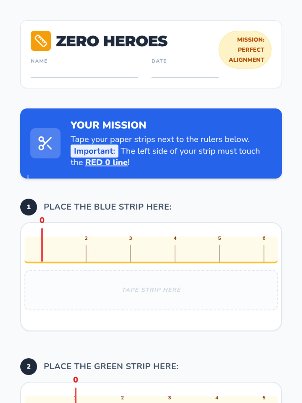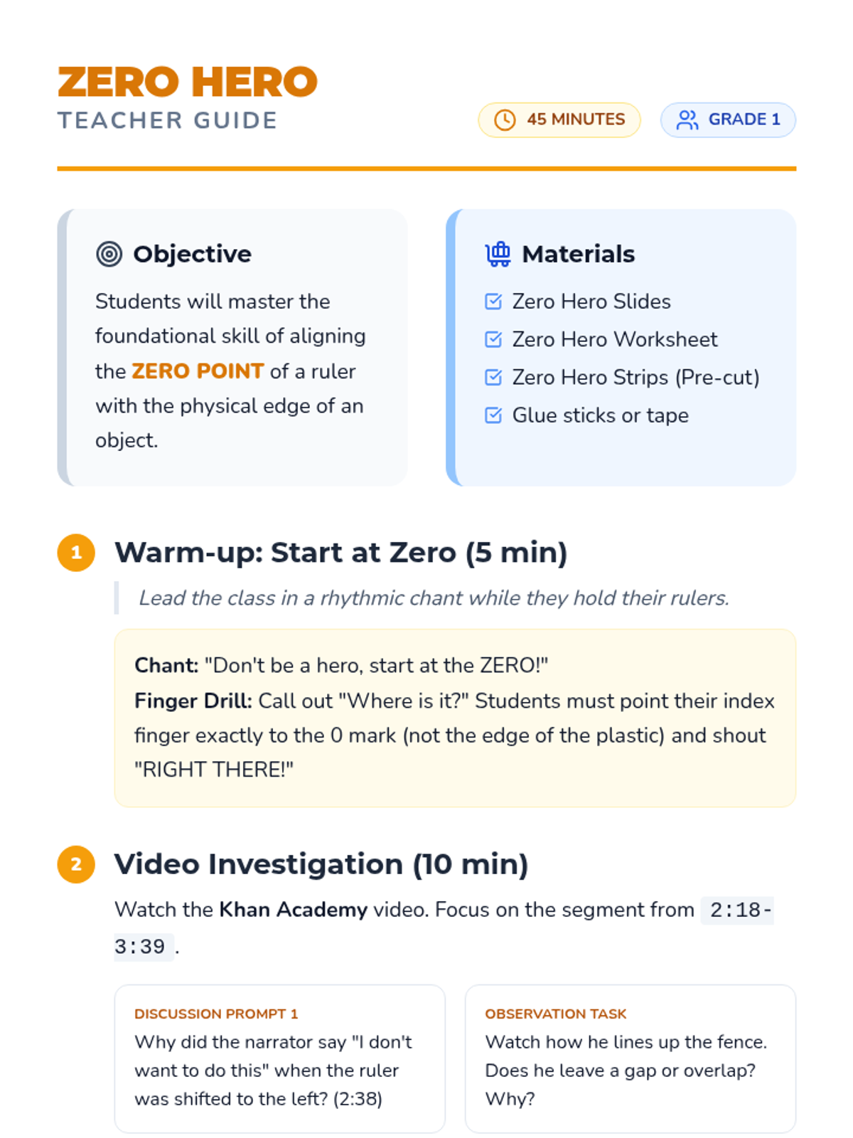A hands-on lesson for 1st graders to master the critical skill of aligning the 'zero' mark of a ruler with the edge of an object using tactile paper strip activities and video analysis.