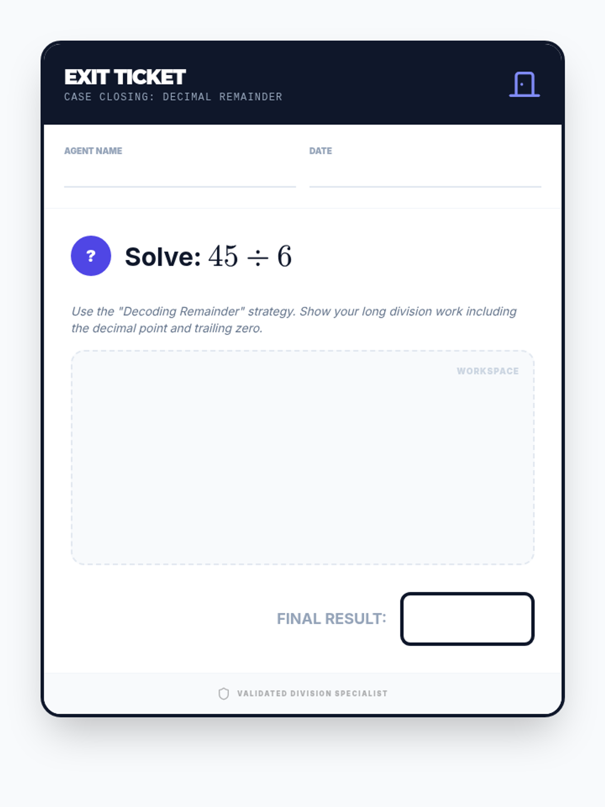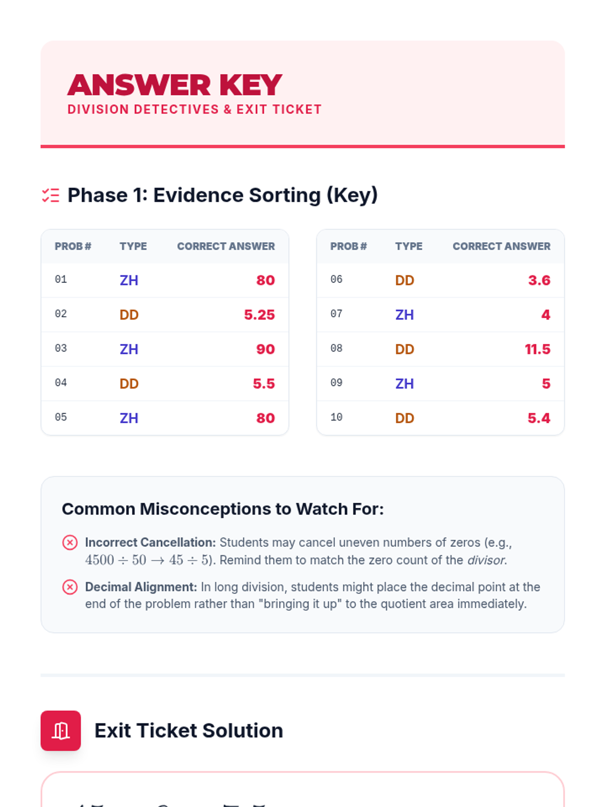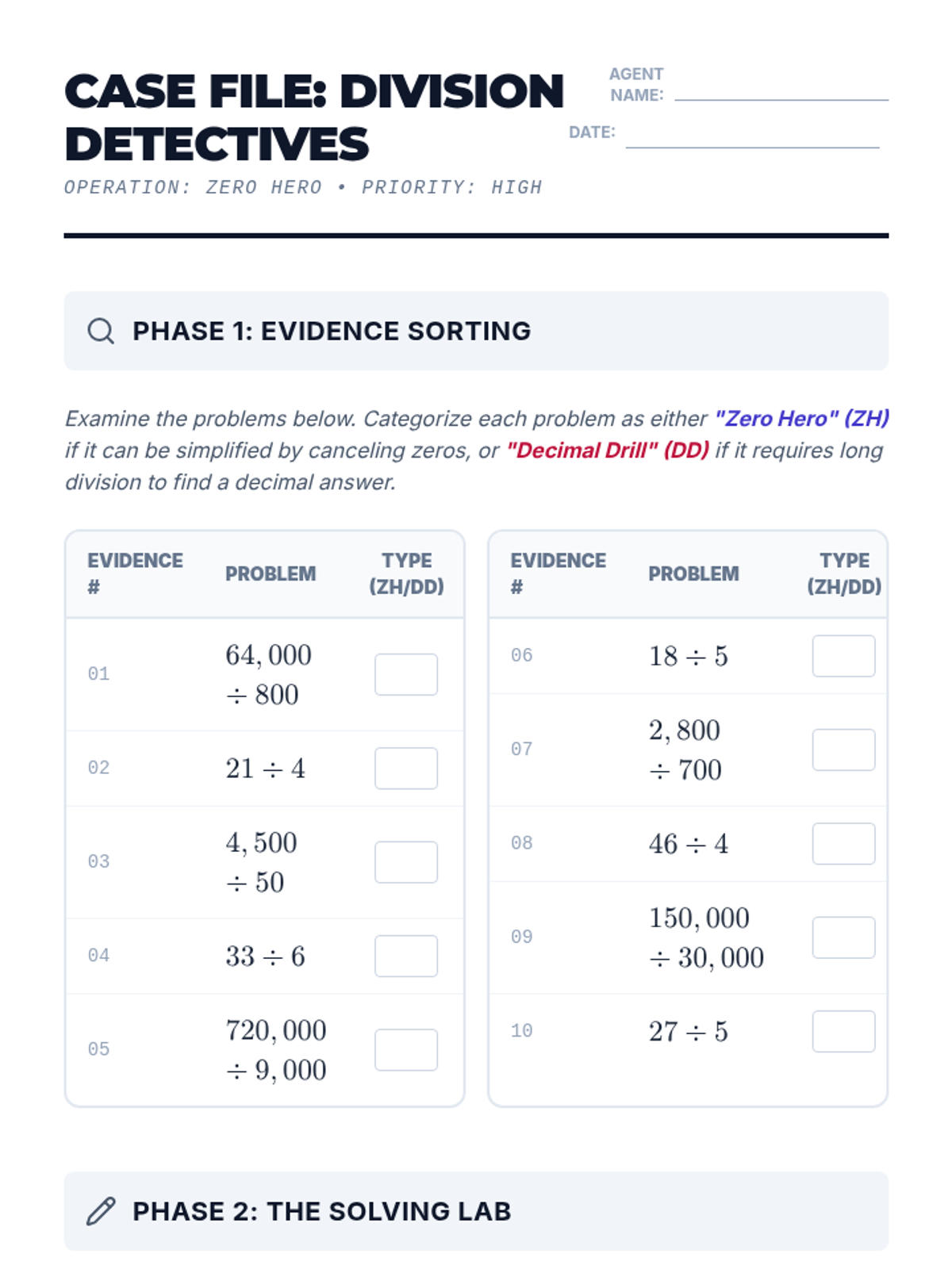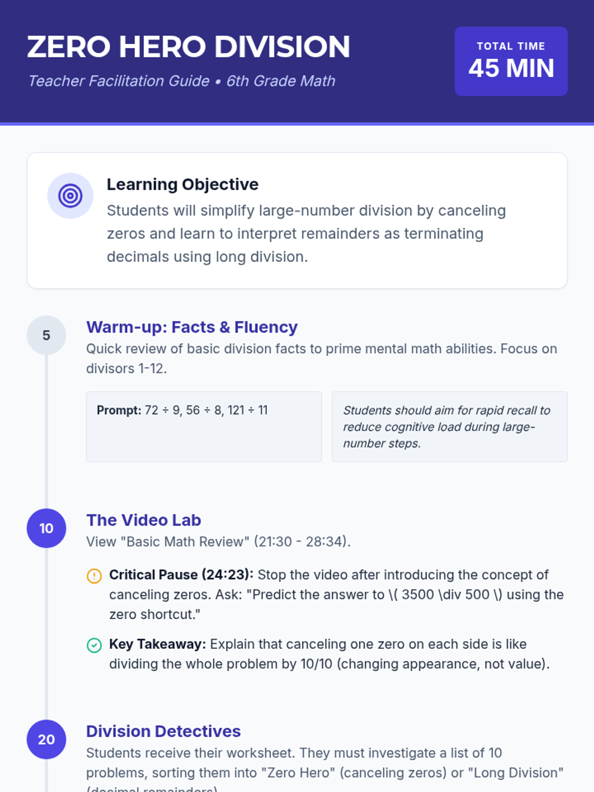 Students will master the 'Zero Hero' strategy of canceling zeros in division and learn to express remainders as decimals through long division. This lesson features a 'Division Detectives' activity where students sort and solve large-number problems.