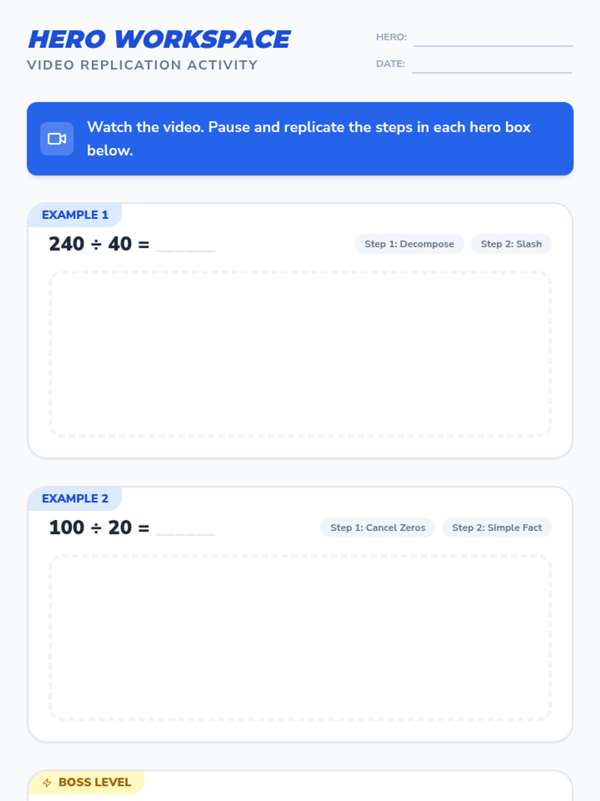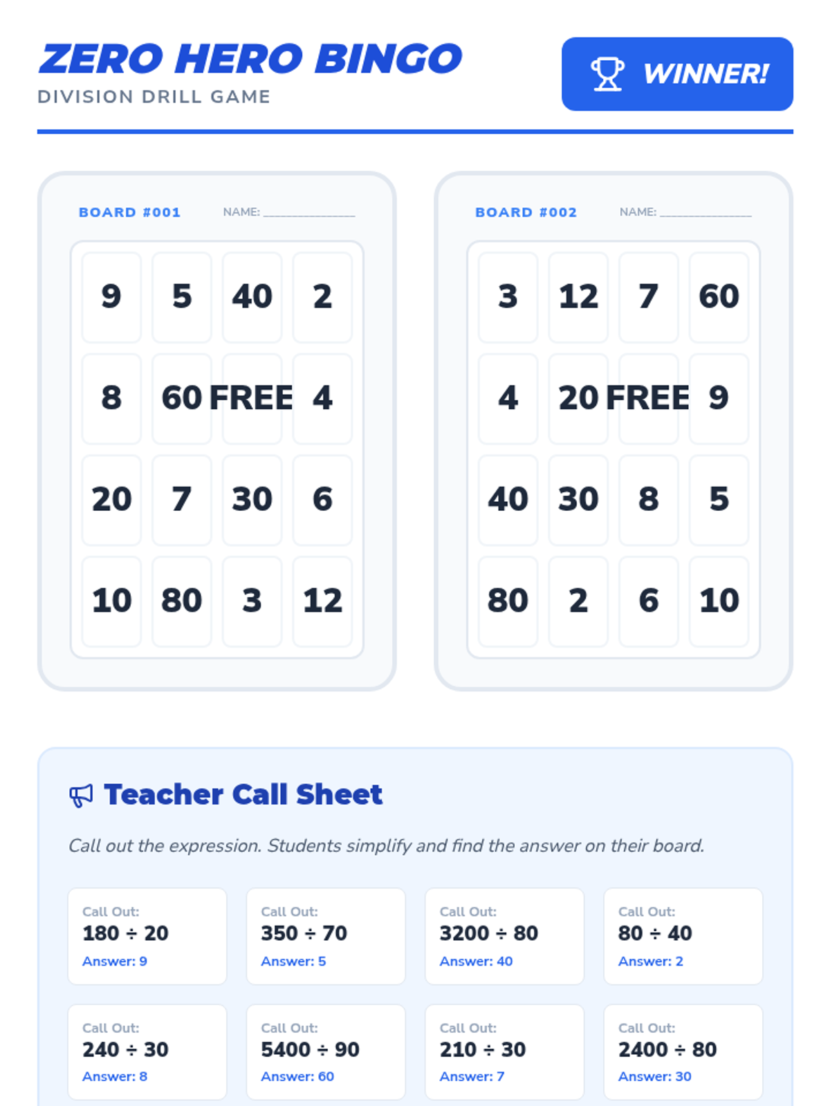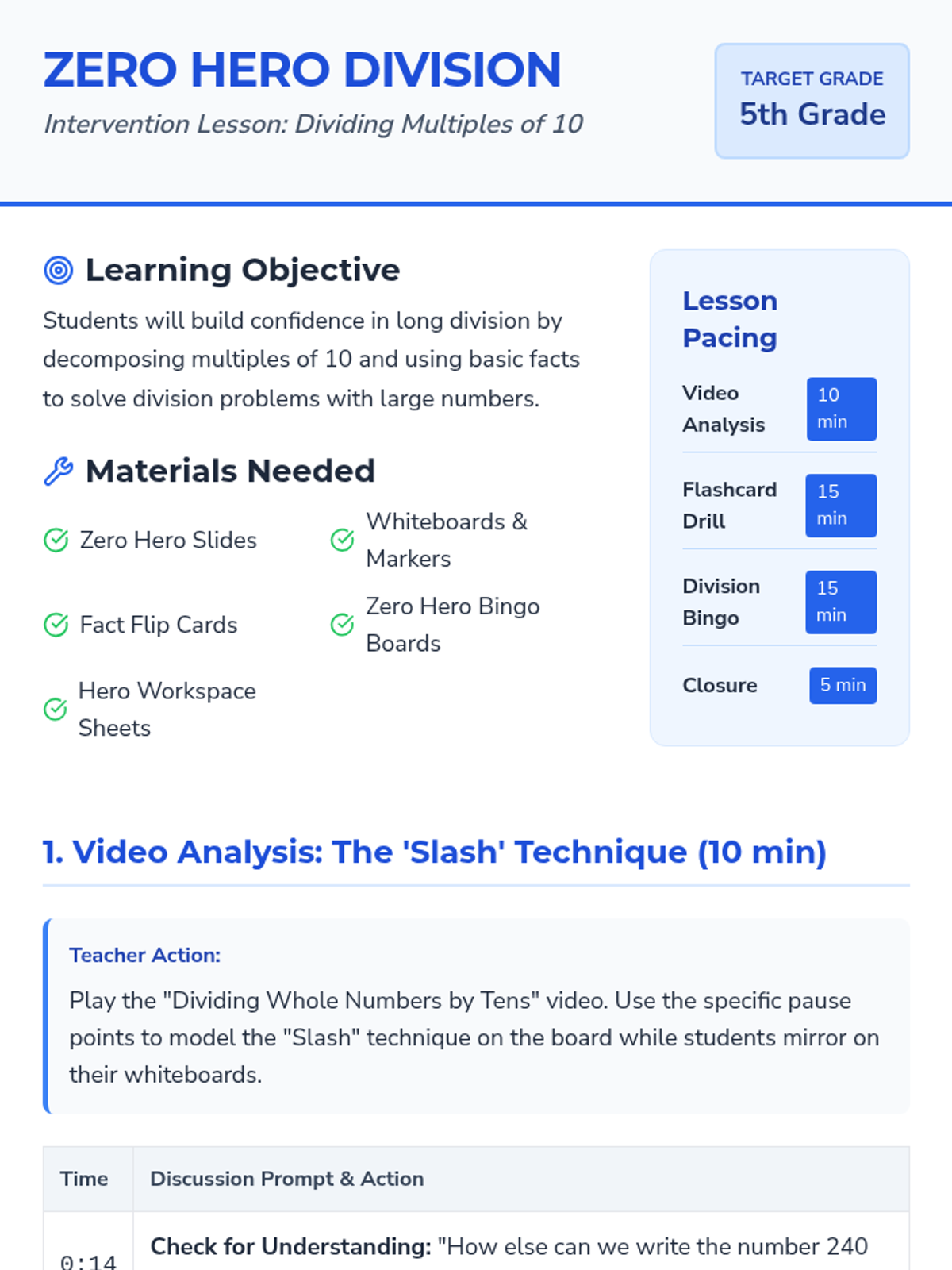 A targeted intervention lesson for 5th graders to master dividing multiples of 10 by simplifying to basic facts using the 'canceling zeros' strategy.