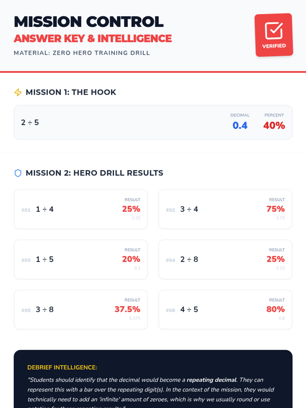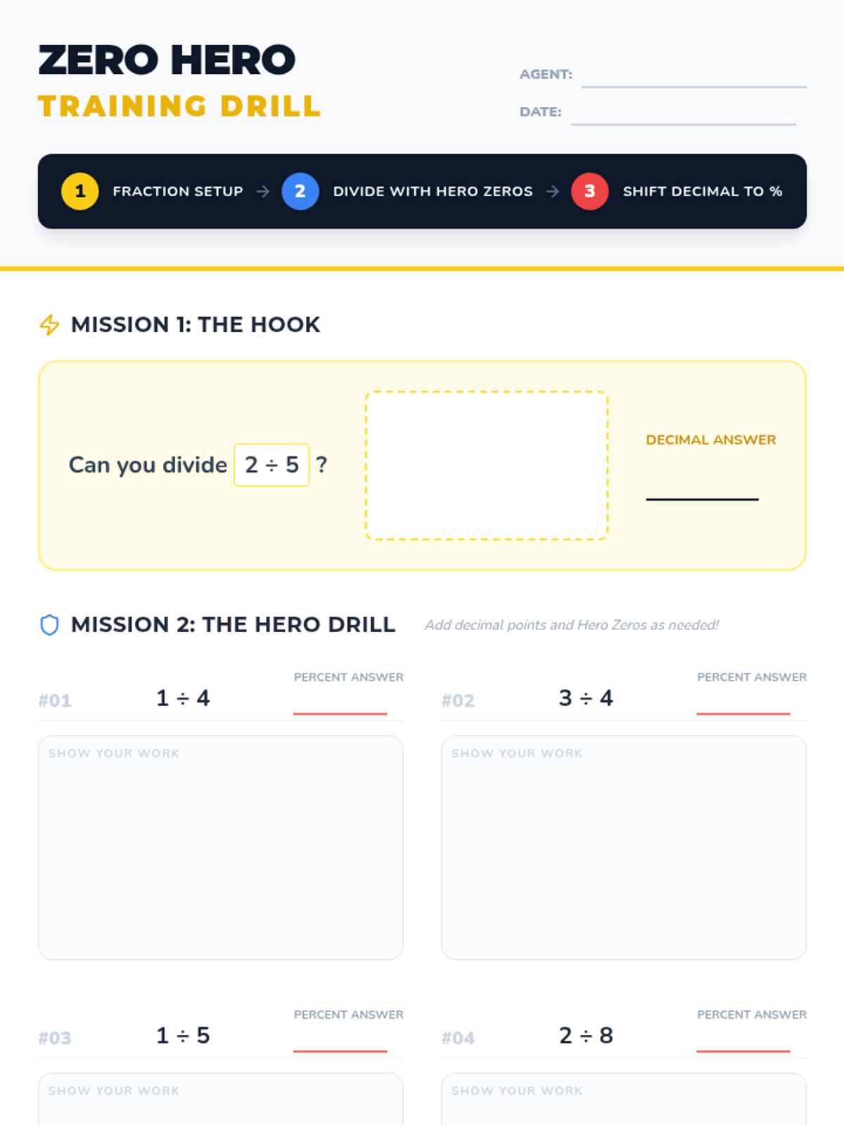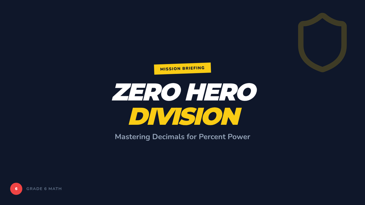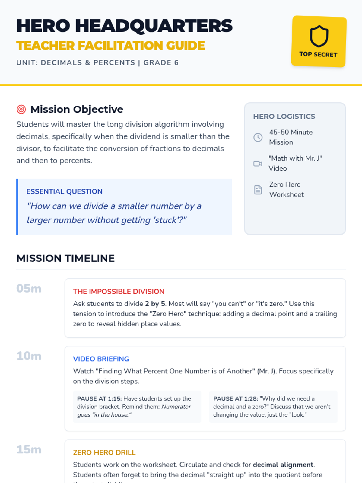 A 6th-grade math lesson focusing on the long division algorithm with decimals, specifically when the dividend is smaller than the divisor, as a bridge to calculating percents.