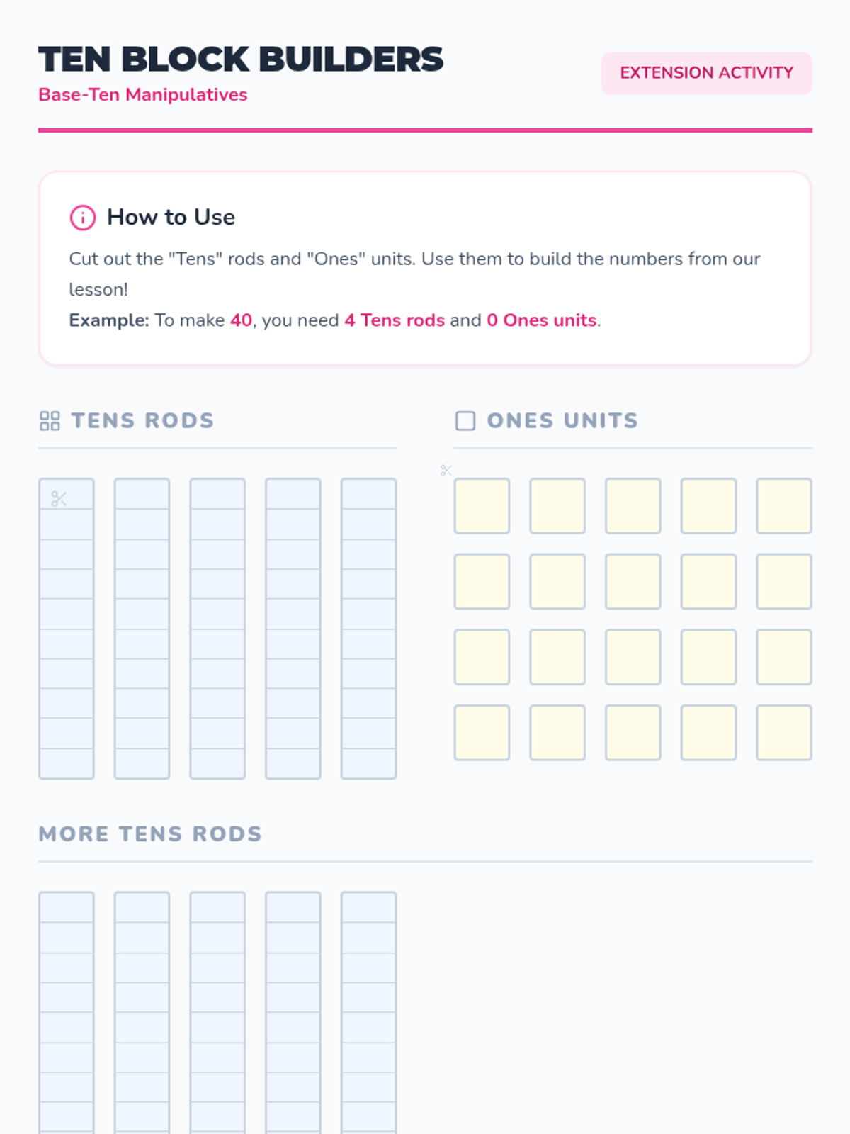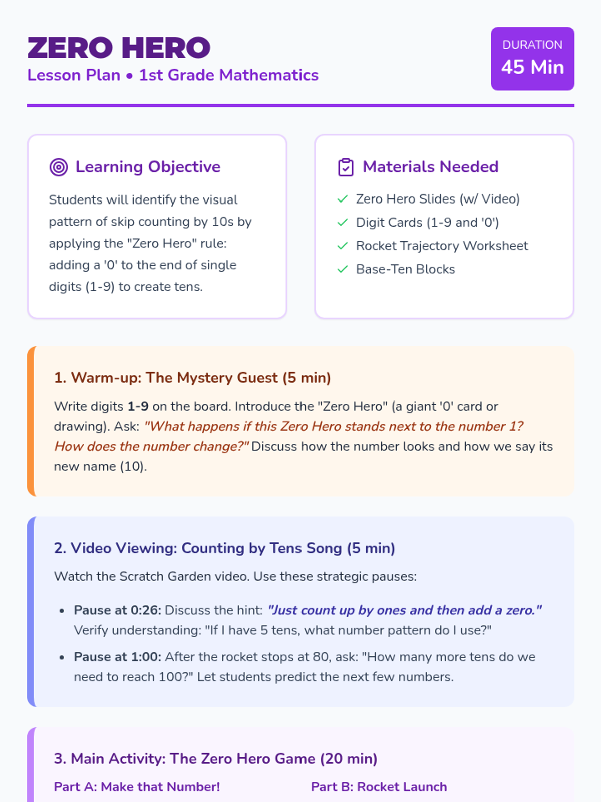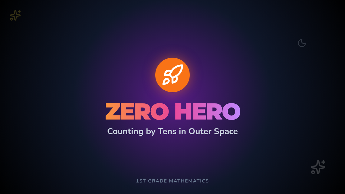 A fun, space-themed lesson for 1st graders to master skip counting by 10s using the 'Zero Hero' strategy of adding a zero to digits 1-9. Includes video analysis, hands-on digit card games, and a rocket-themed vertical number line activity.