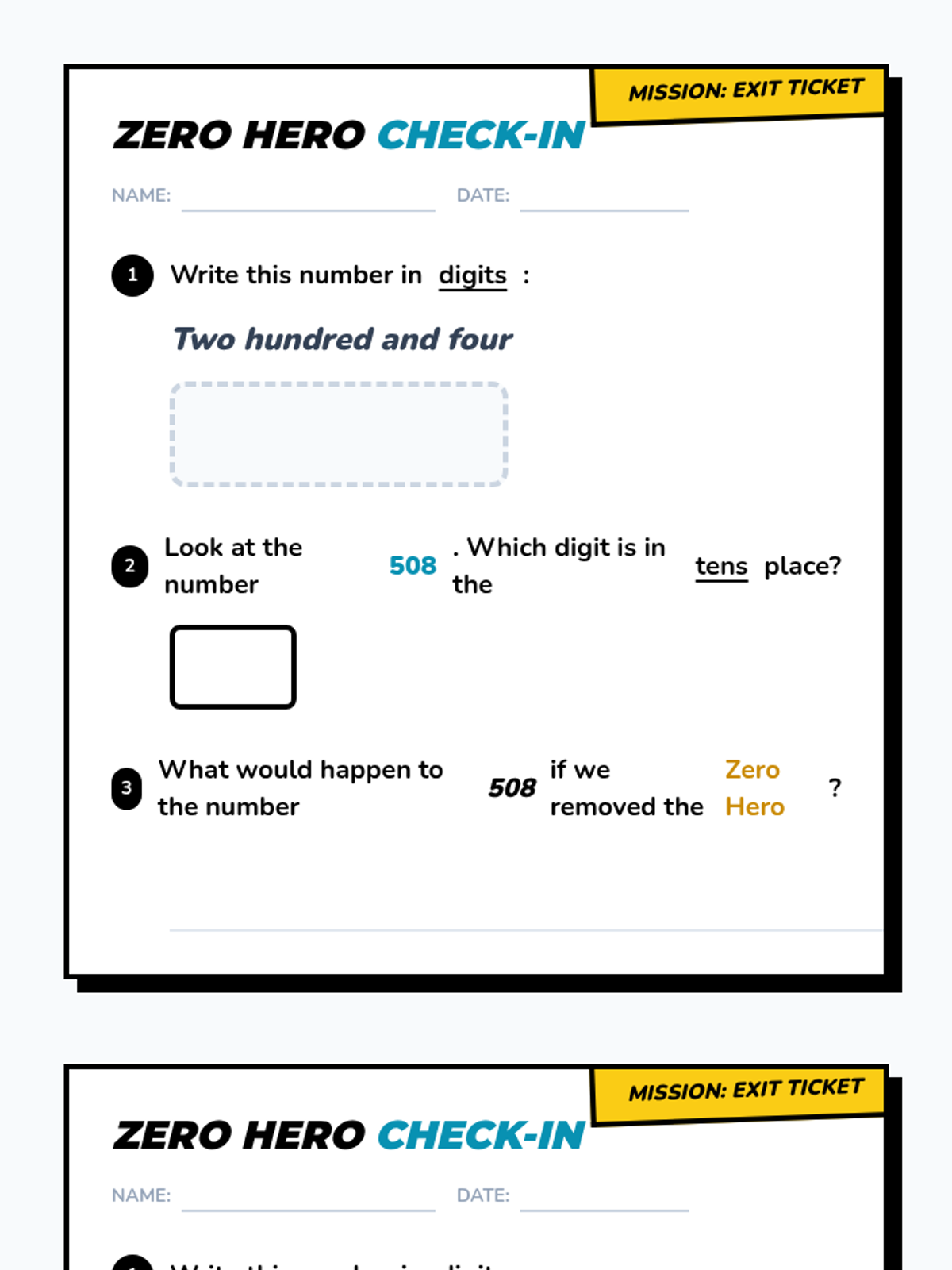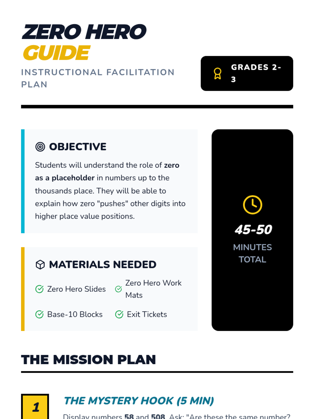 A math lesson for 2nd and 3rd grade students focusing on zero as a placeholder in place value, featuring a 'Zero Hero' theme to help students understand why 'nothing' can mean 'something' in a number.