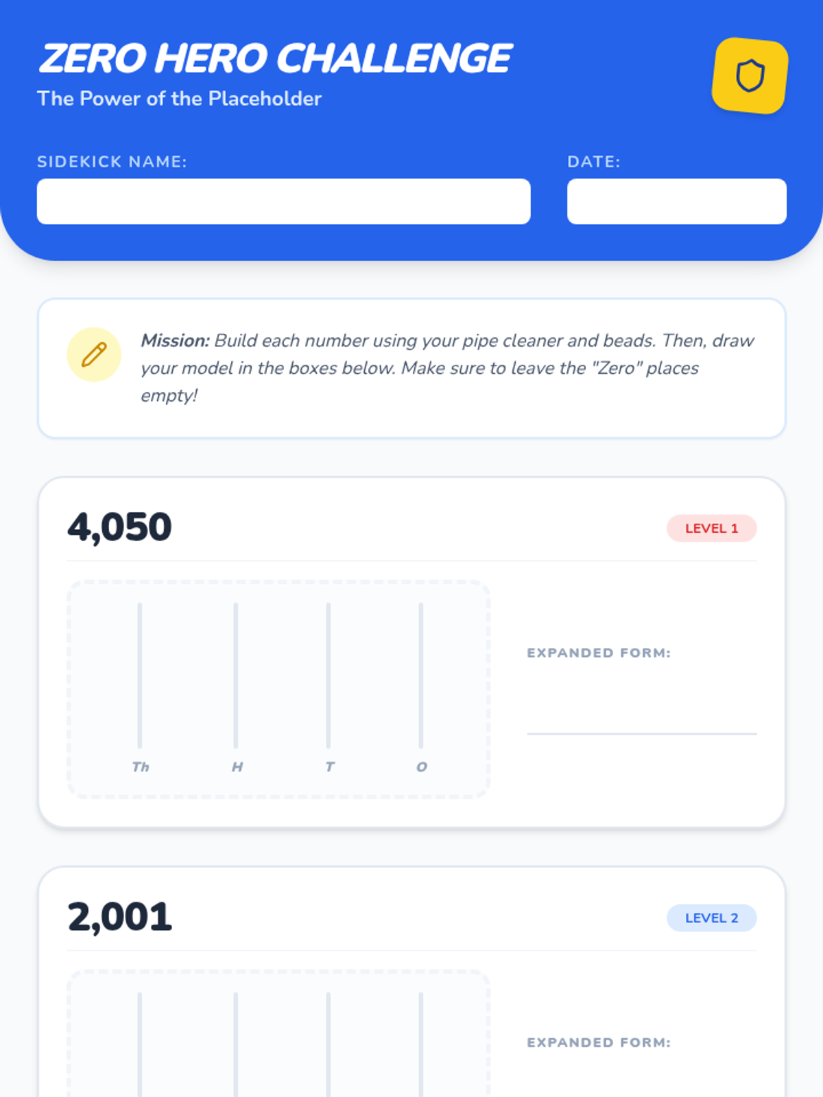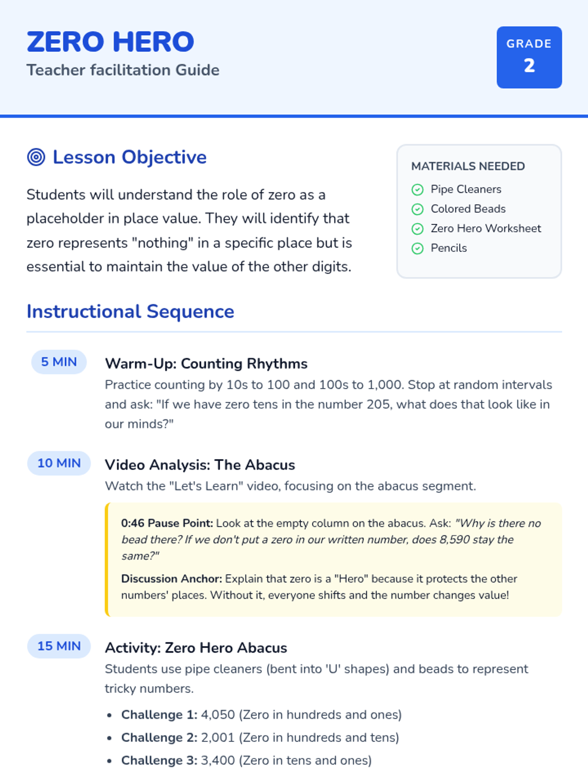 A 2nd-grade lesson focused on understanding zero as a placeholder in place value up to the thousands. Students will use physical models and a video exploration to see how zero 'holds the spot' for empty values.