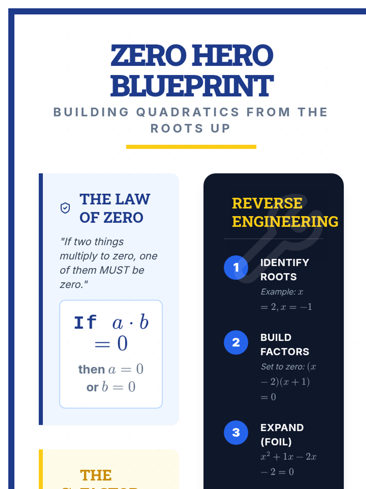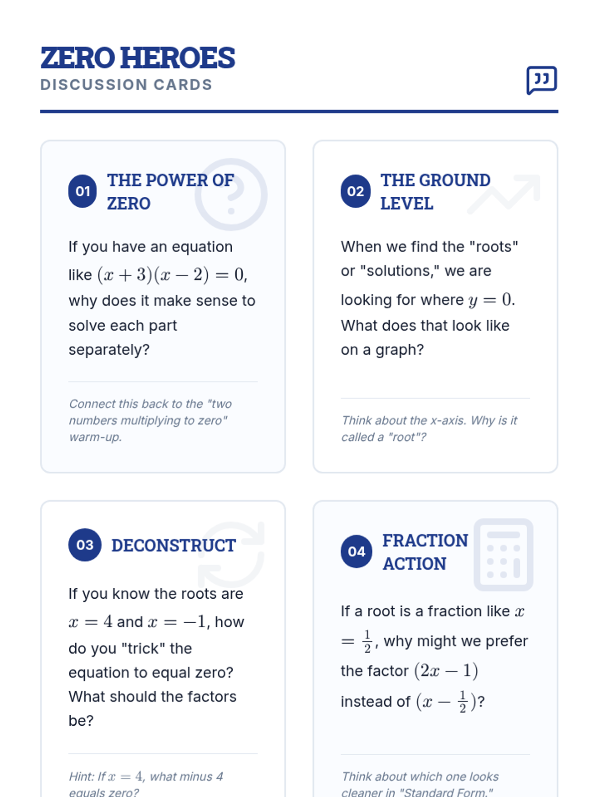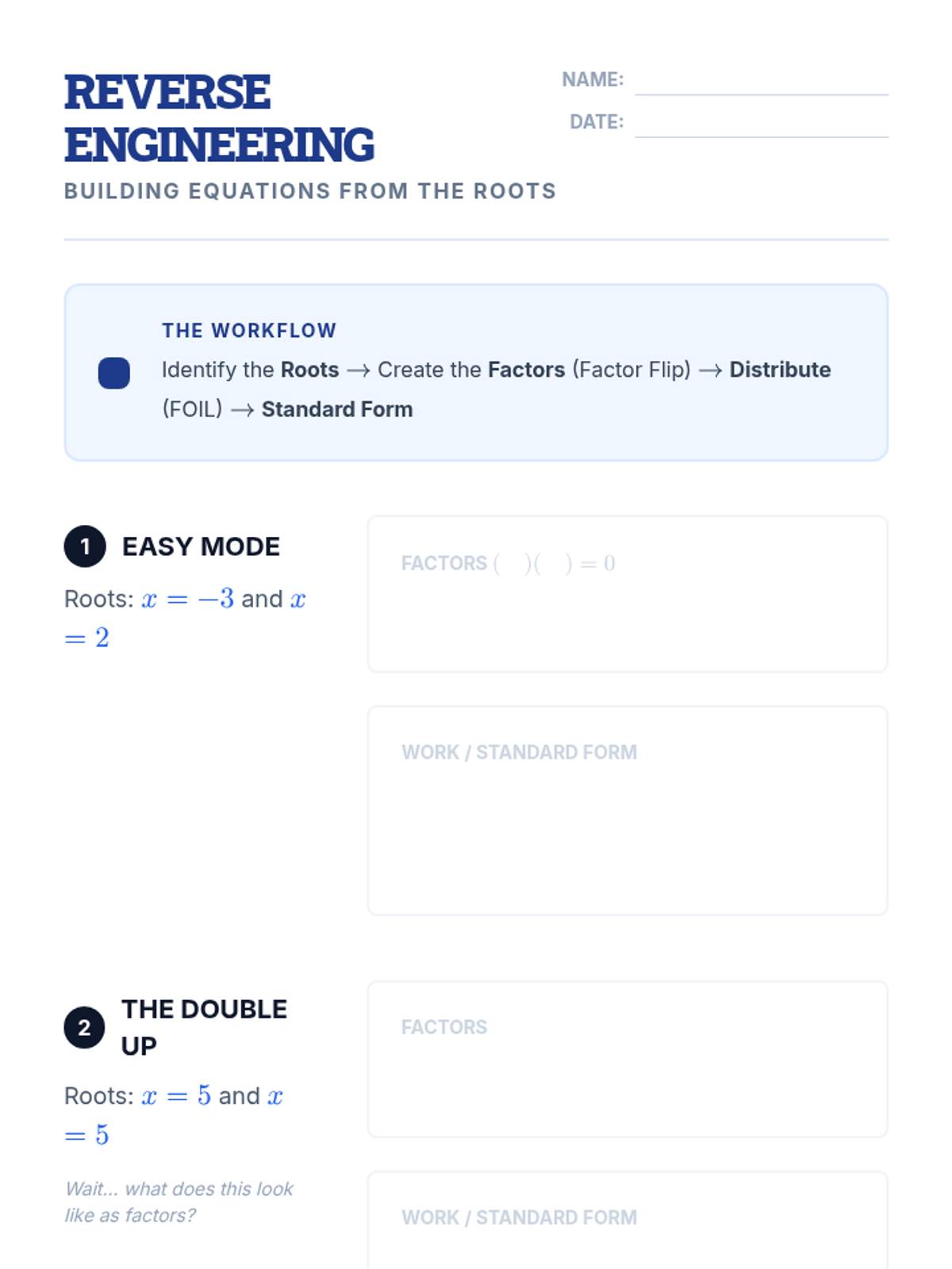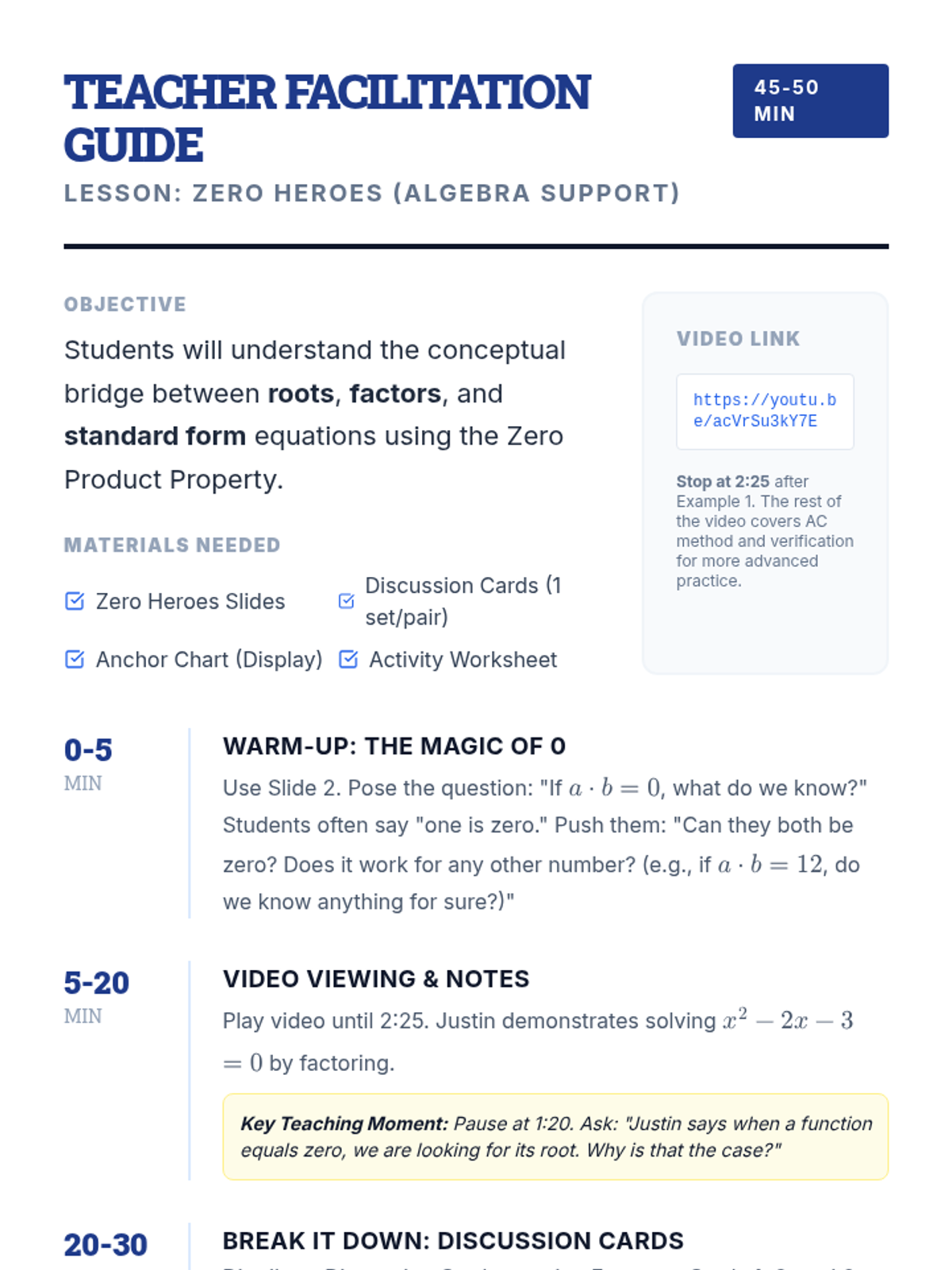 This lesson focuses on the Zero Product Property and the conceptual bridge between roots, factors, and standard form equations. Students will watch a targeted video segment, discuss the 'why' behind setting equations to zero, and engage in a 'Reverse Engineering' activity to build quadratics from their roots.