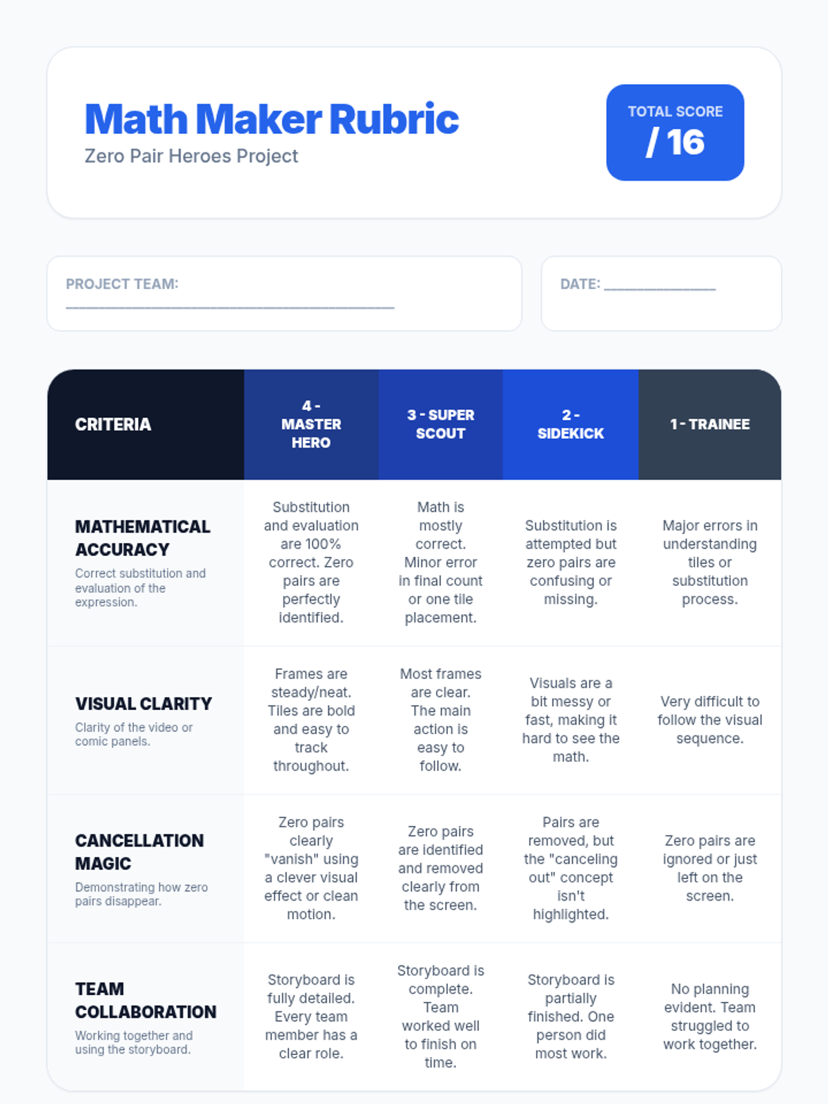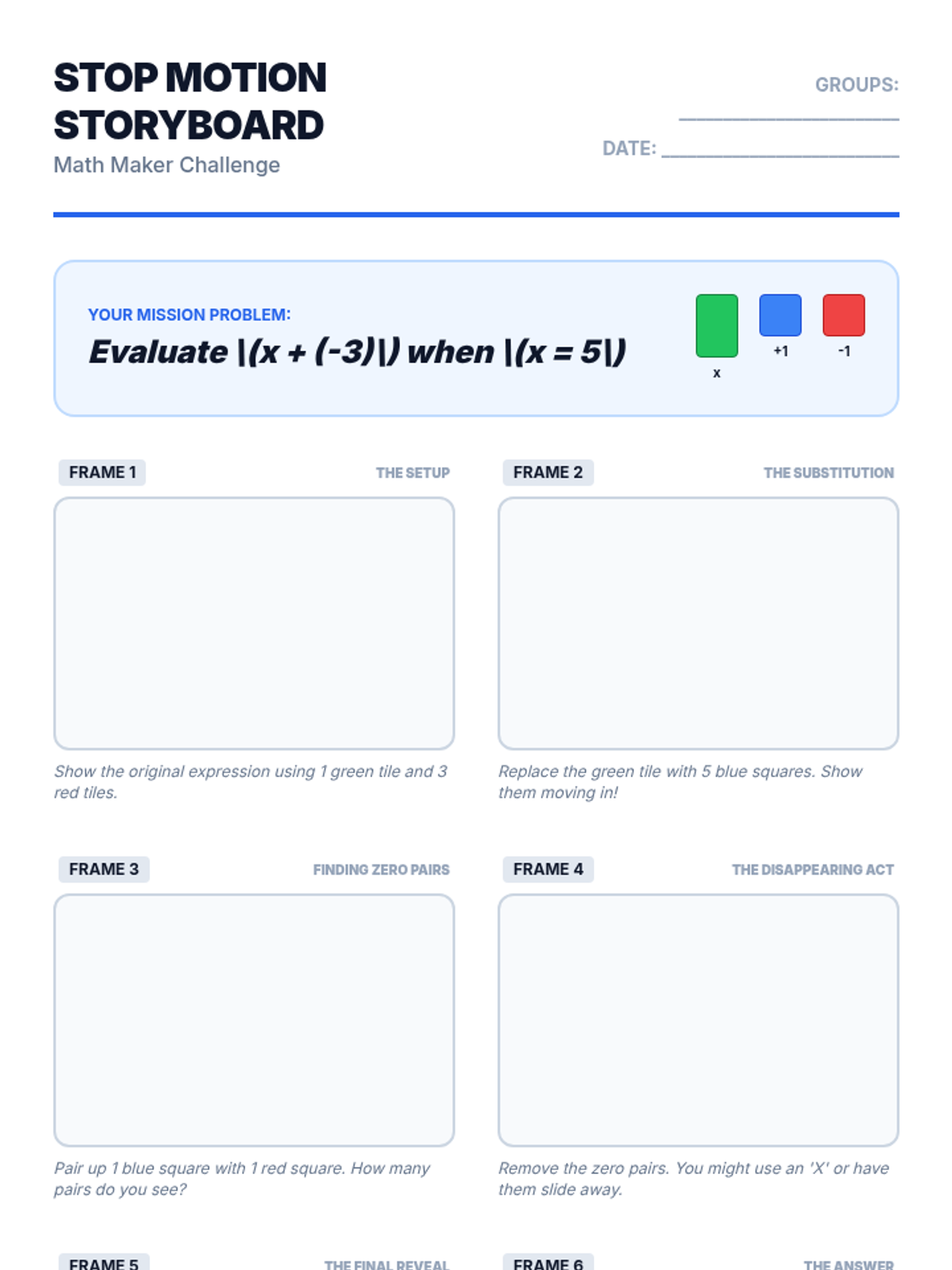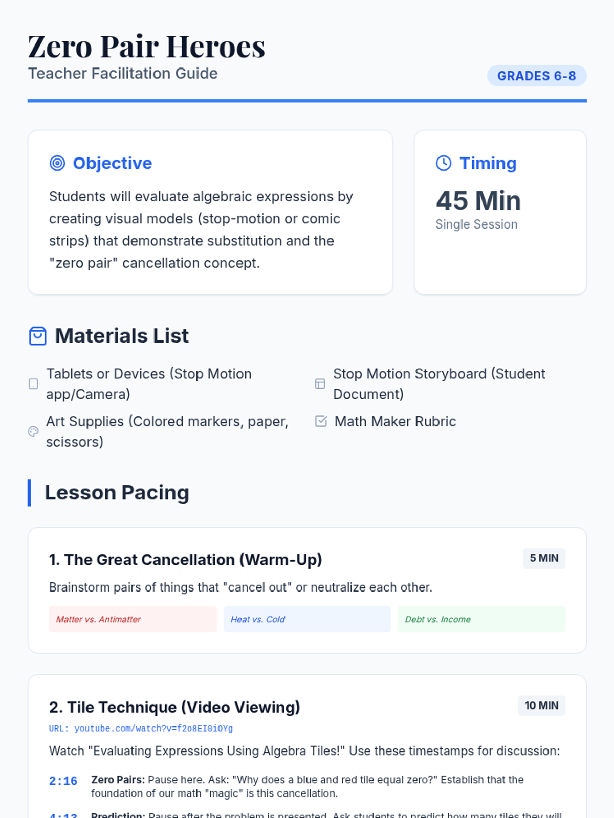 A creative math lesson where students use the concept of zero pairs and substitution to animate or illustrate algebraic expressions, inspired by algebra tiles.