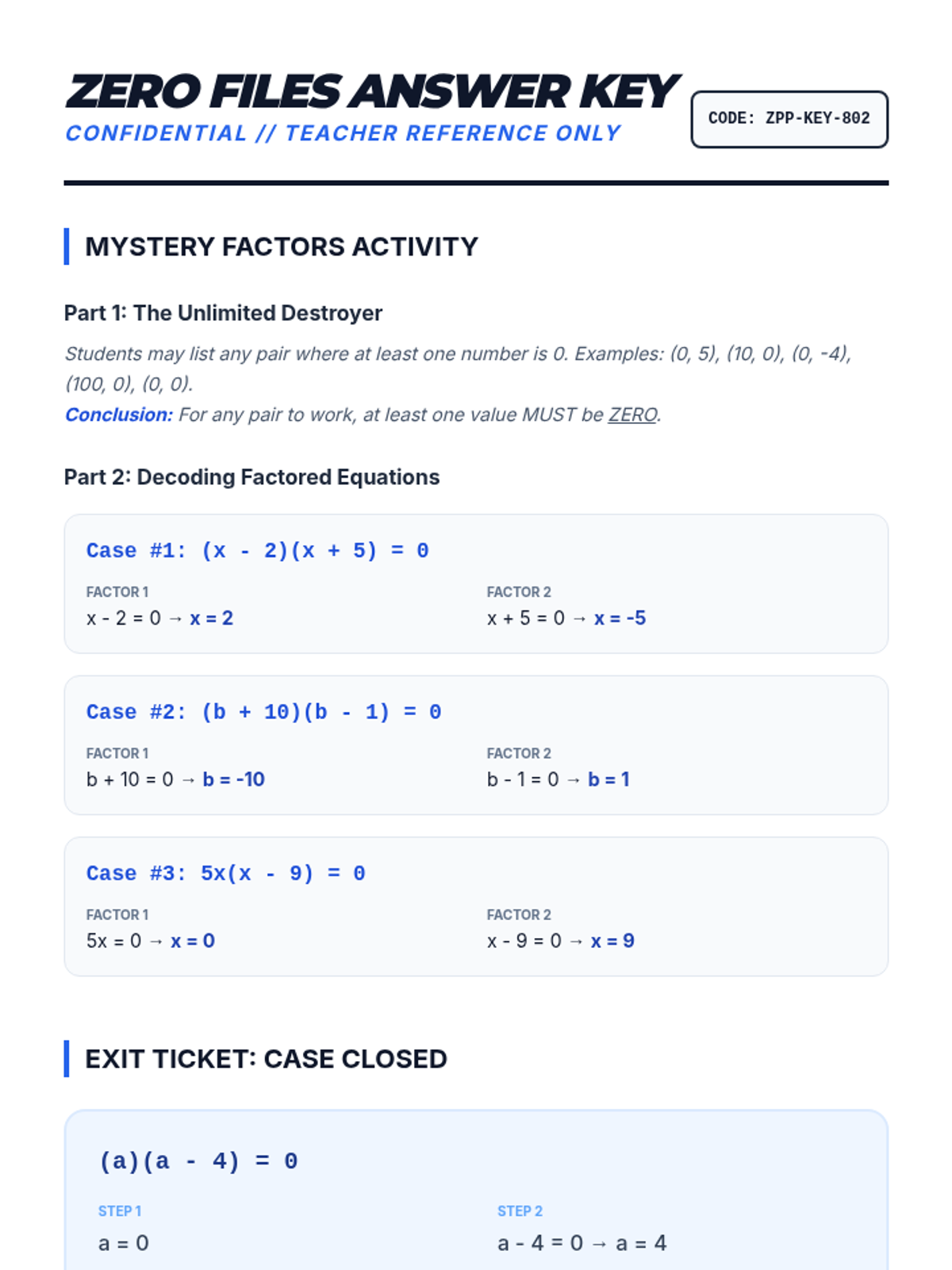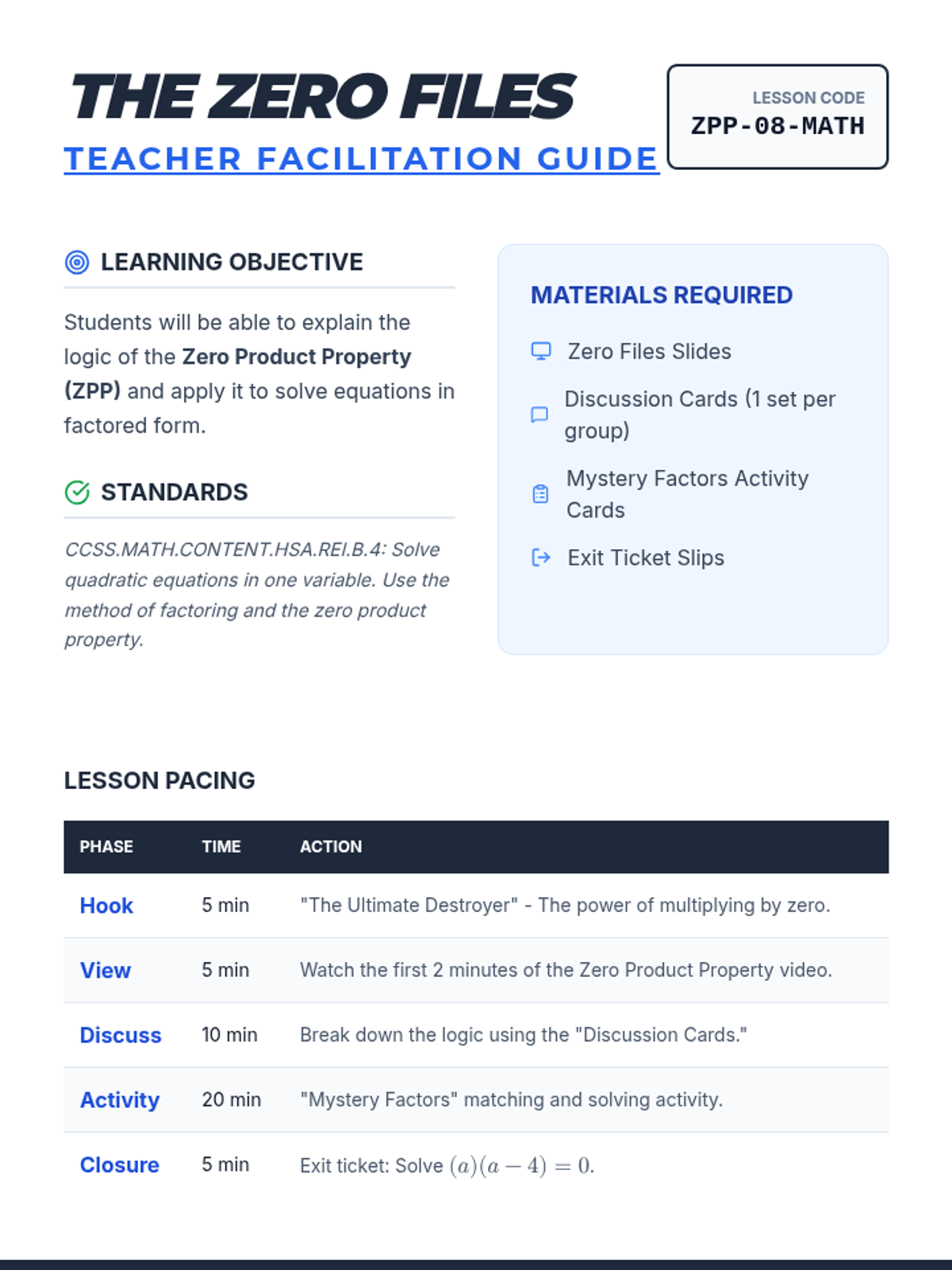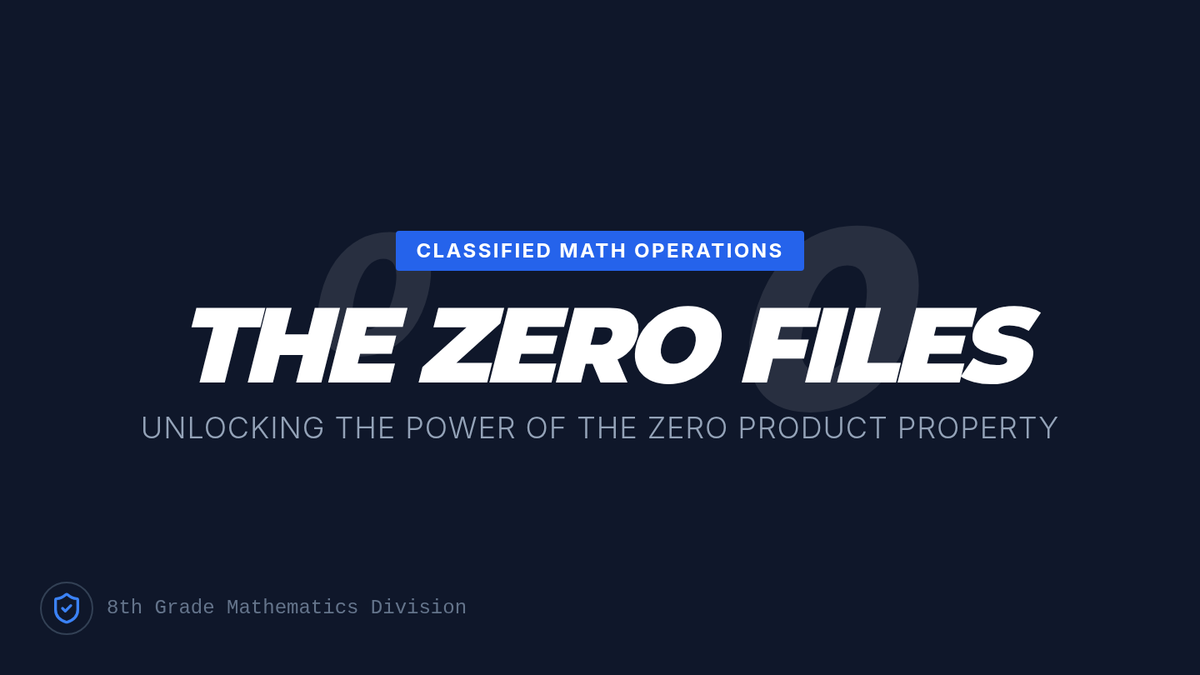 A comprehensive lesson on the Zero Product Property for 8th Grade Math, featuring a 'Zero Files' detective theme. Students explore why multiplying by zero results in zero and apply this logic to solving factored quadratic equations.