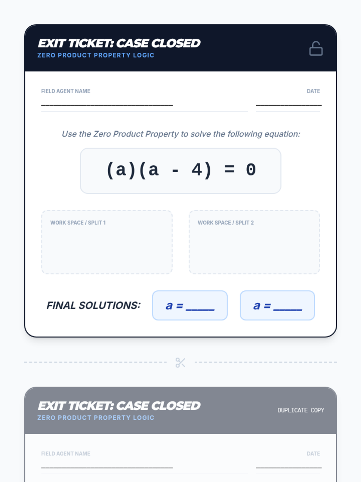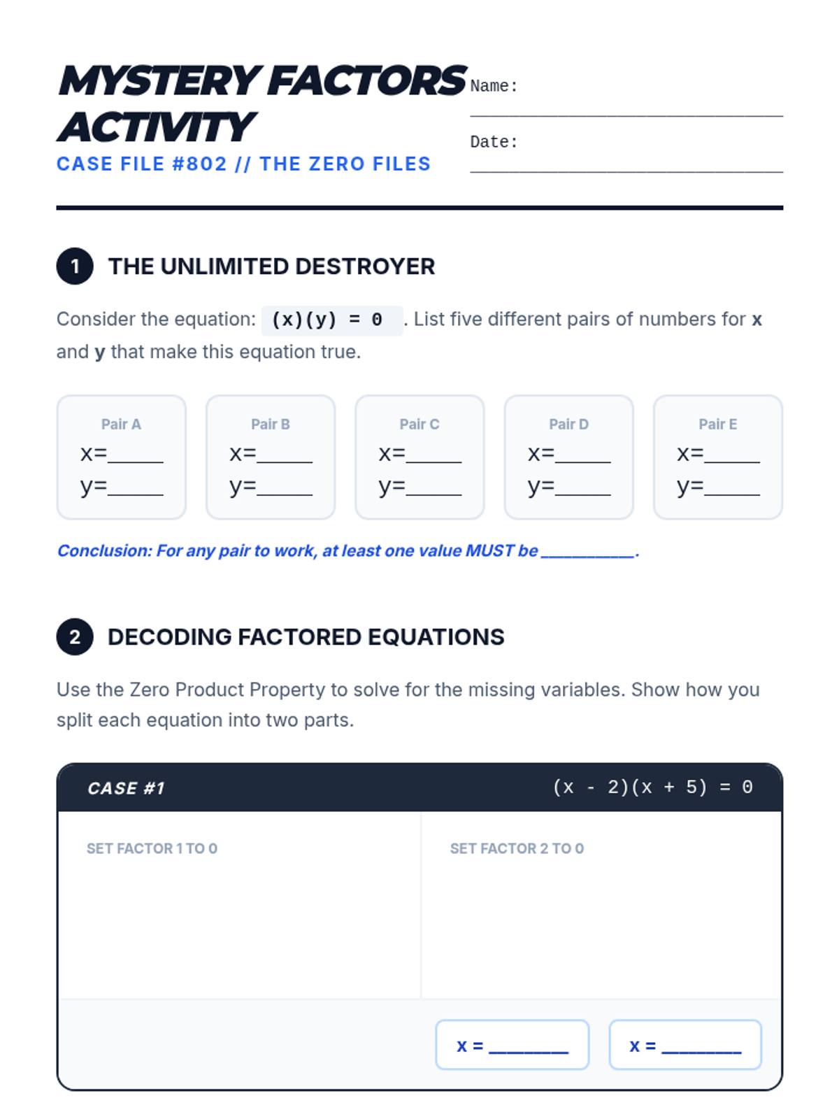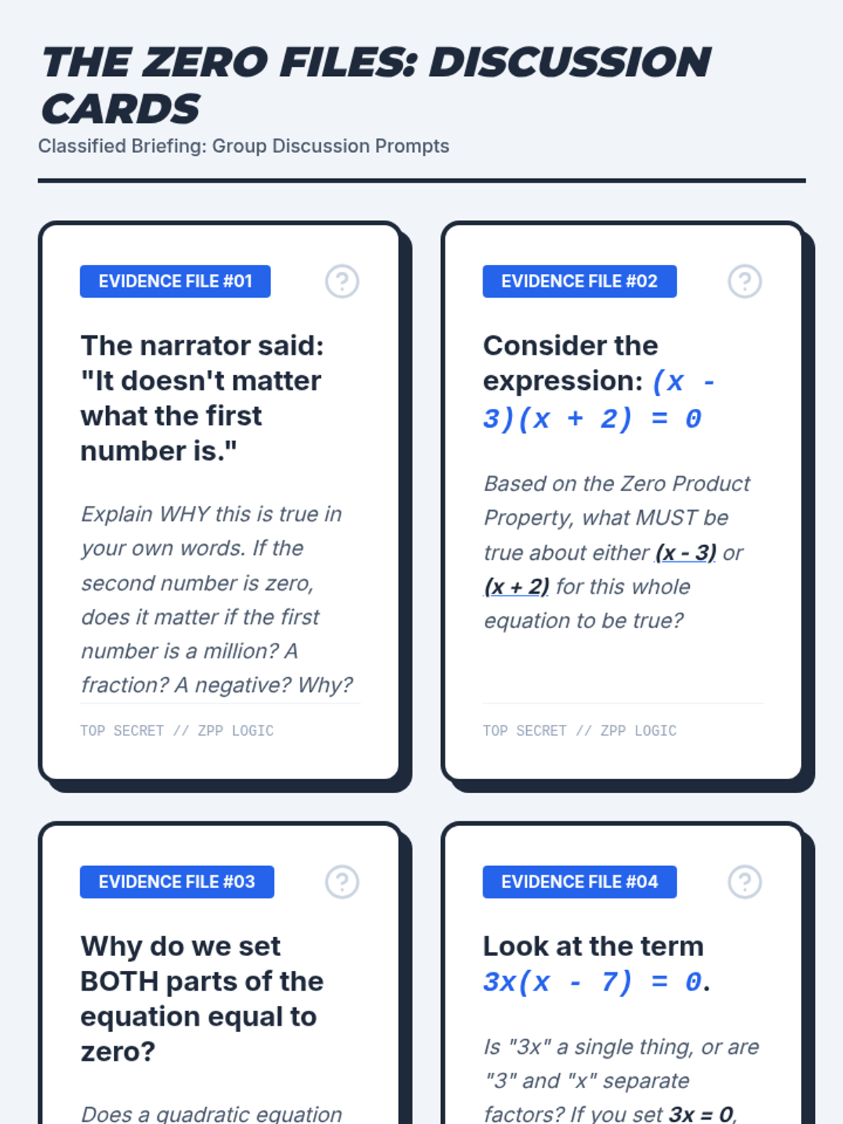 A comprehensive lesson on the Zero Product Property for 8th Grade Math, featuring a 'Zero Files' detective theme. Students explore why multiplying by zero results in zero and apply this logic to solving factored quadratic equations.