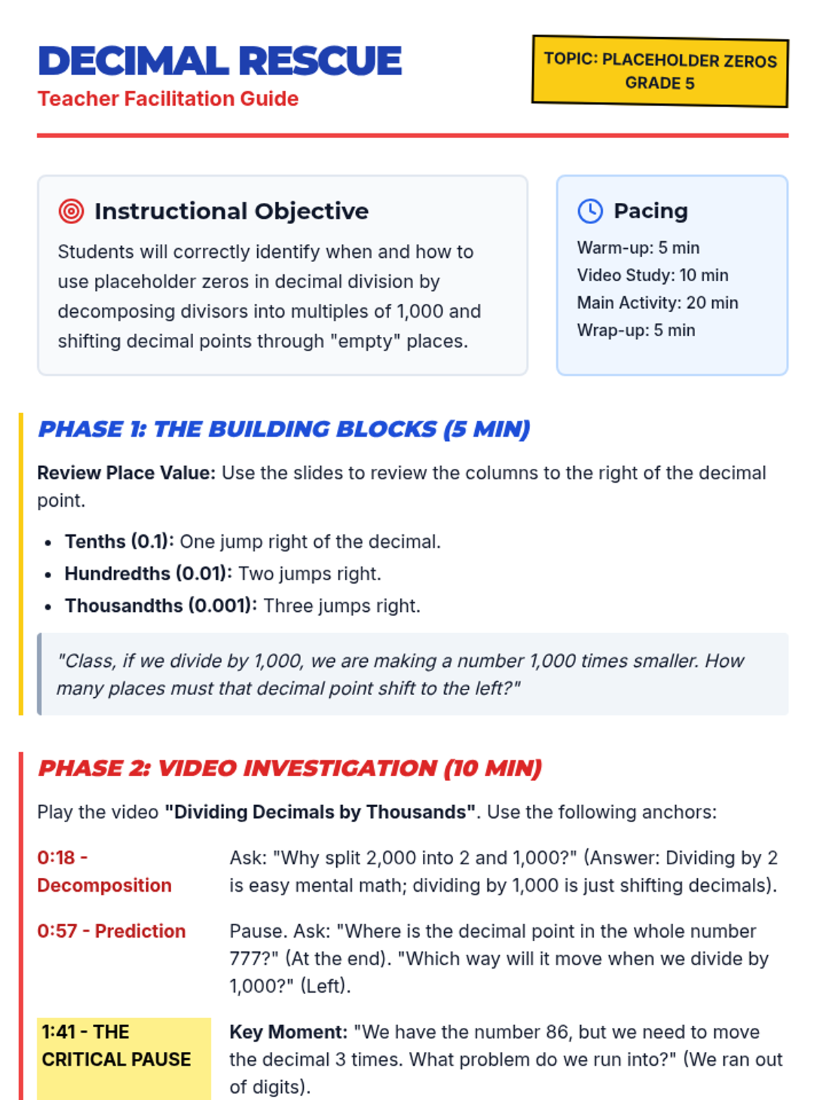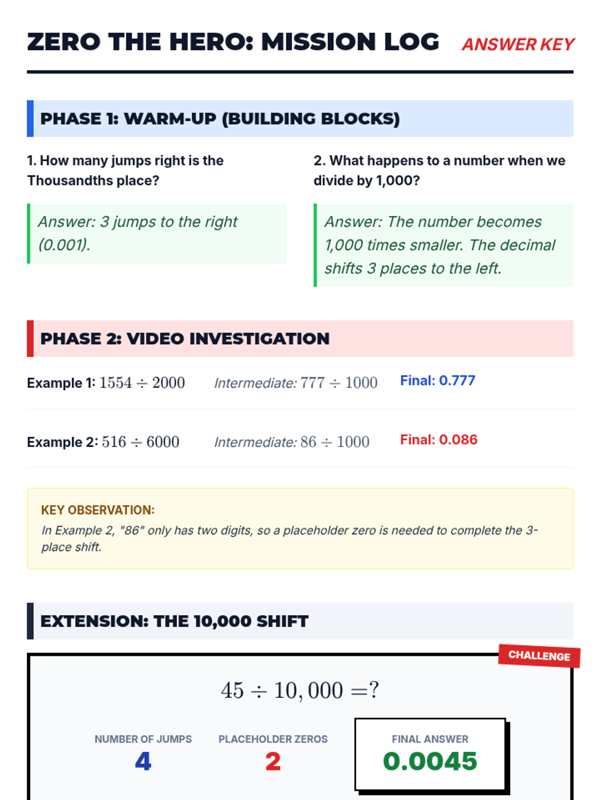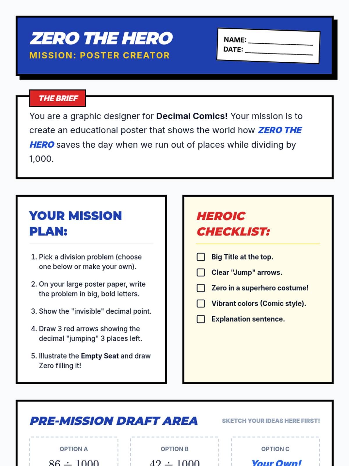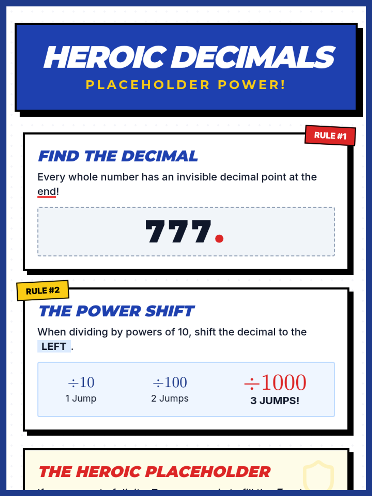 A 5th-grade lesson on using placeholder zeros when dividing decimals by powers of ten, featuring a superhero-themed art project and interactive video analysis.