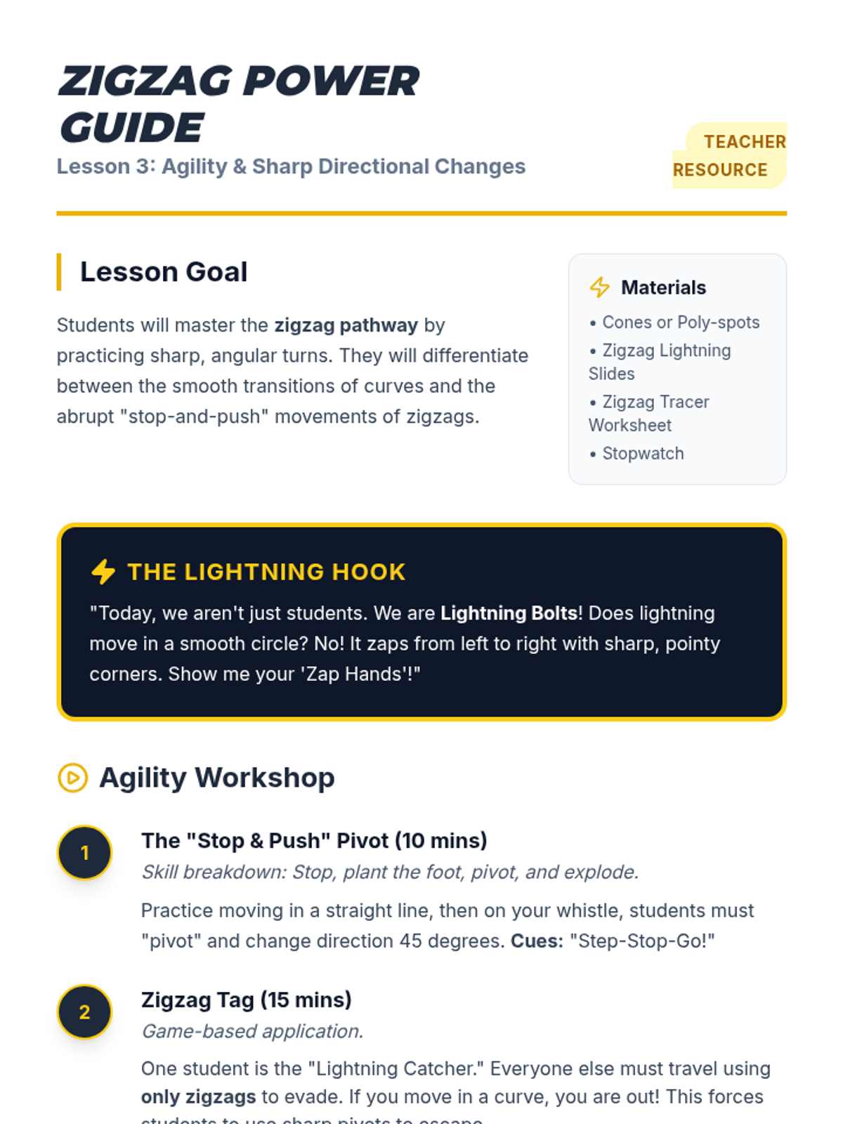 Focuses on zigzag pathways and sharp directional changes through agility-based activities and tag games.