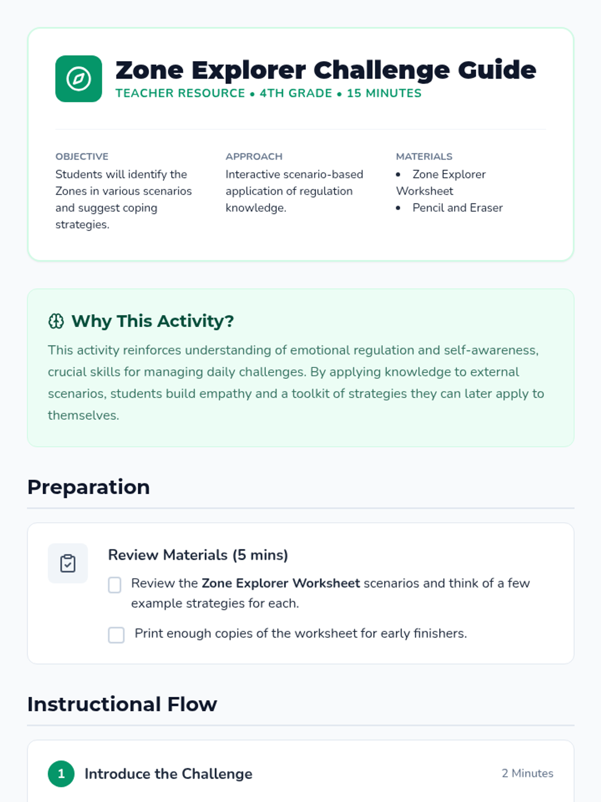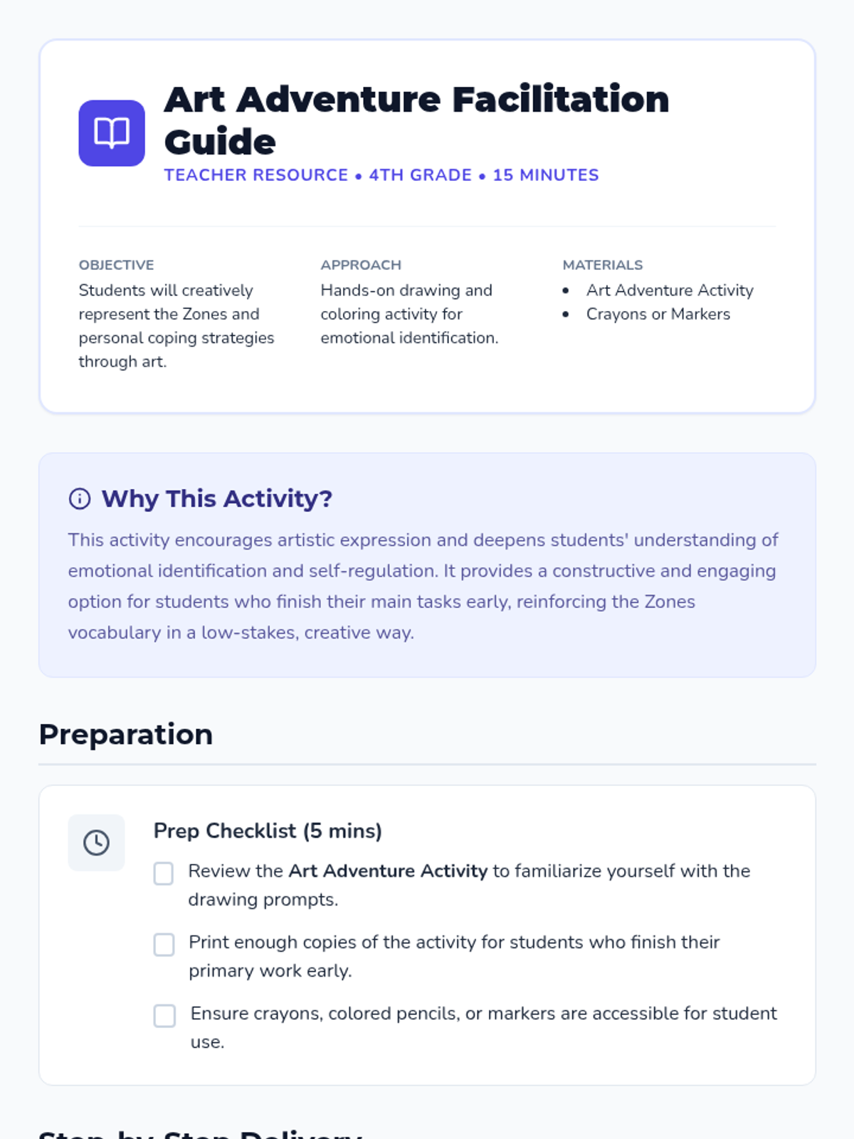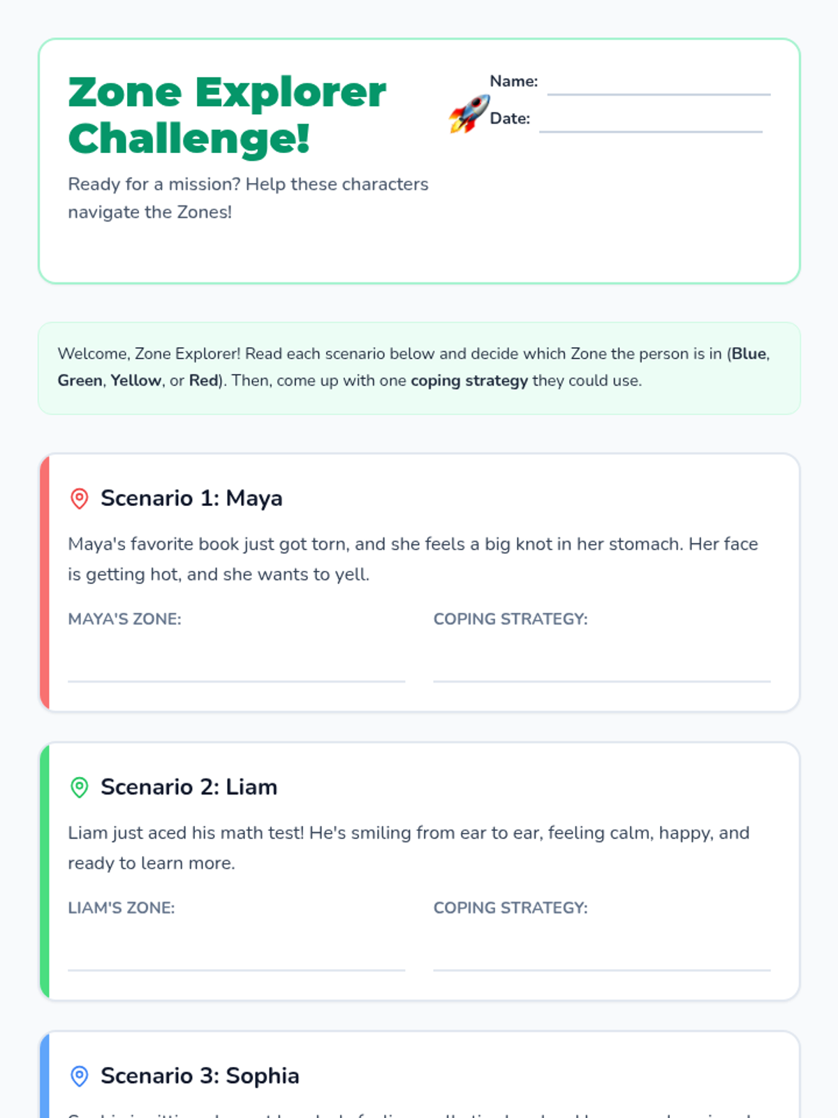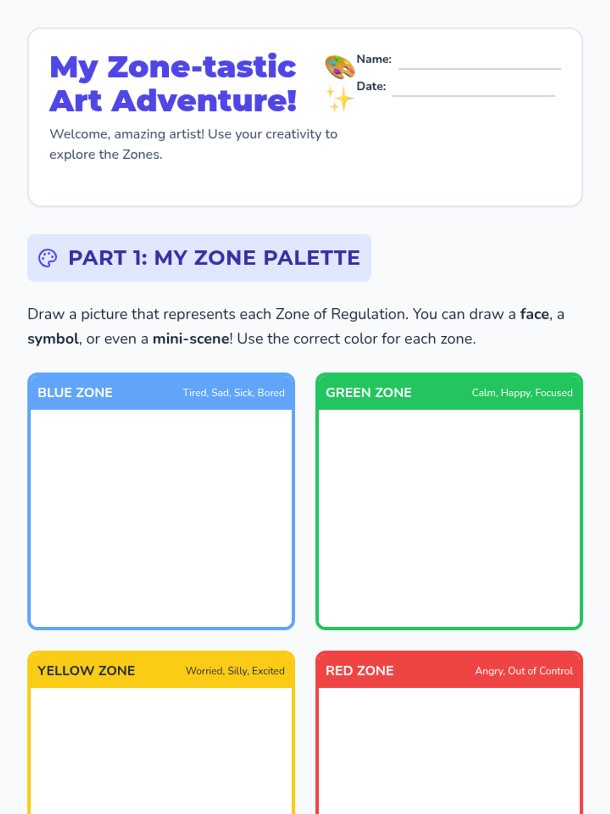 A vibrant pair of early-finisher activities for 4th graders to deepen their understanding of the Zones of Regulation through creative art and scenario-based problem solving.