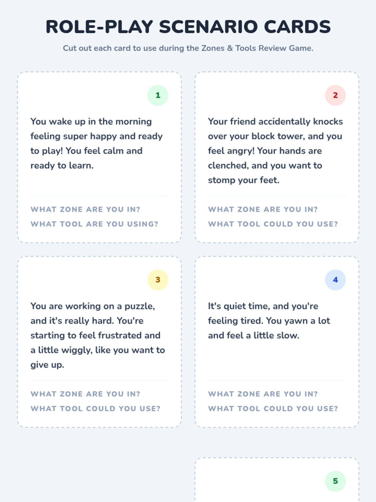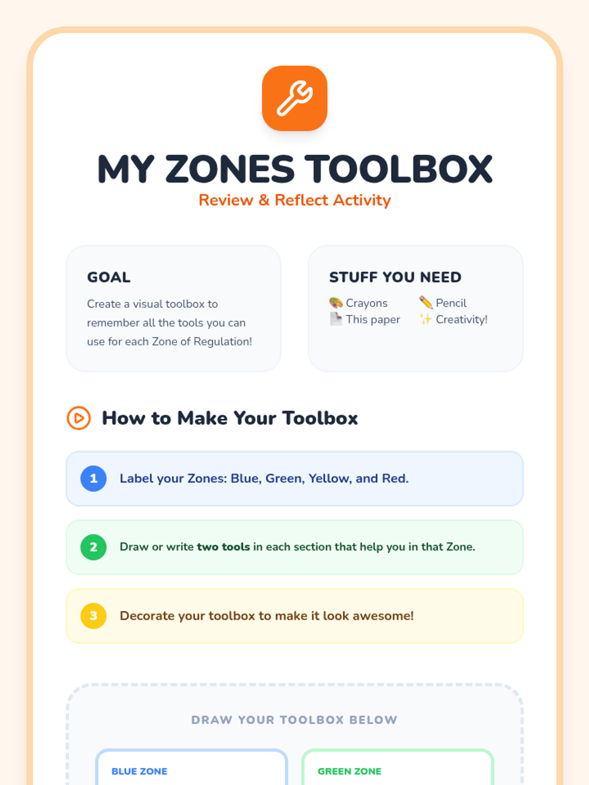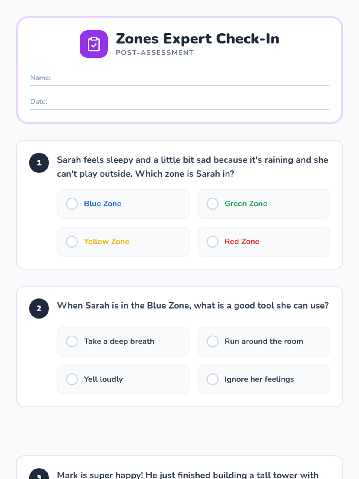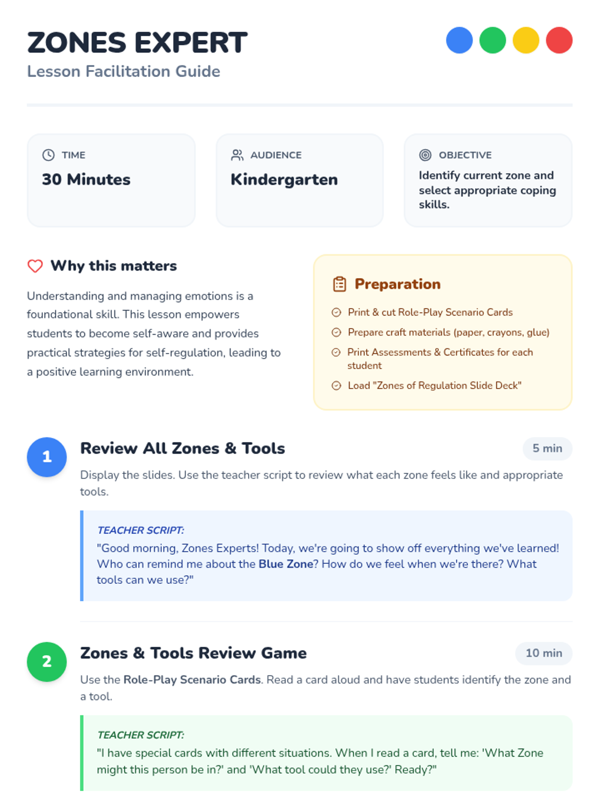A 30-minute Kindergarten lesson focused on solidifying understanding of the Zones of Regulation, identifying personal emotional states, and selecting appropriate coping strategies through interactive games and a celebratory craft.