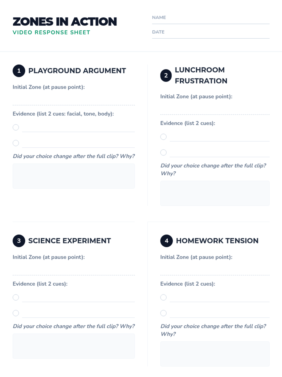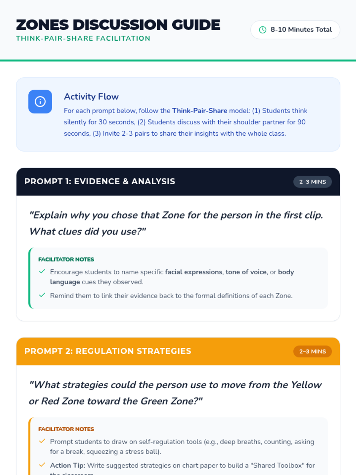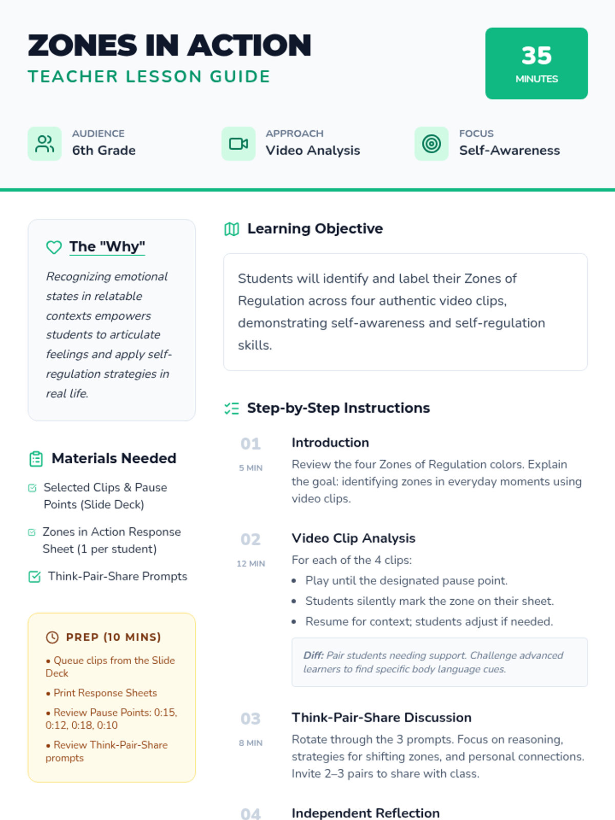 In this 35-minute Tier 1 lesson, 6th graders identify Zones of Regulation in authentic video clips to build self-awareness and self-regulation skills. Students use a video-based approach to connect emotional theory to everyday life through observation and peer discussion.