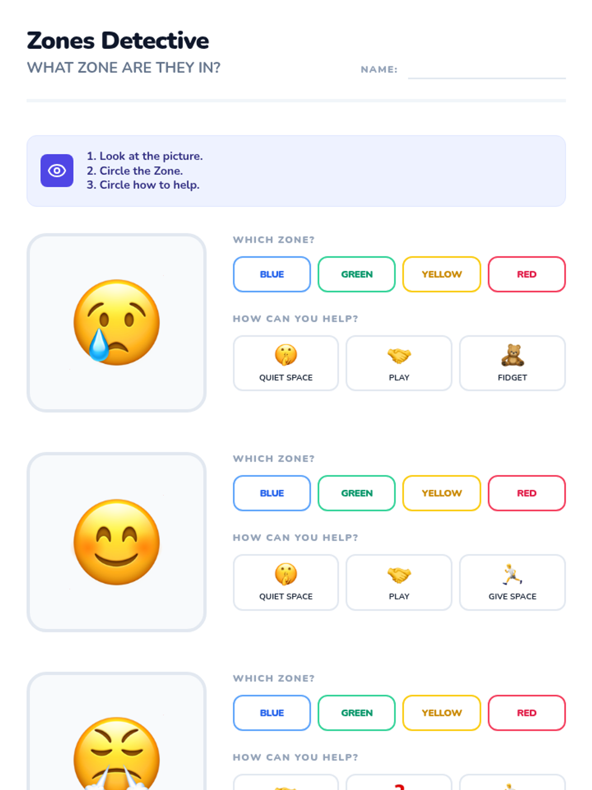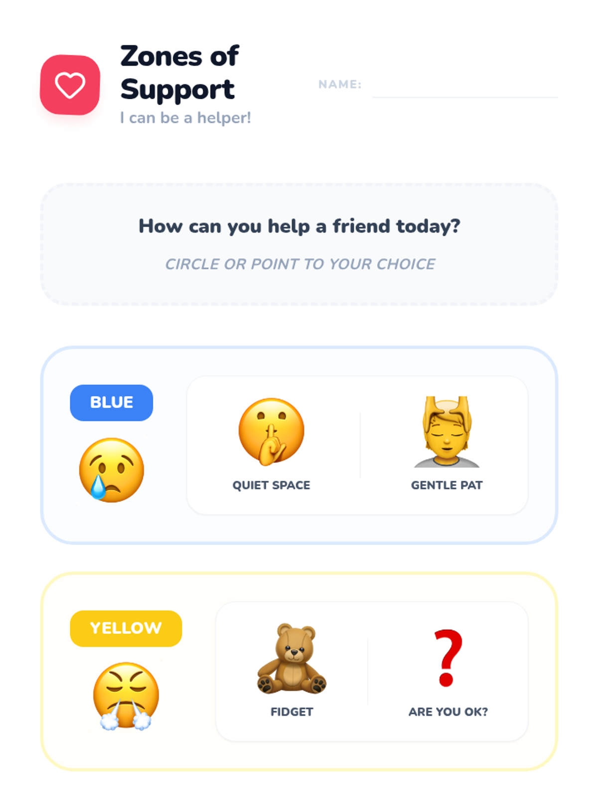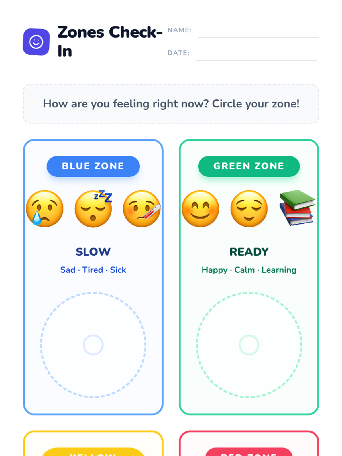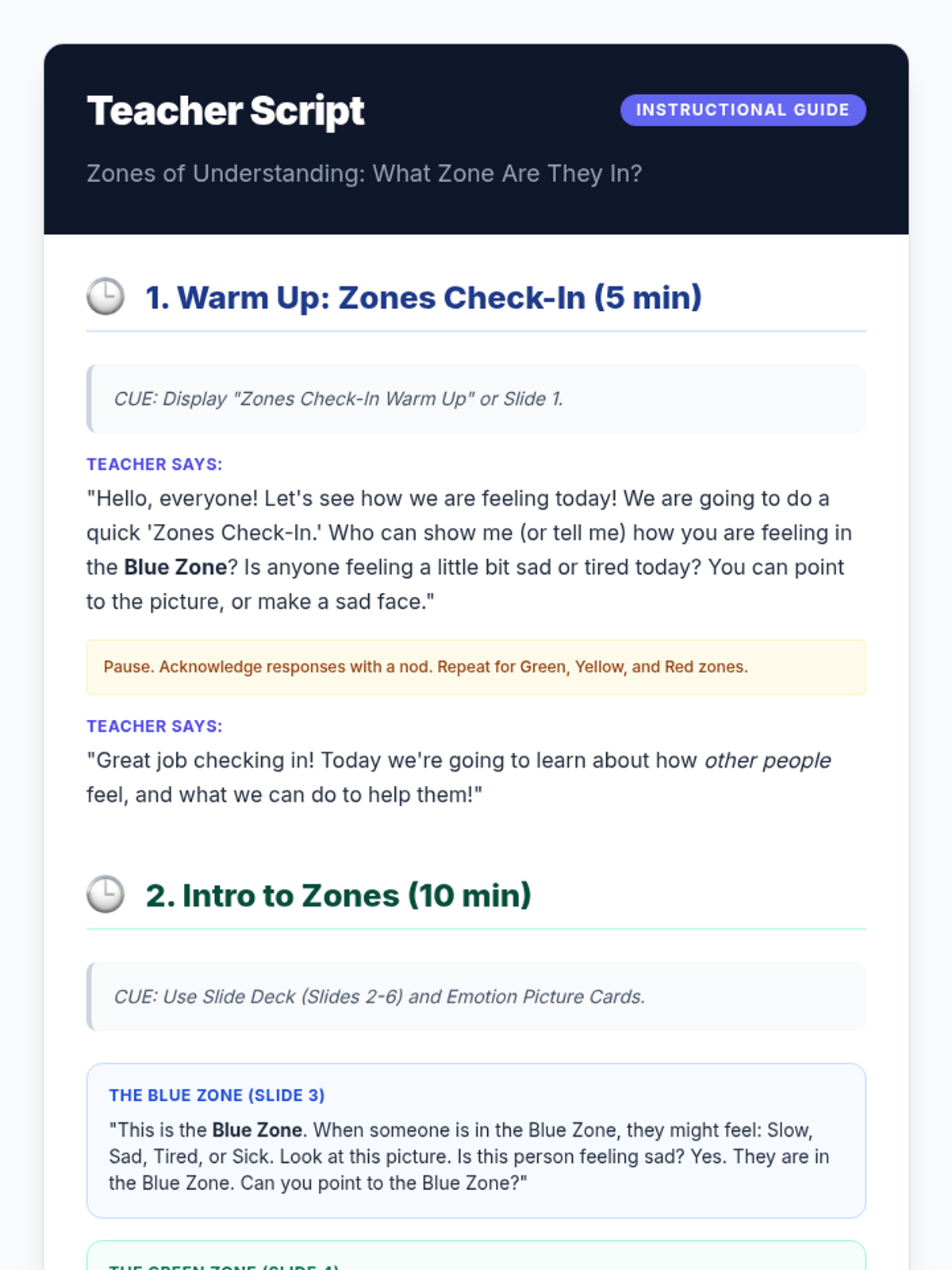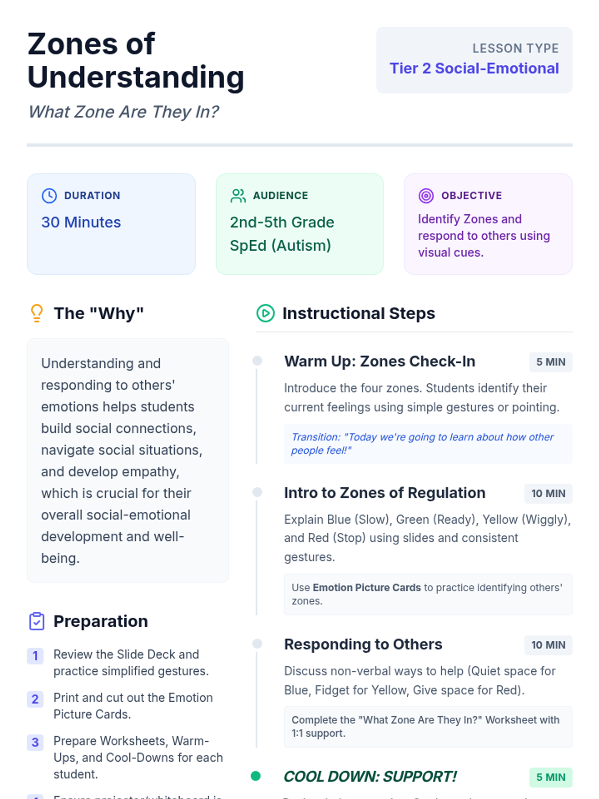 A small-group lesson introducing 2nd-5th grade special education students to the Zones of Regulation, focusing on identifying and responding to others' emotions through visual aids and simplified language.