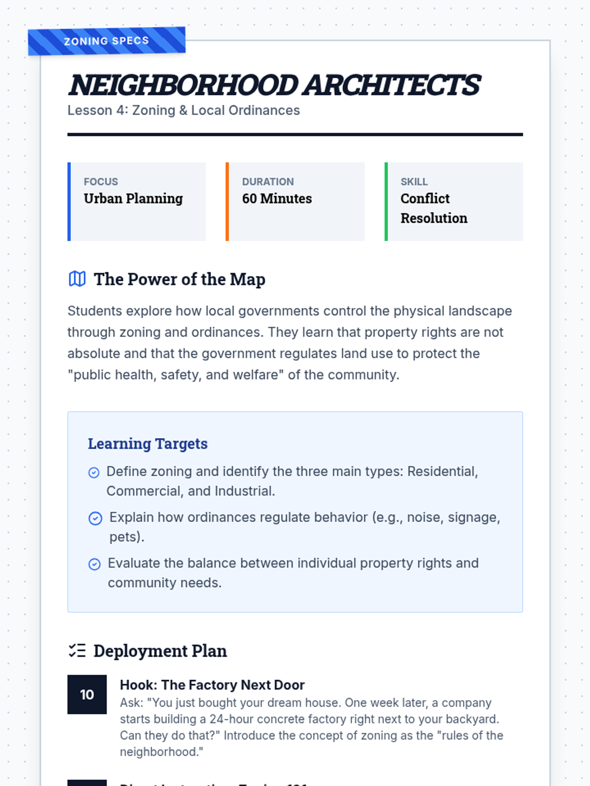 An exploration of zoning laws and local ordinances through a town planning project where students balance community needs and quality of life.