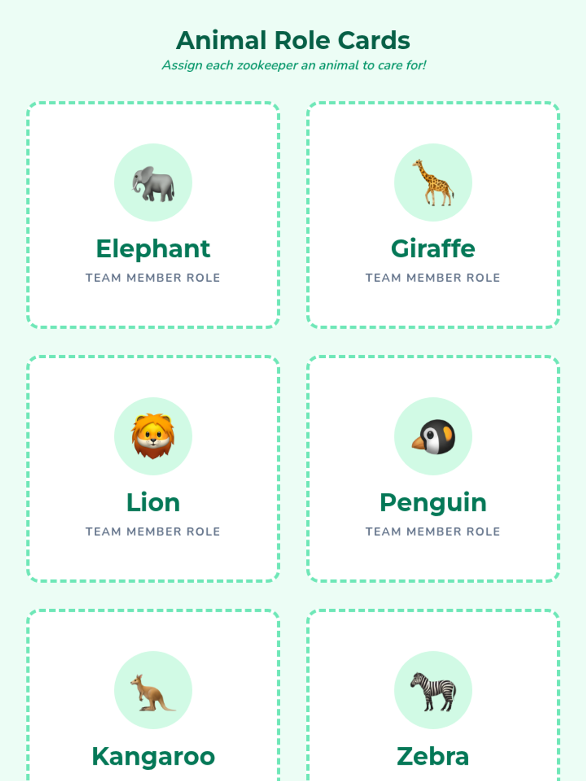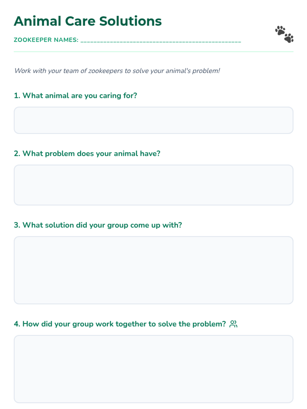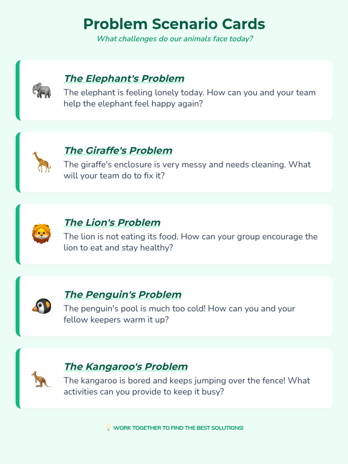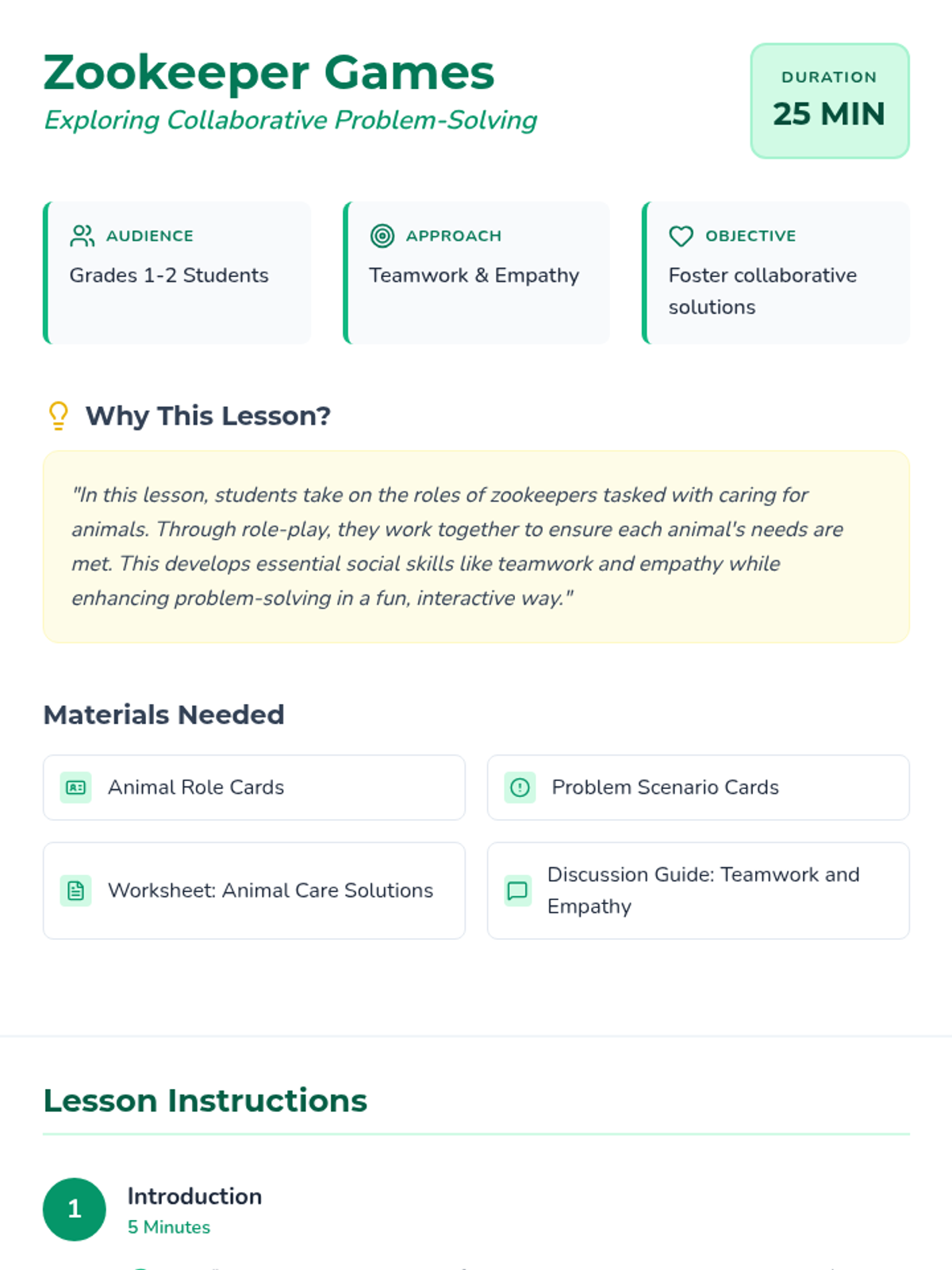 A collaborative role-playing lesson for Grades 1-2 where students work as zookeepers to solve animal care problems, fostering teamwork and empathy.