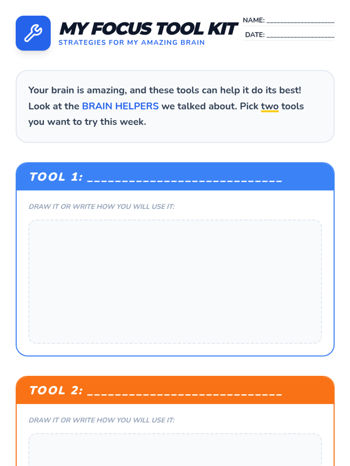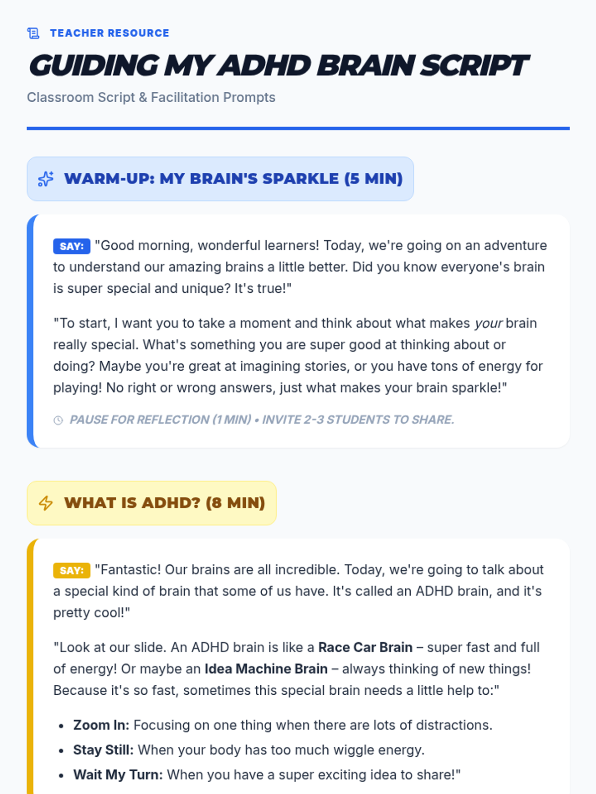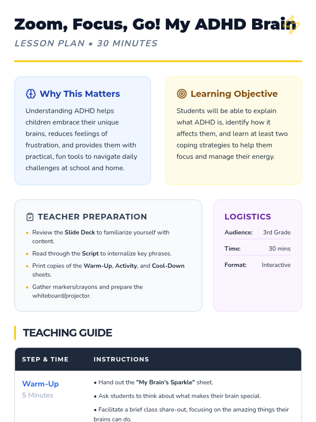 This 30-minute lesson for 8-year-olds helps students understand ADHD as a unique brain wiring, identifying its strengths and learning practical 'focus tools' to manage energy and attention.