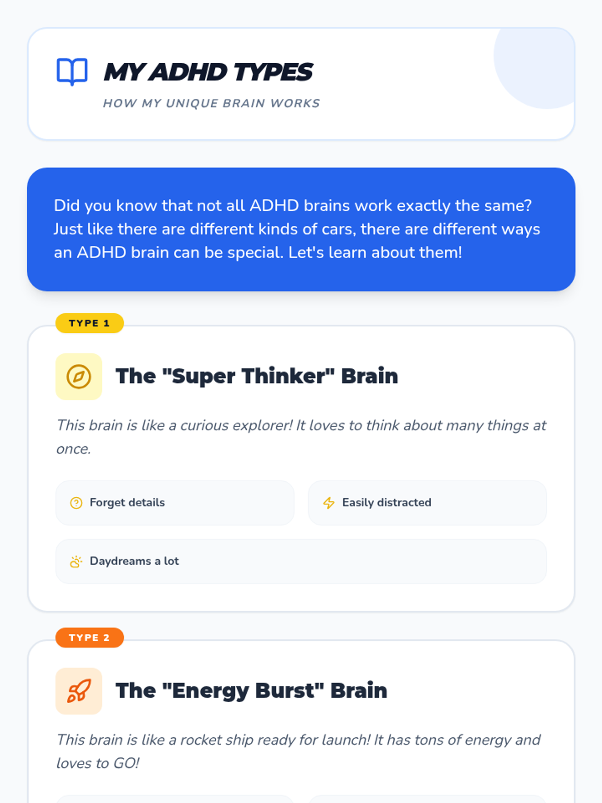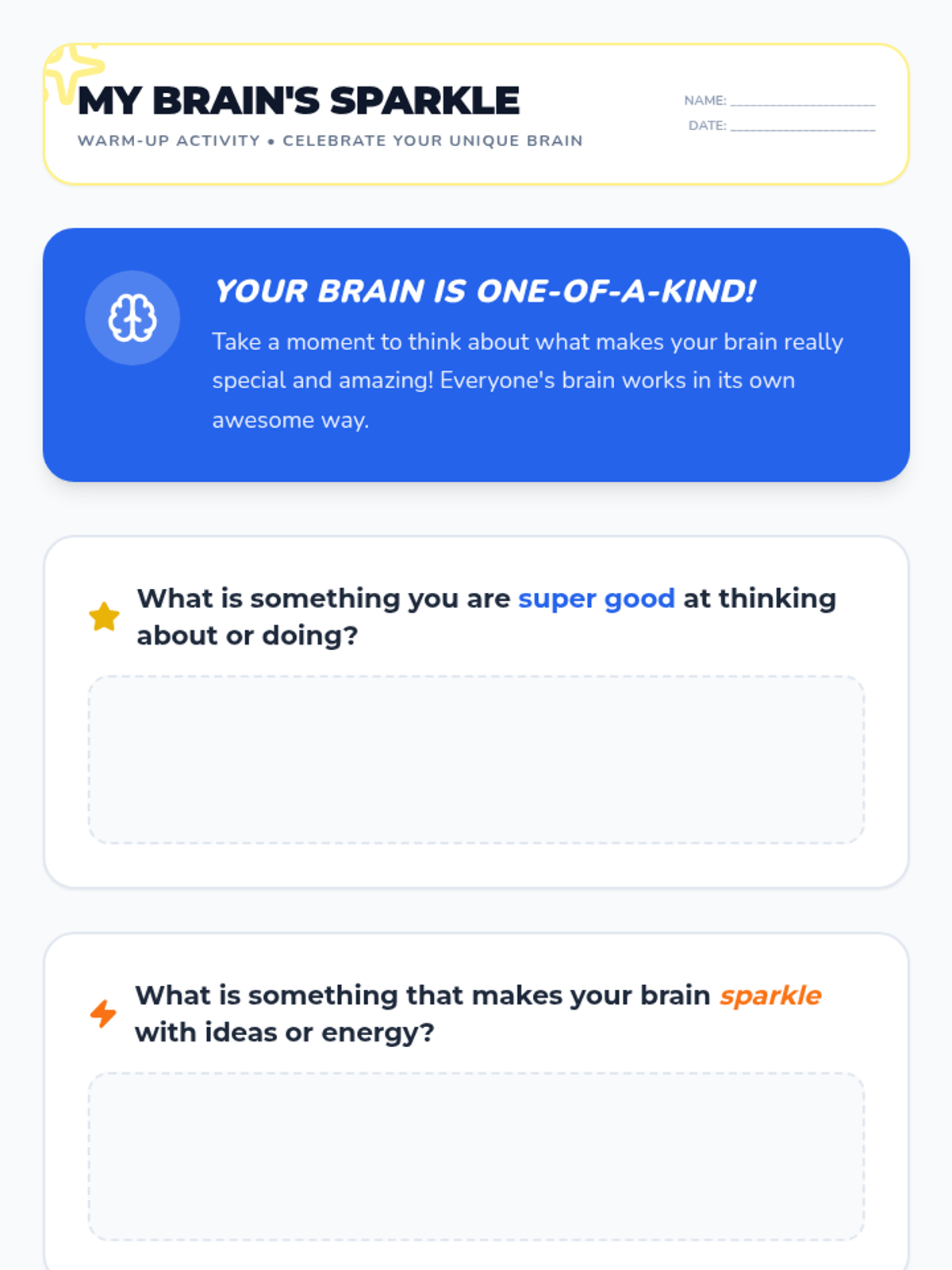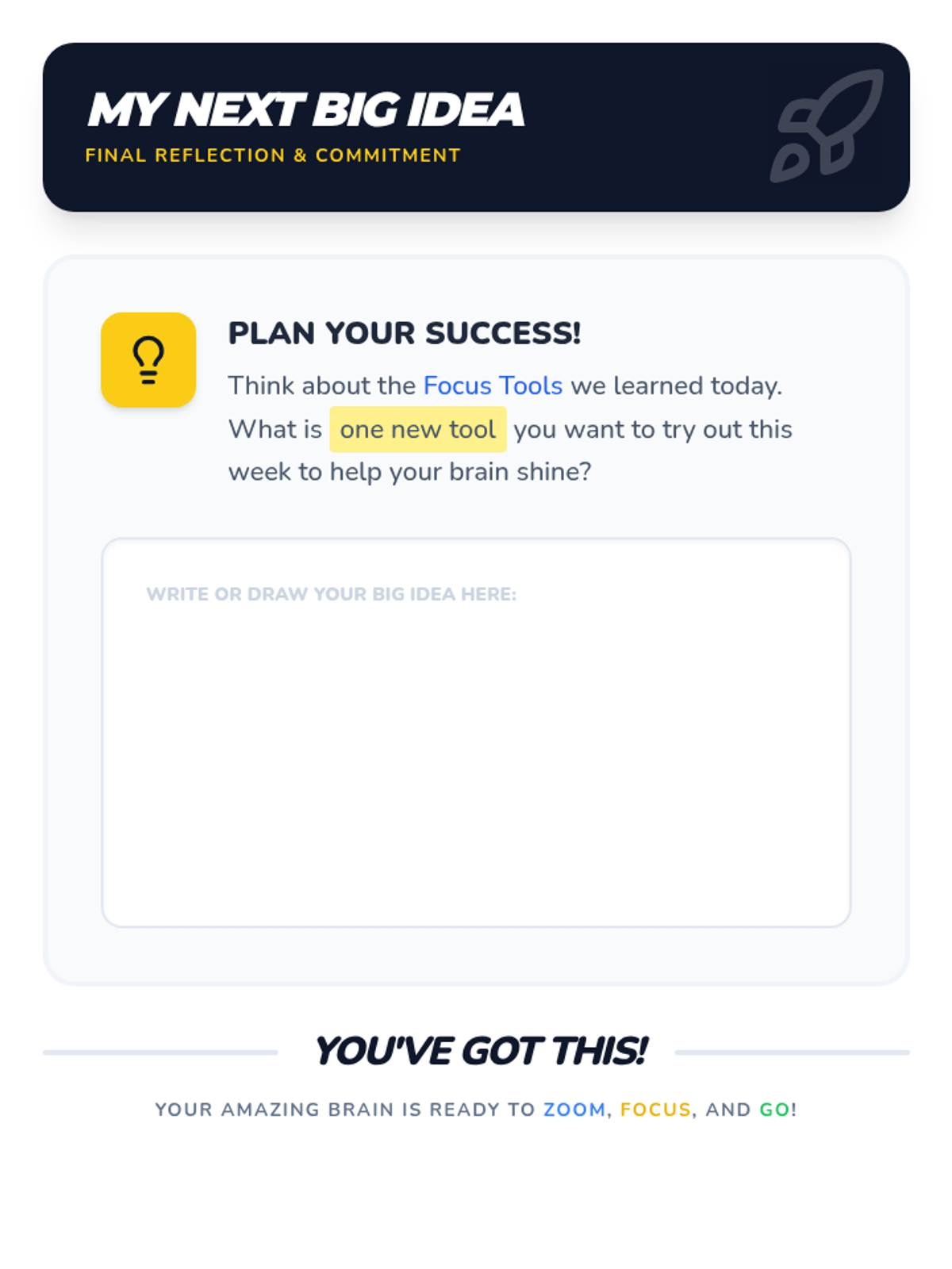 This 30-minute lesson for 8-year-olds helps students understand ADHD as a unique brain wiring, identifying its strengths and learning practical 'focus tools' to manage energy and attention.