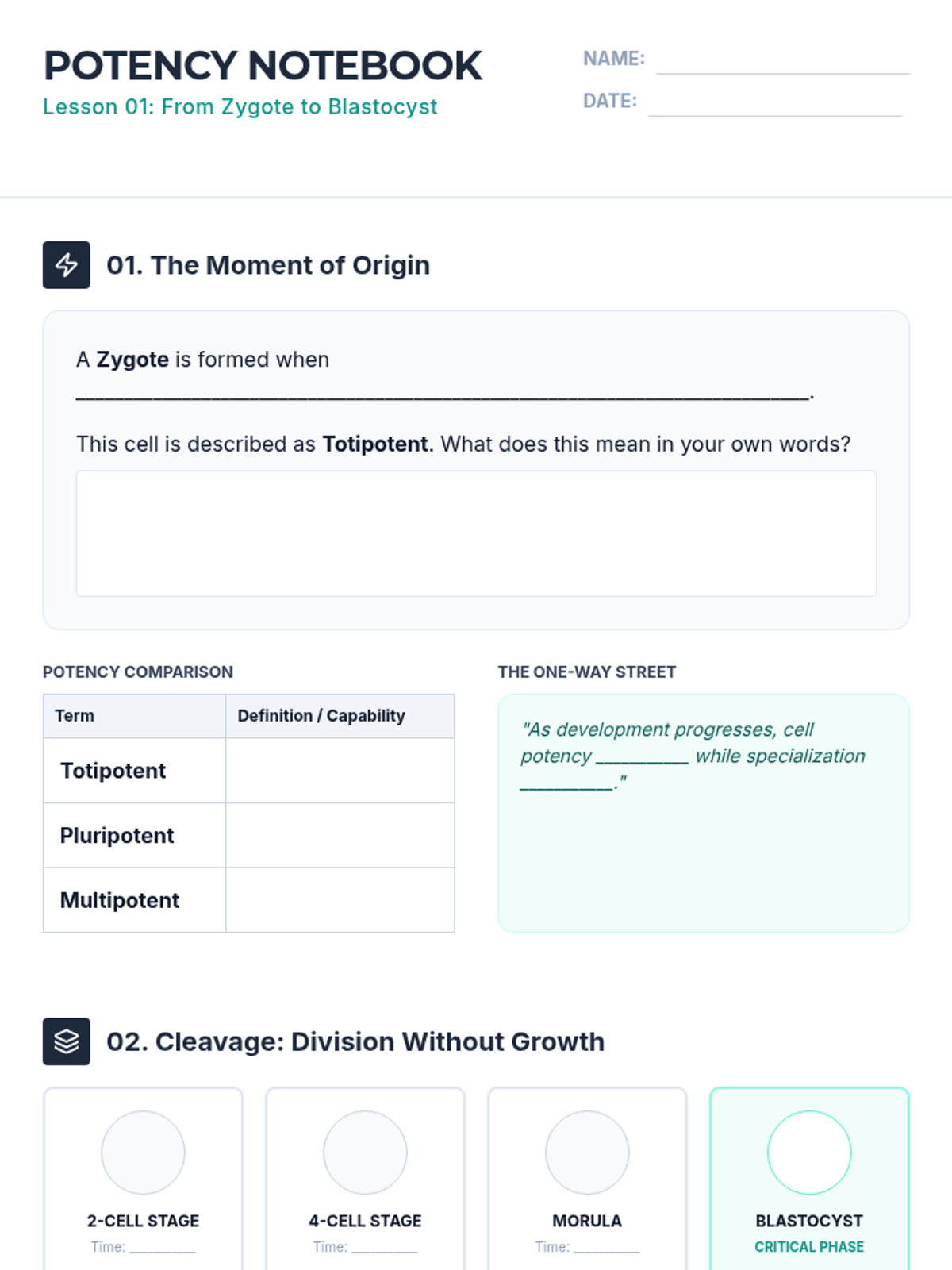 Students trace the initial cleavage divisions of a fertilized egg and define totipotency and pluripotency. This lesson focuses on the structural organization of the early embryo.