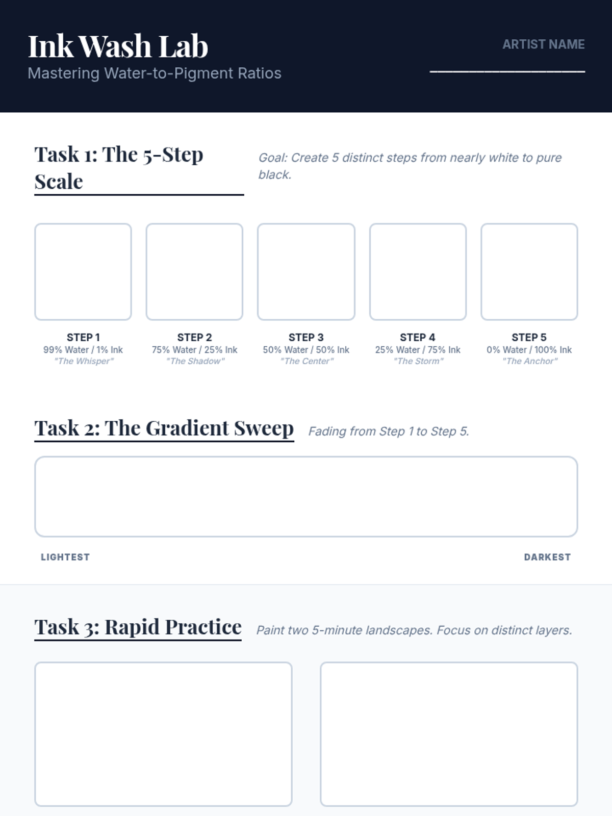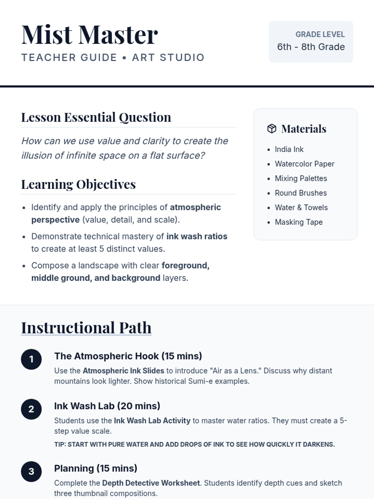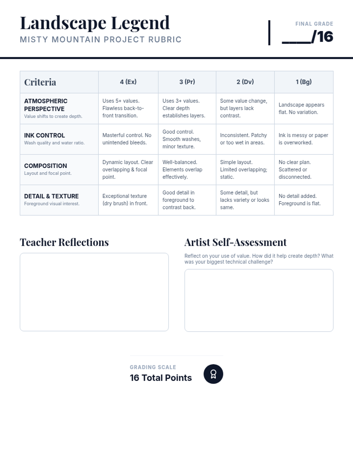 Students explore atmospheric perspective through monochromatic ink wash painting, learning to control water-to-pigment ratios to create depth and mist-filled mountain landscapes.