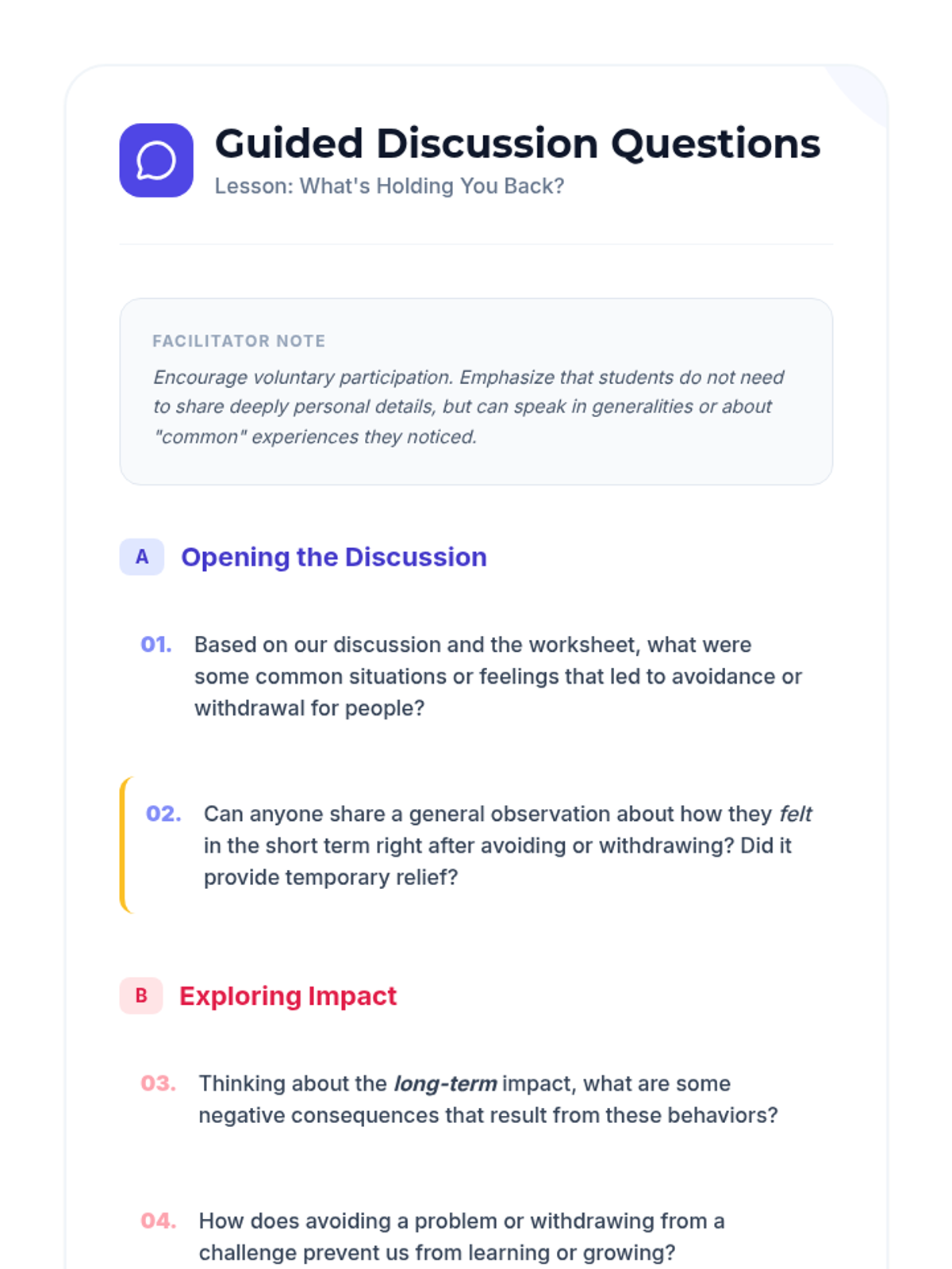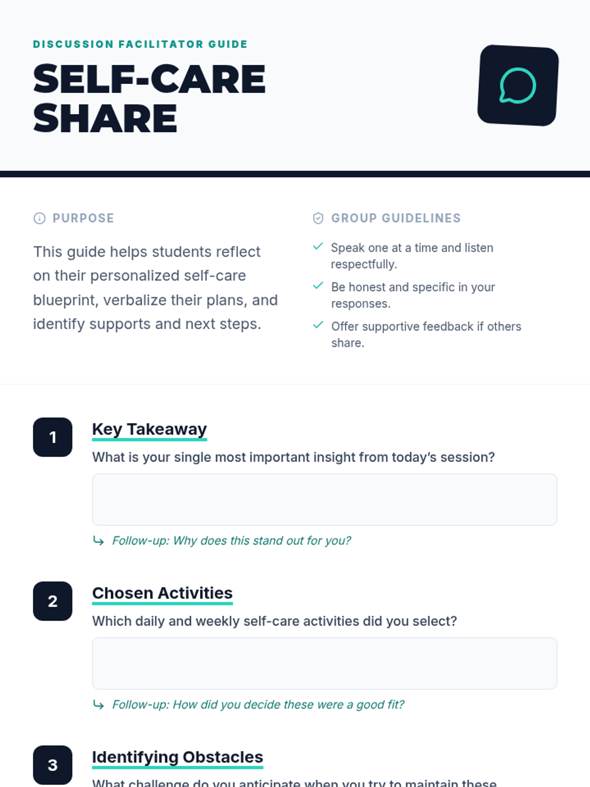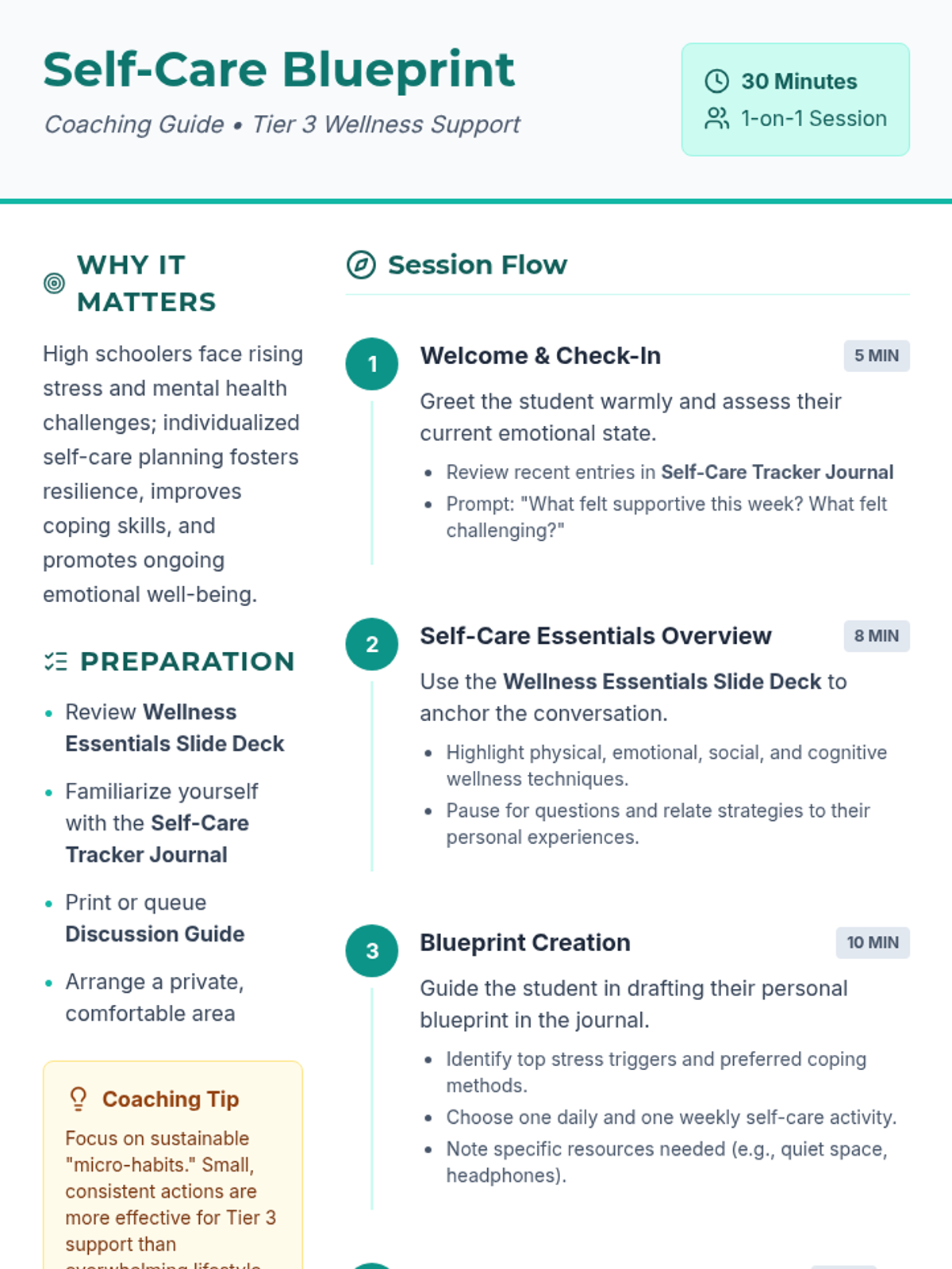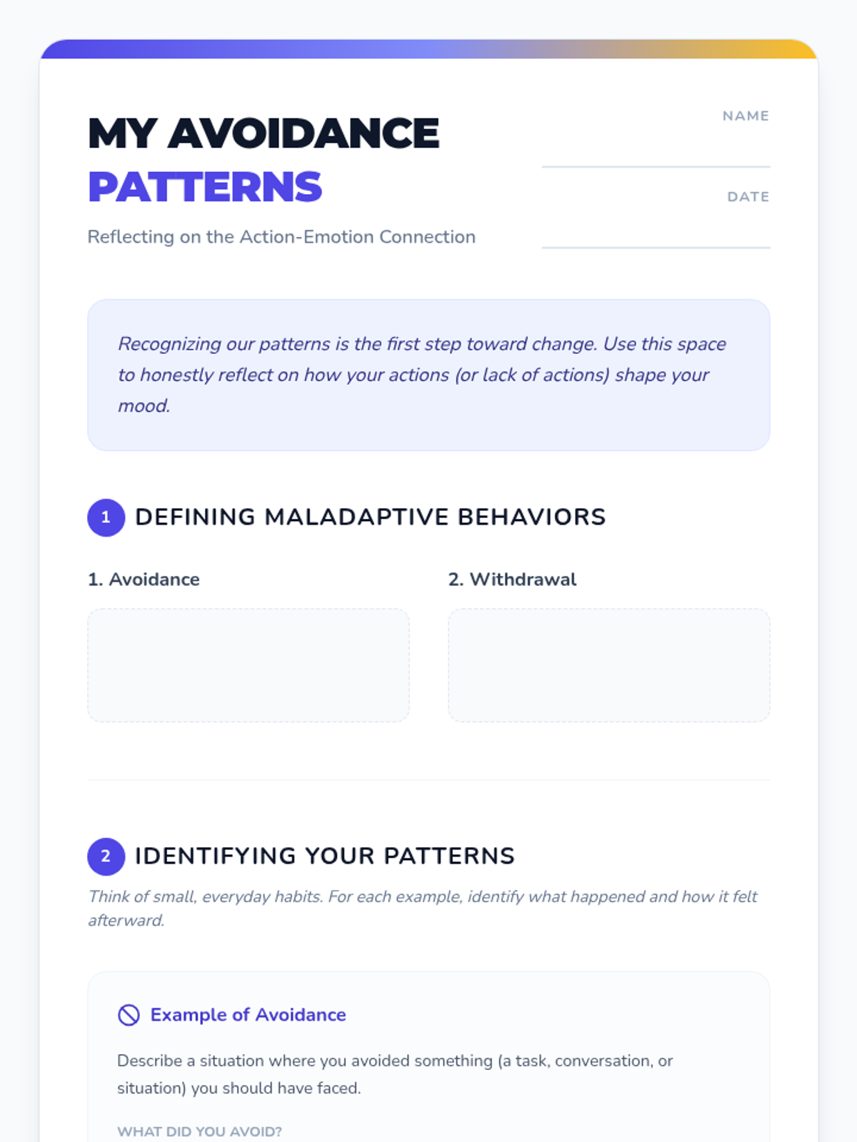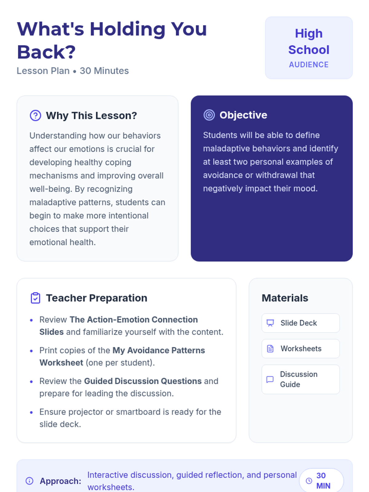 Focuses on 'Behavioral Activation'—the science of doing to feel better. Students build a Daily Activation Planner to spark momentum even when motivation is low.