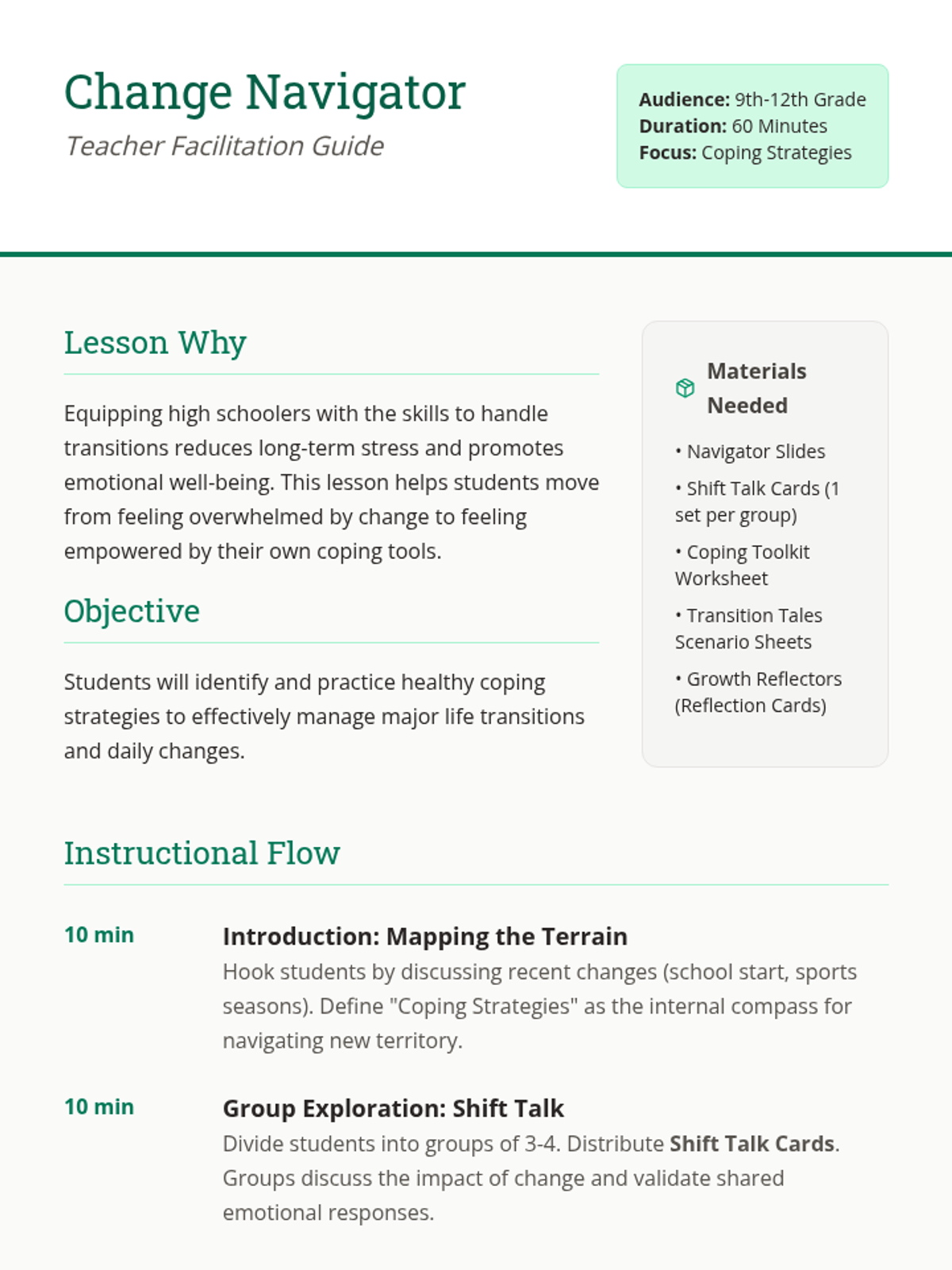 A comprehensive lesson designed to help teens understand their emotional triggers, recognize physical warning signs, and build a personalized toolkit of regulation strategies through guided reflection and daily planning.