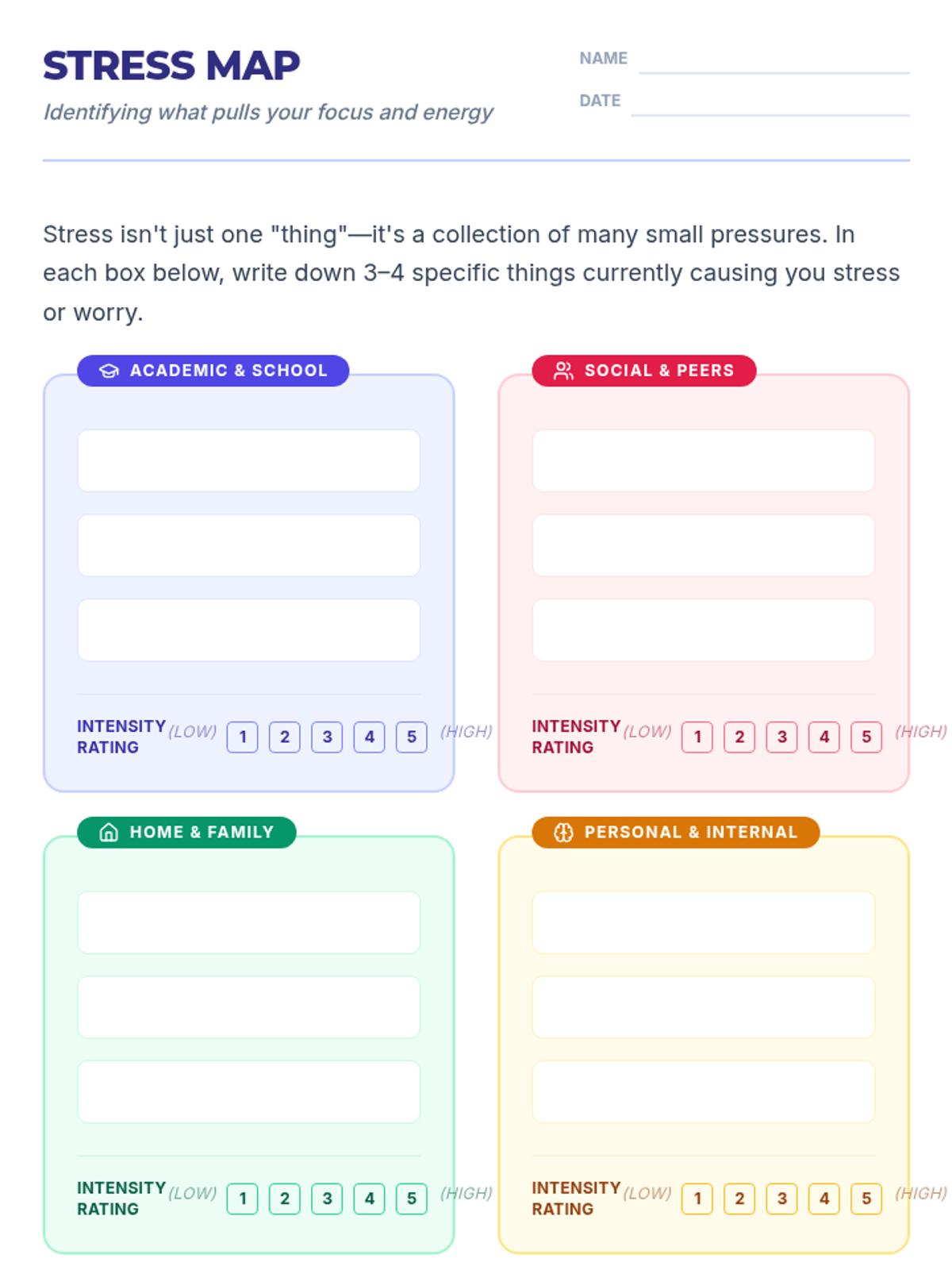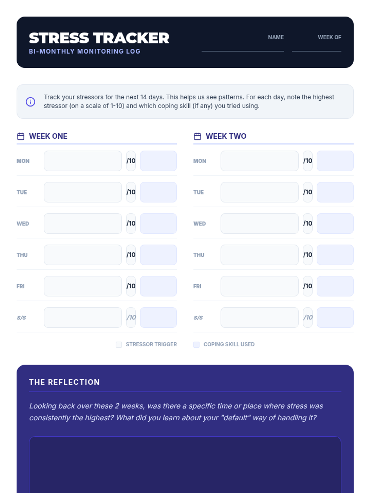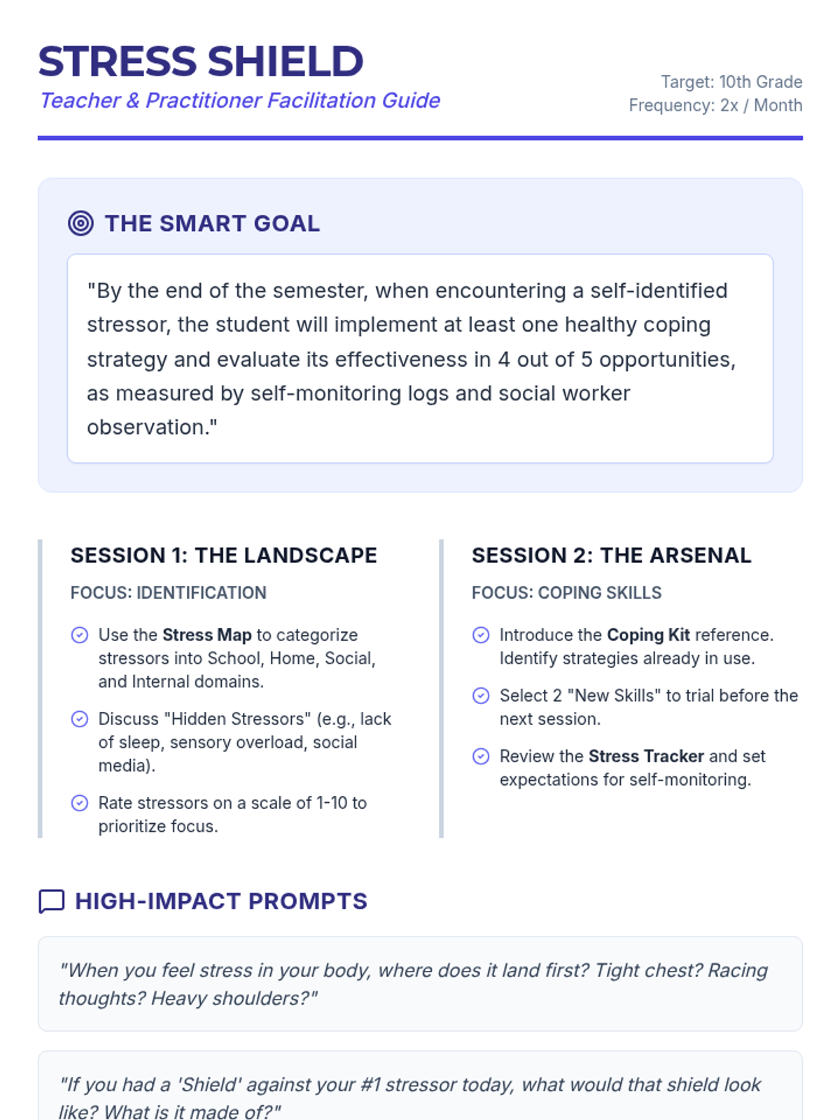 A set of materials designed for bi-monthly social work sessions with a 10th-grade student, focusing on identifying stressors and building a personalized coping skill toolkit.