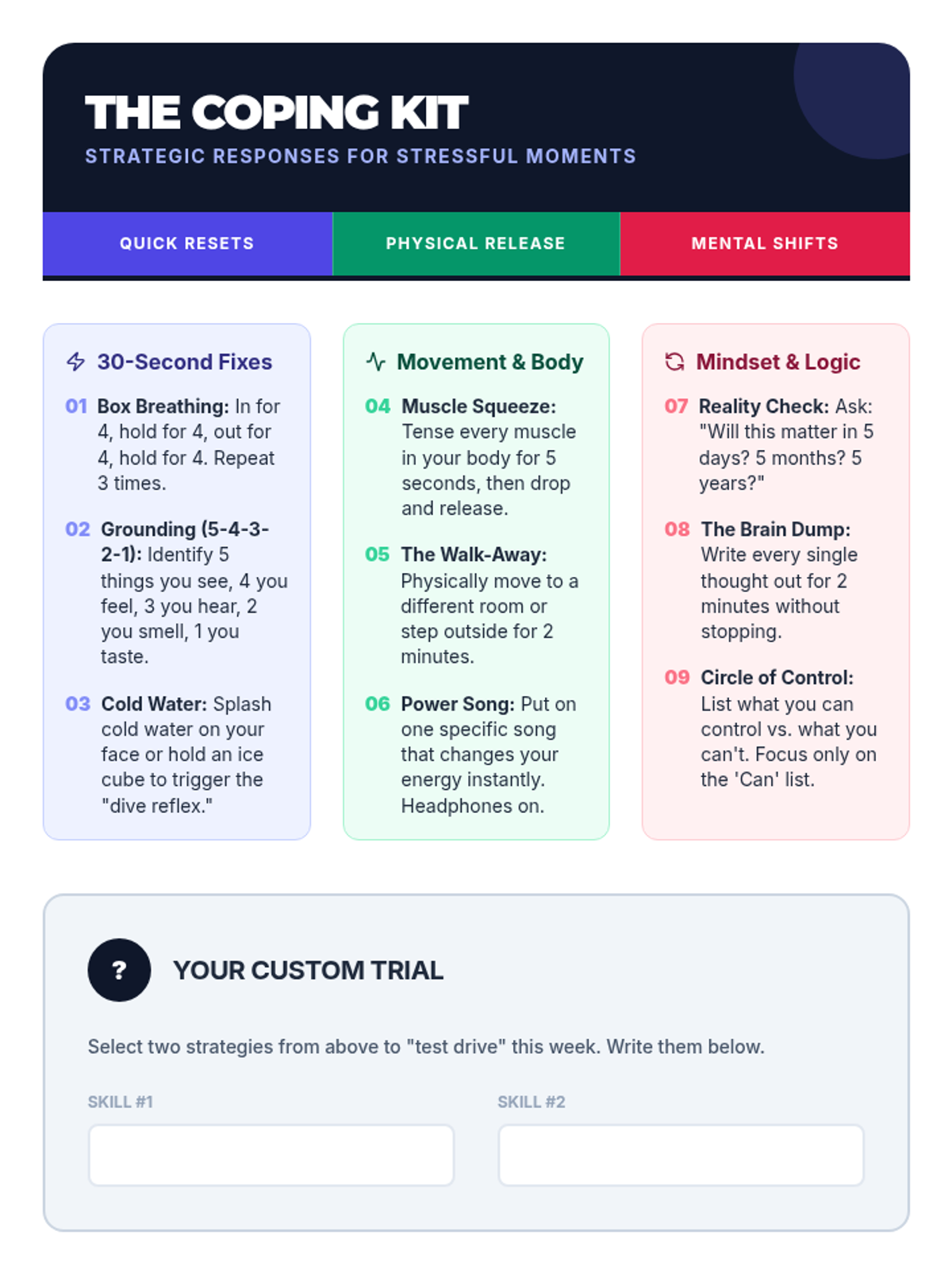 Equips students with high-level cognitive strategies to override impulsive reactions. Focuses on 'reframing' stressful situations and using 'if-then' planning to maintain composure under pressure.
