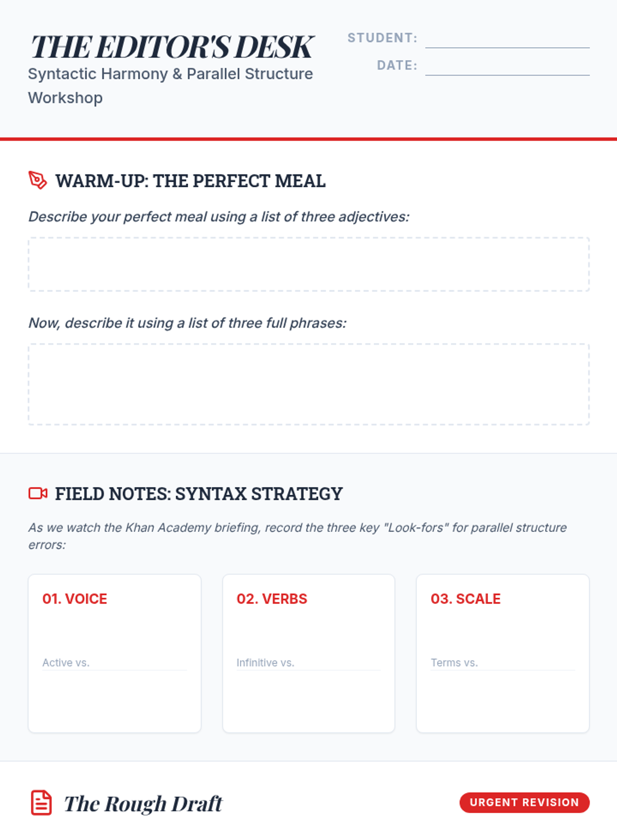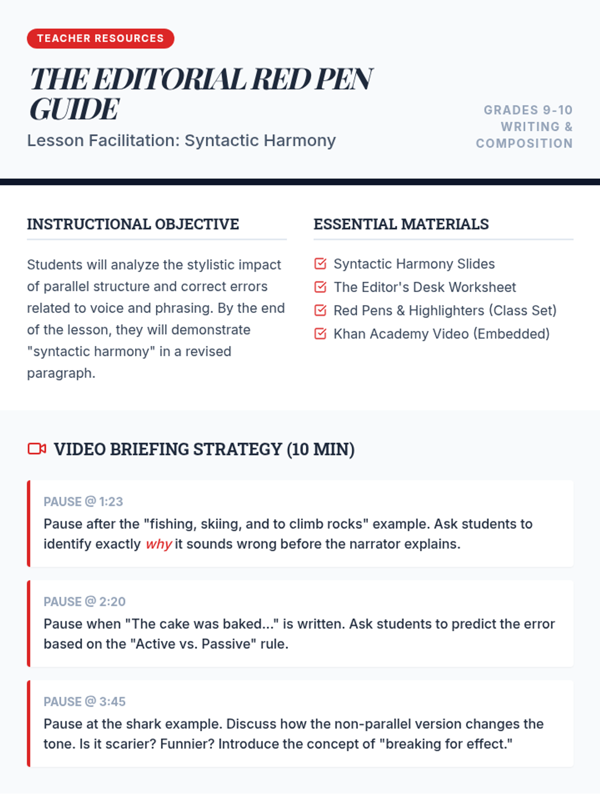 This lesson focuses on identifying and correcting faulty parallelism in writing, specifically targeting inconsistencies in verb forms (gerunds vs. infinitives) and voice (active vs. passive). Students act as editors to harmonize a clunky paragraph and explore how parallel structure creates rhythm and clarity.
