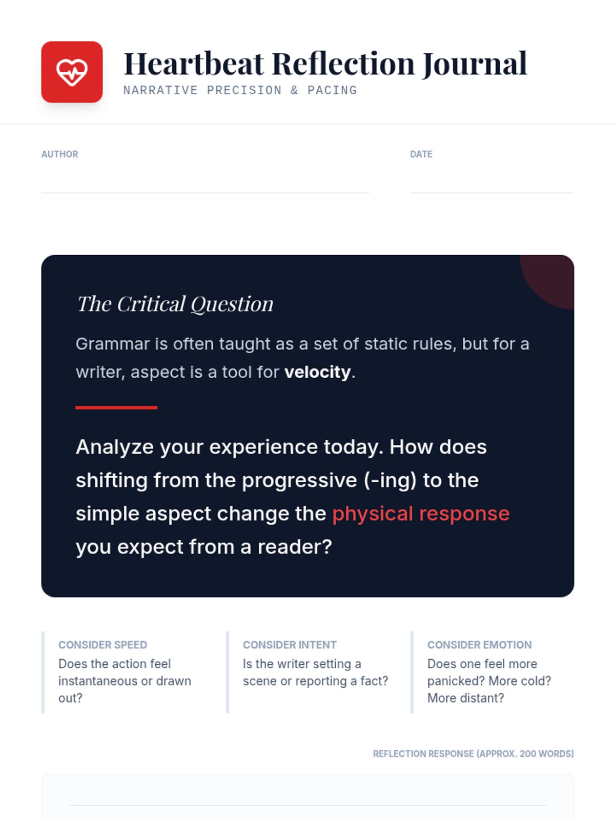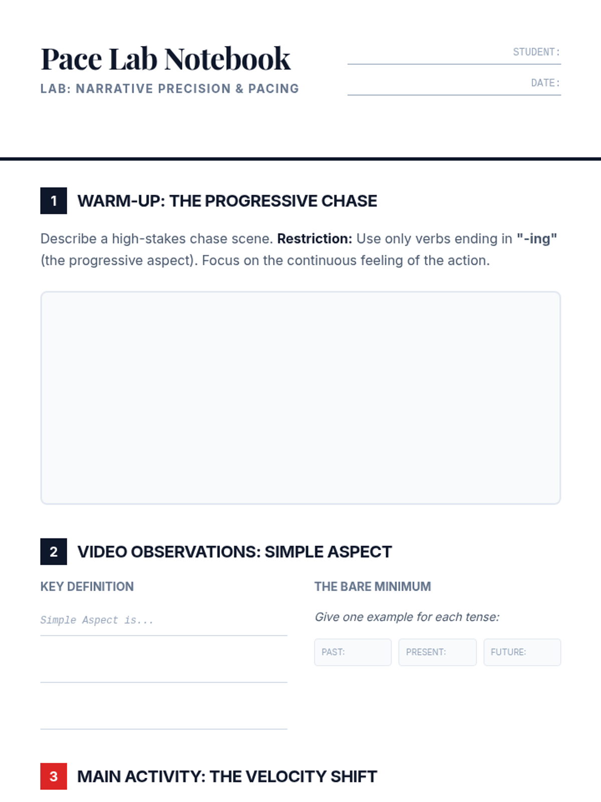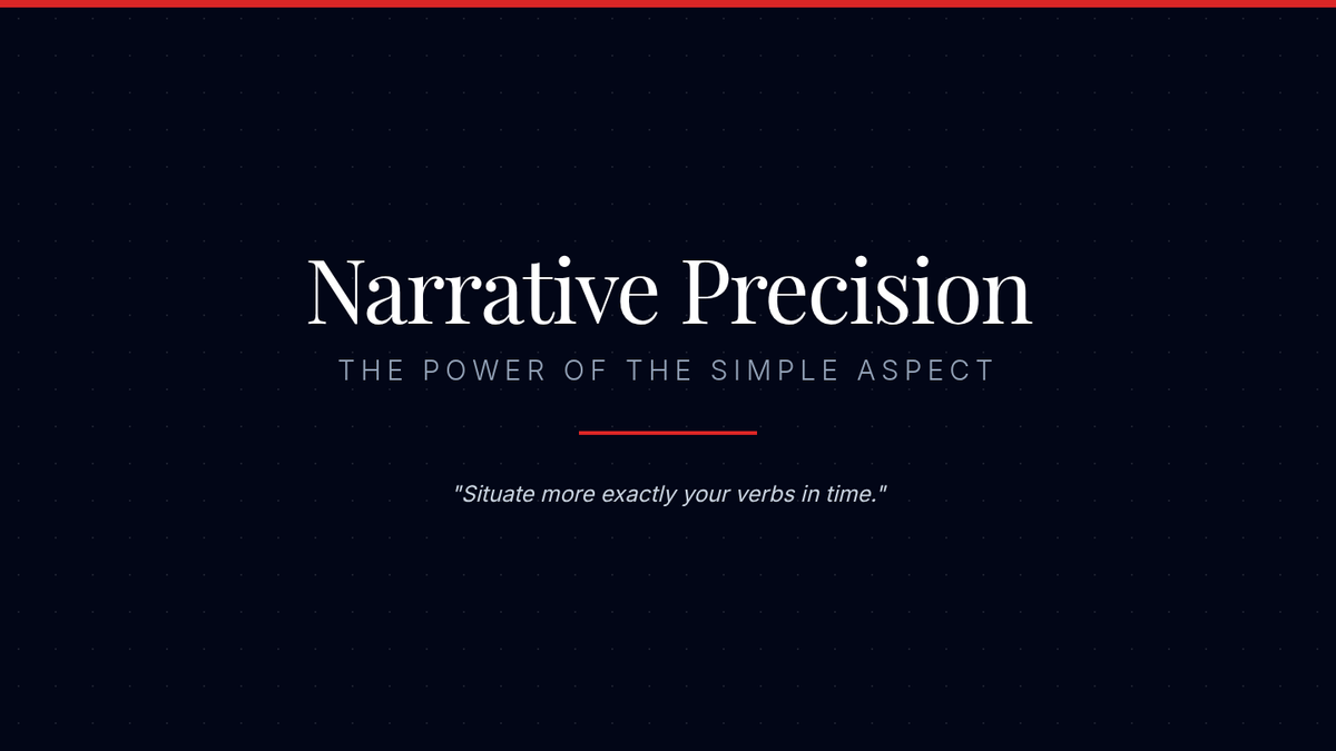 A high school creative writing lesson focusing on the grammatical 'simple aspect' to control narrative pacing and action. Students analyze how bare verb tenses create a sense of immediacy and directness compared to progressive forms.