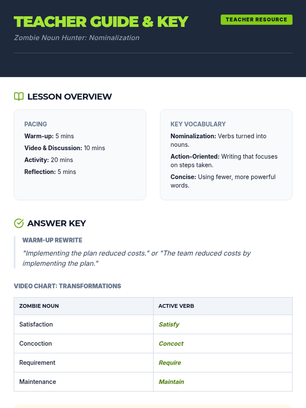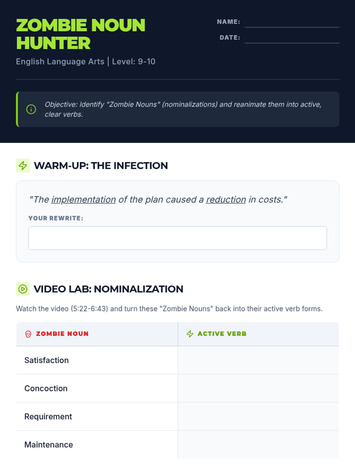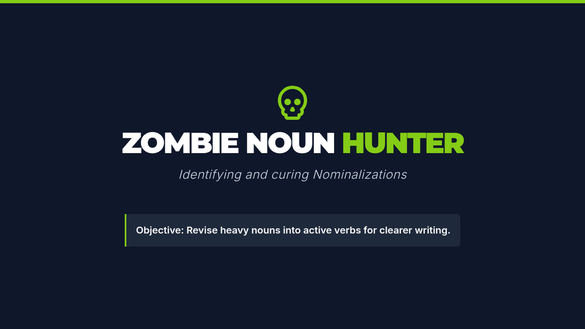 Students learn to identify and eliminate 'Zombie Nouns' (nominalizations) to make their writing more active and concise. The lesson includes a video-based discussion and a 'Nominalization Hunt' activity using a corporate memo.