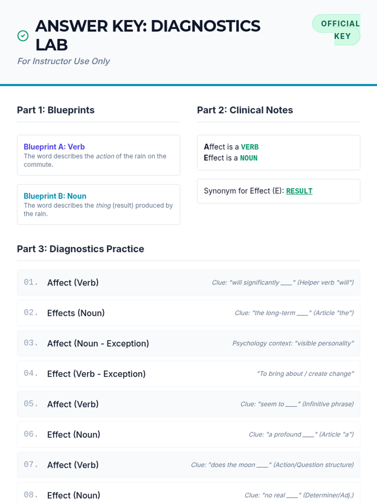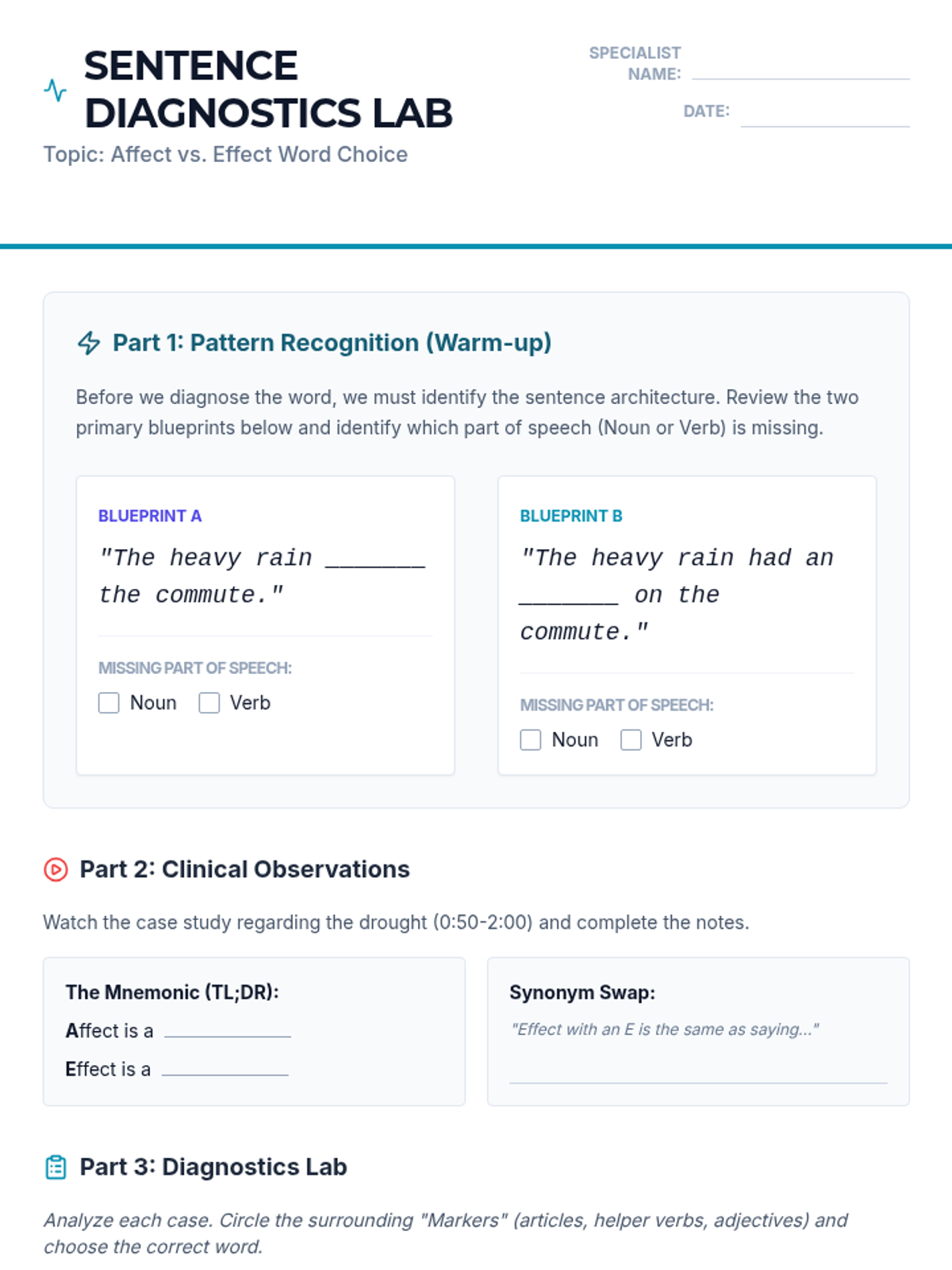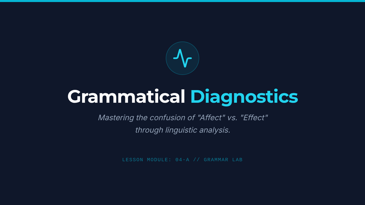 A comprehensive lesson for 9th-10th grade students on the distinction between 'affect' and 'effect'. Through a 'Sentence Diagnostics' approach, students analyze grammatical patterns and surrounding context to choose the correct word, including an introduction to high-level exceptions.