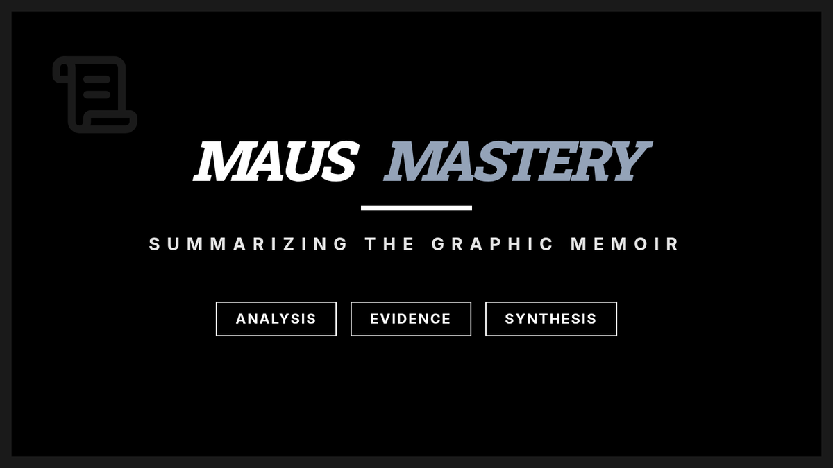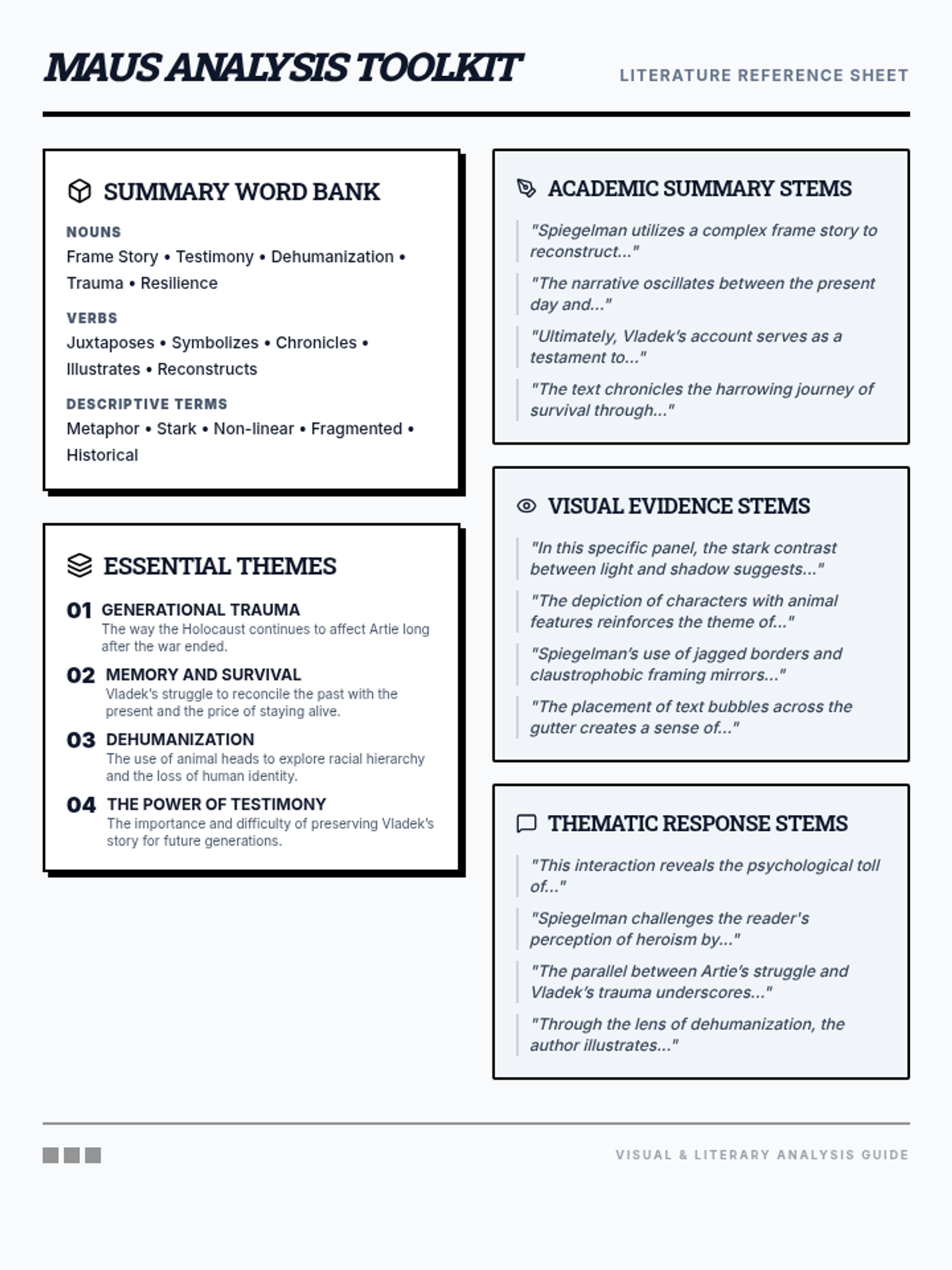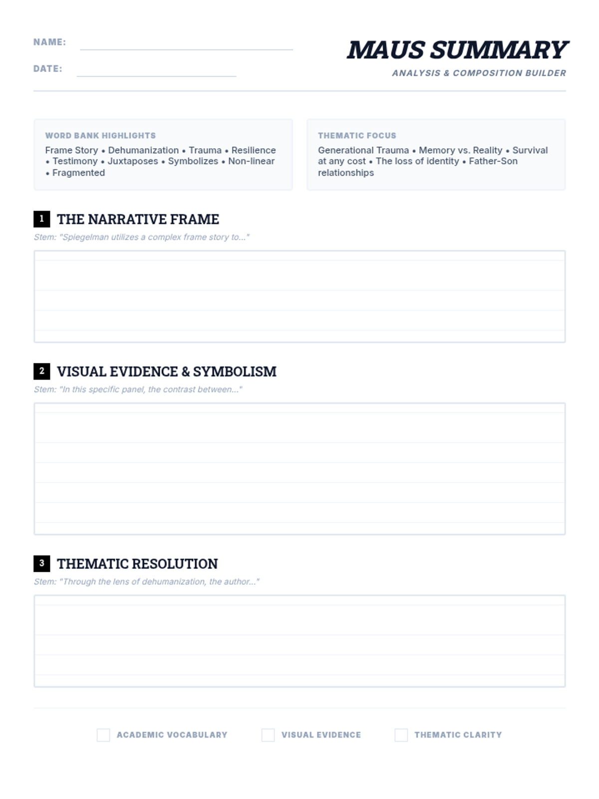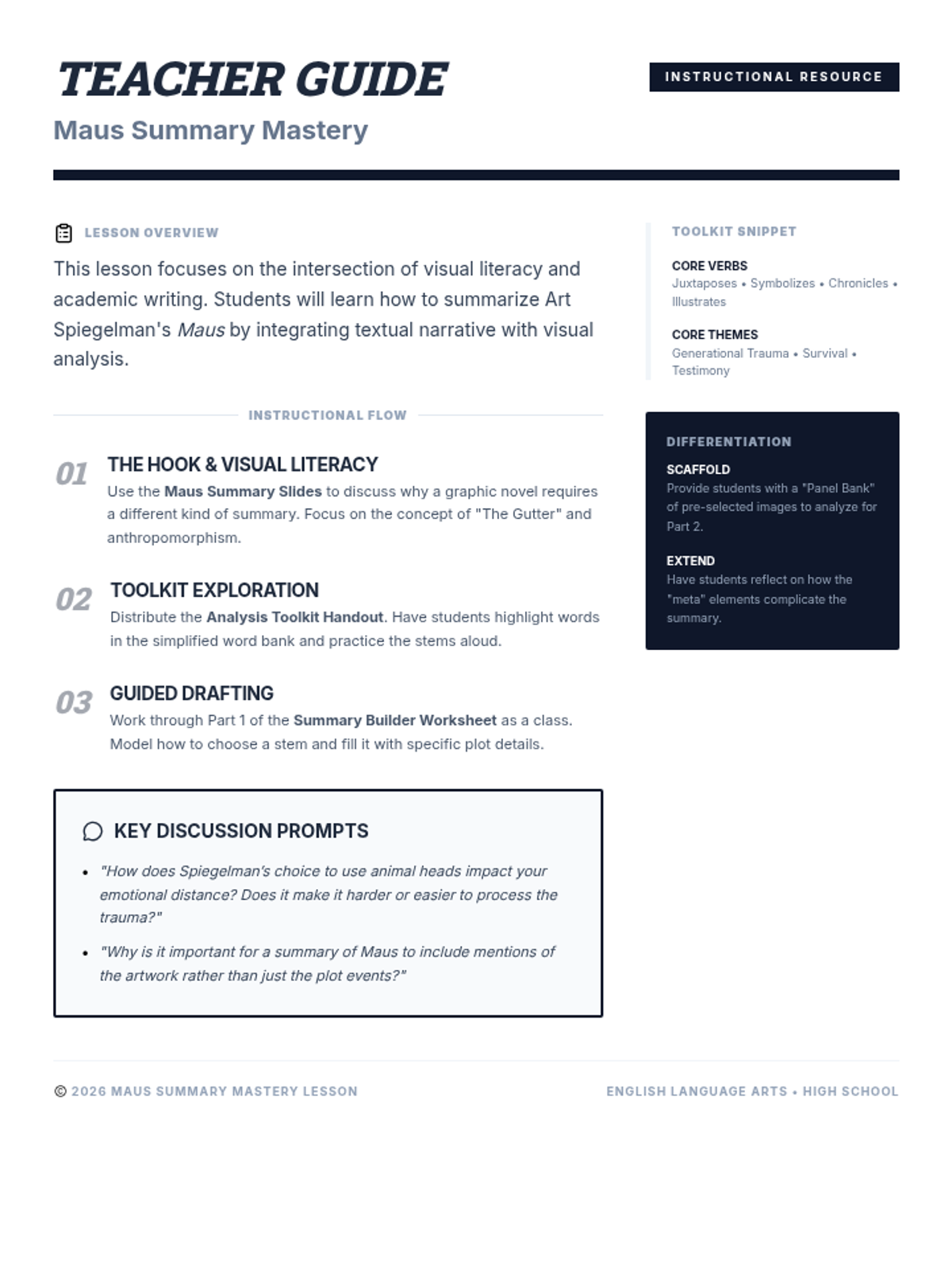 A lesson focused on distilling the complex, dual-narrative structure of Art Spiegelman's Maus I into a concise summary using structured graphic organizers and sentence stems.