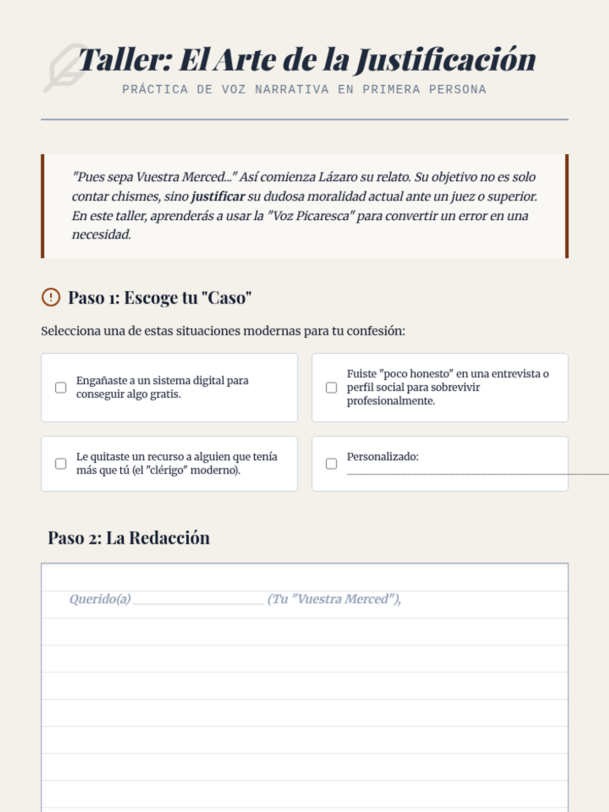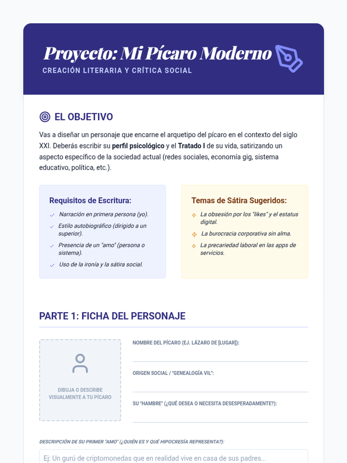 Students apply their understanding of the genre by designing their own modern pícaro. They write a character profile and an opening 'treatise' that satirizes a specific element of contemporary society.