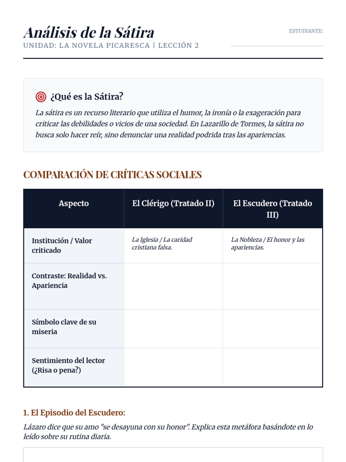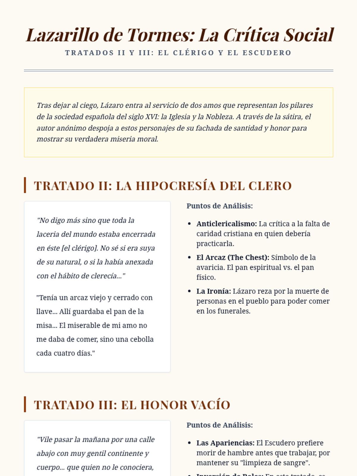 A deep dive into the satire directed at the clergy and the nobility. Students analyze how Lazarillo's experiences with the Priest and the Squire expose hypocrisy and the emptiness of social 'honor'.