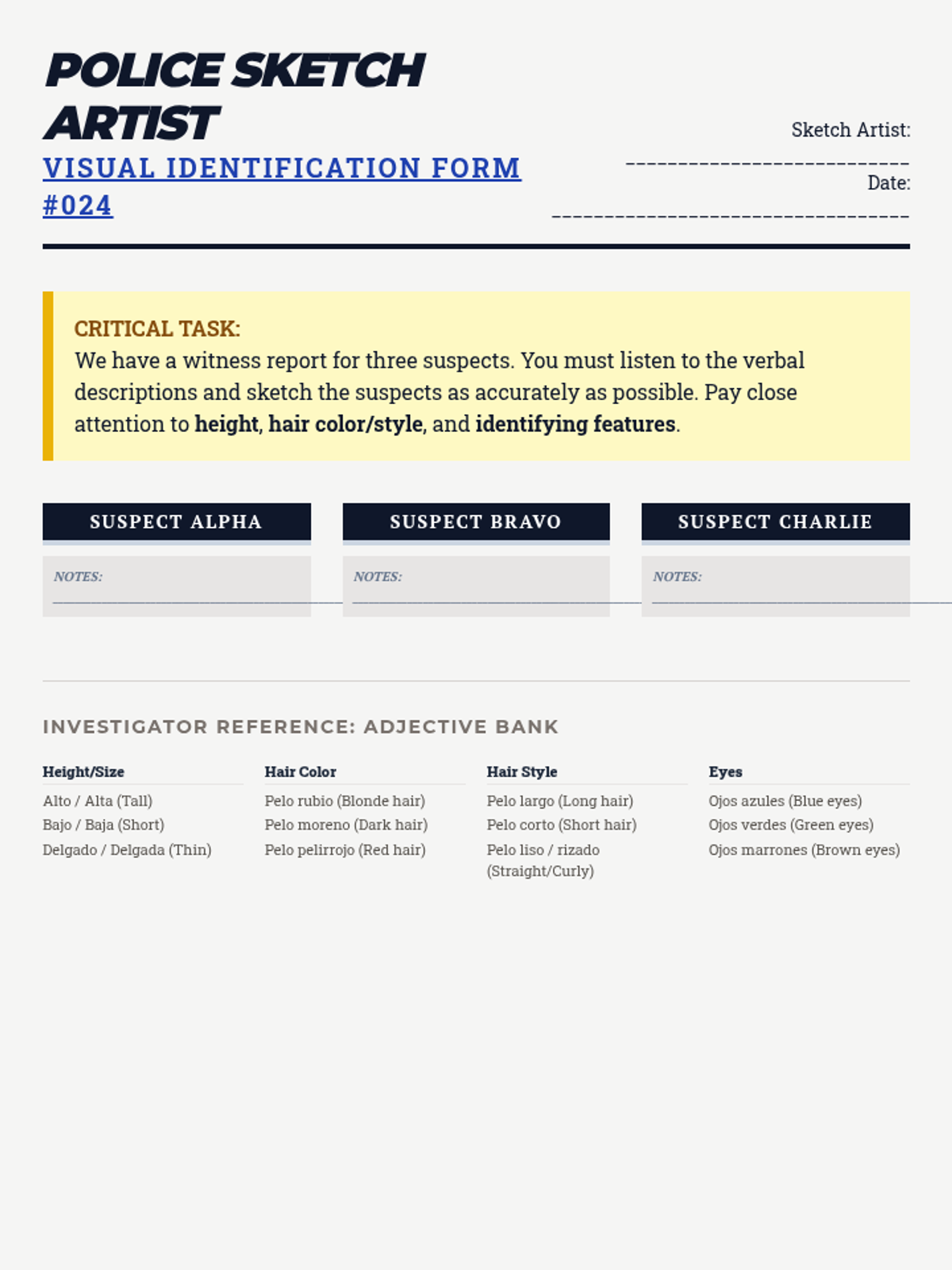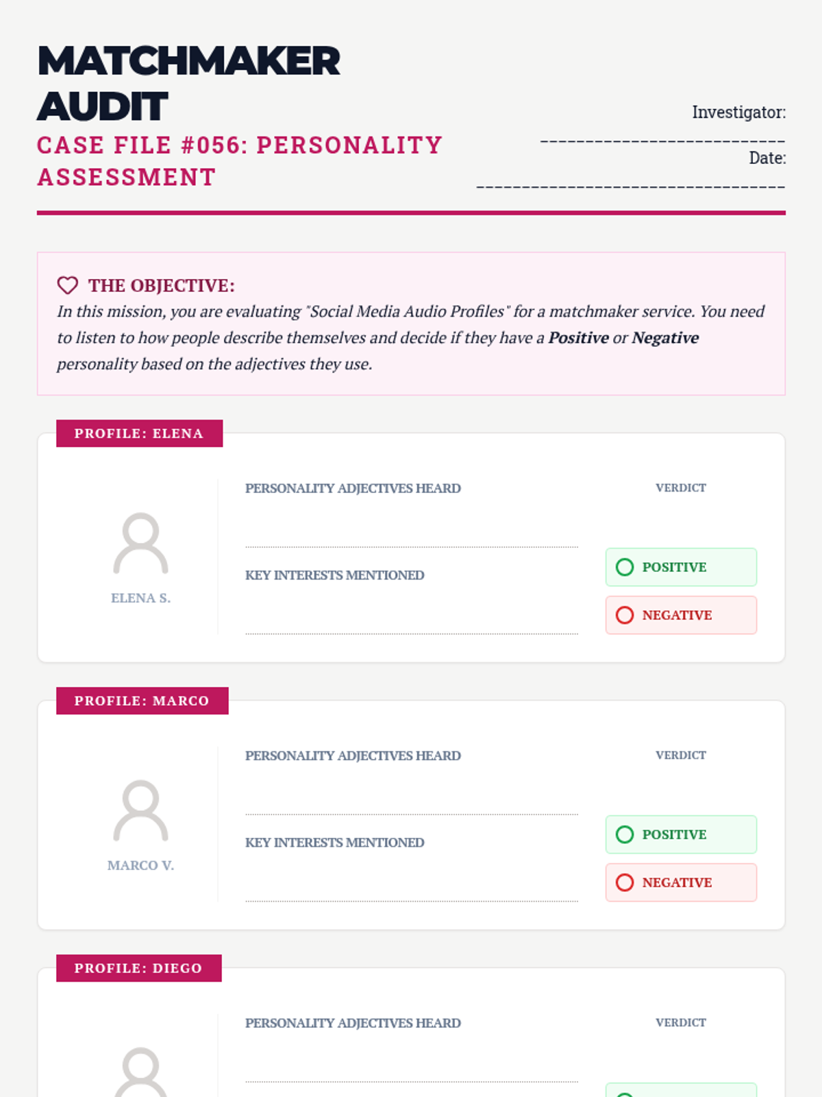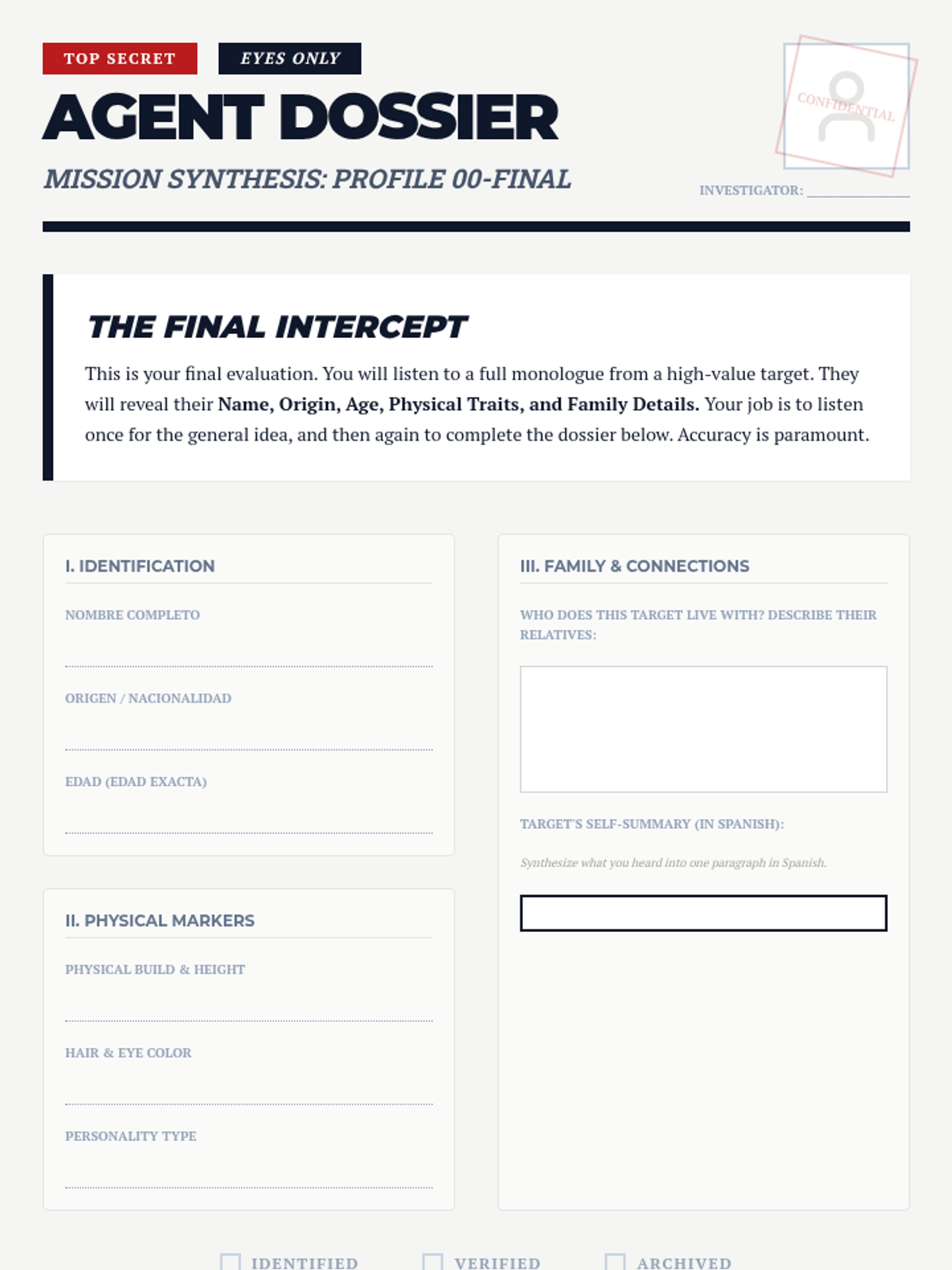Students combine all previous listening skills—origin, physical traits, personality, age, and family—to synthesize complete personal narratives and create secret agent dossiers.