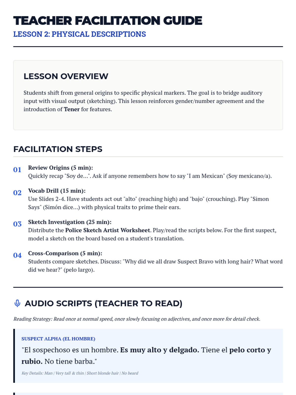 Students listen to physical descriptions in Spanish and transfer auditory information into visual sketches, focusing on adjectives and the verb 'Ser'.