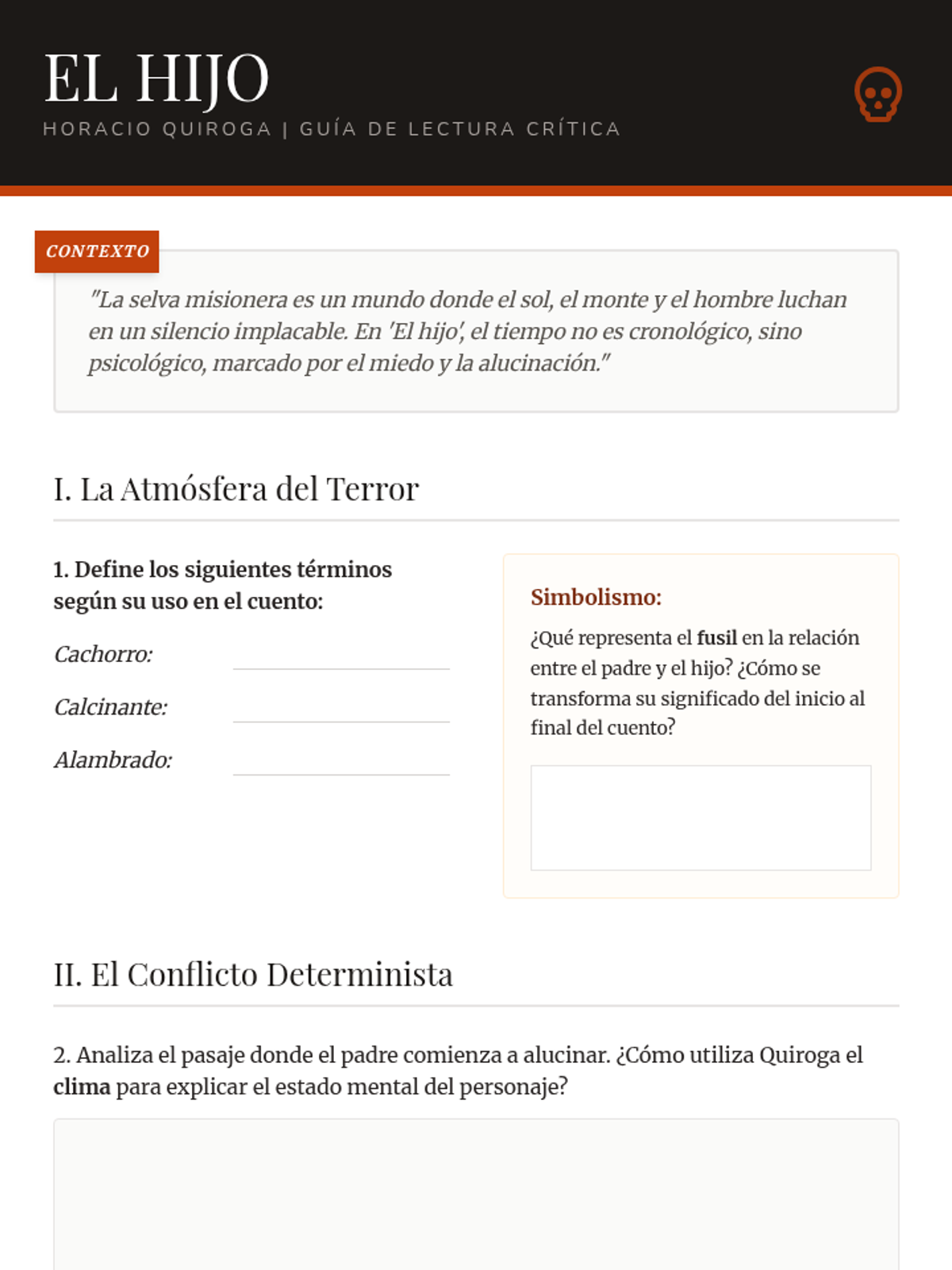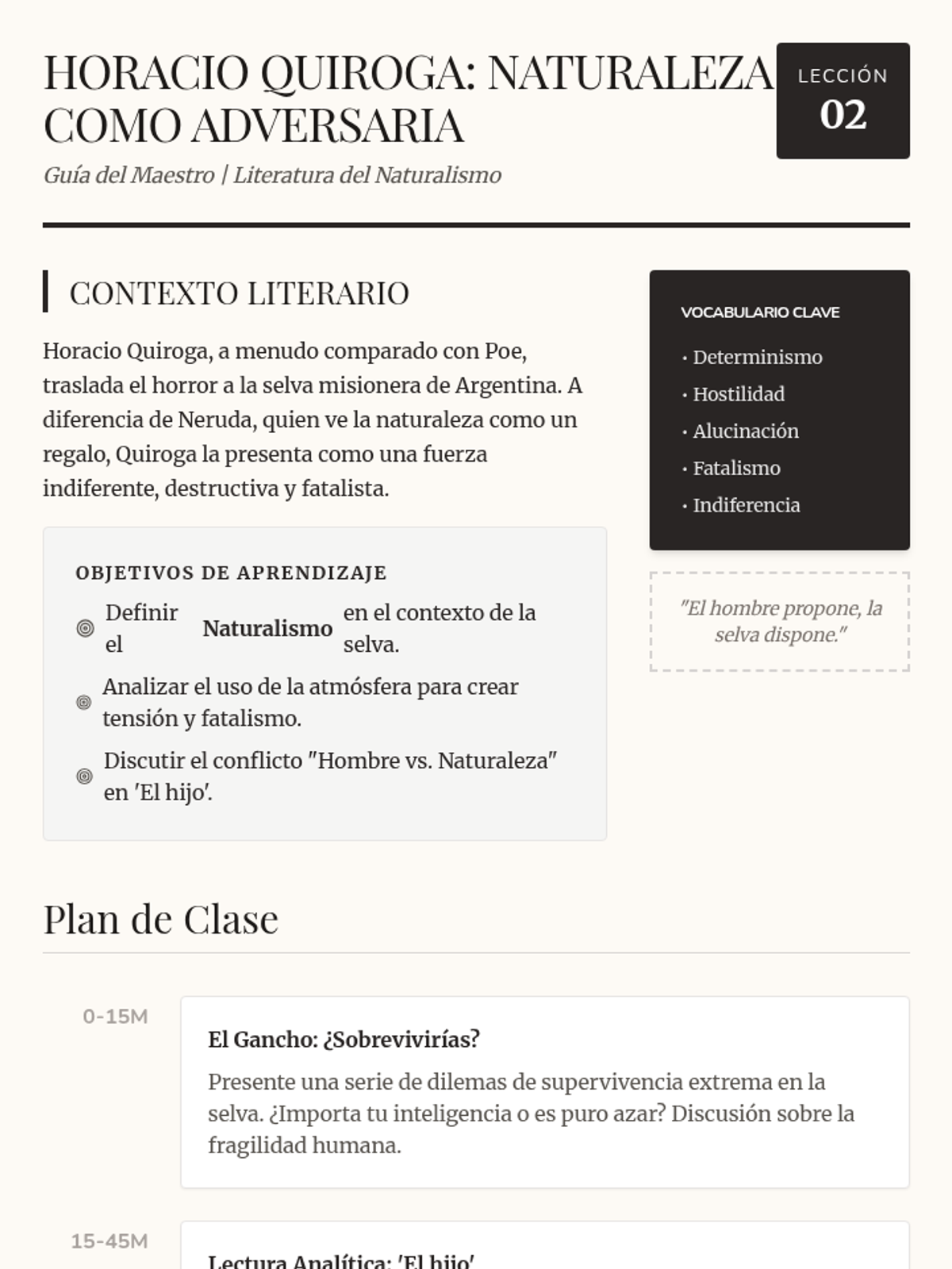 An analysis of Horacio Quiroga's jungle narratives, specifically 'El hijo', focusing on the deterministic relationship between humanity and a hostile environment.