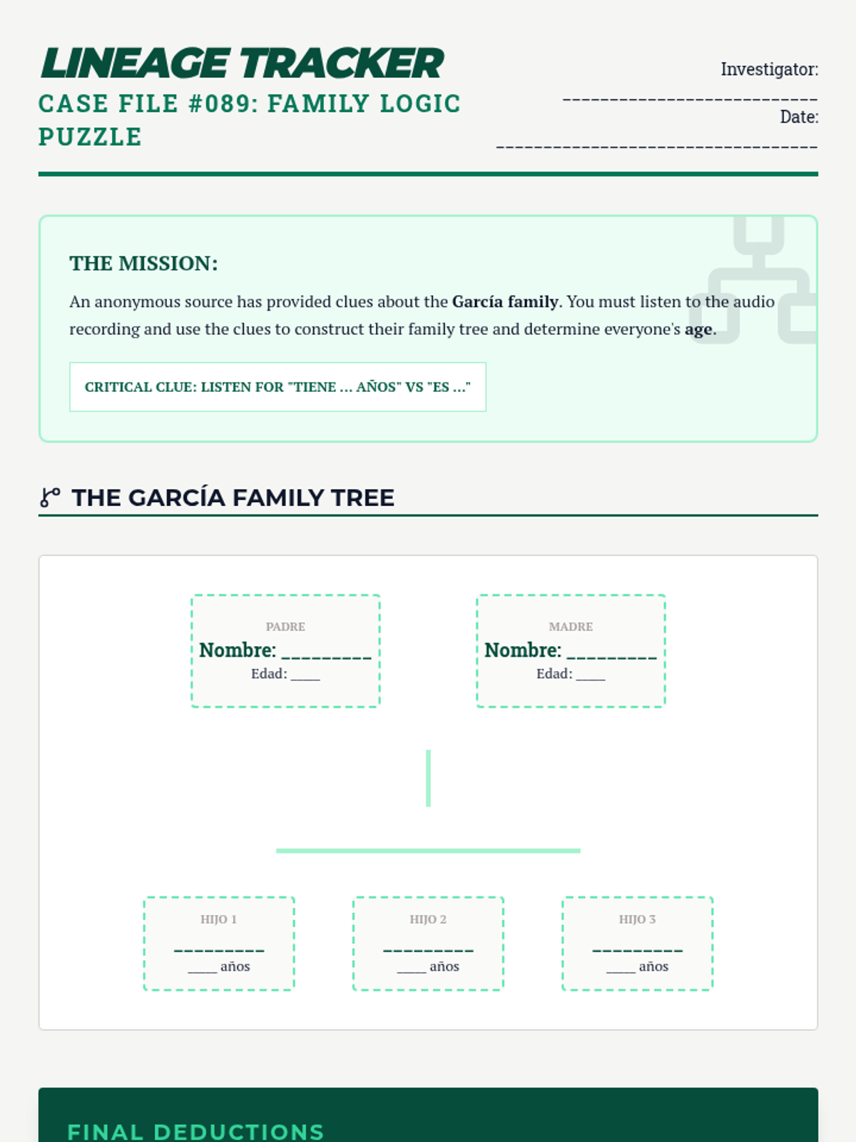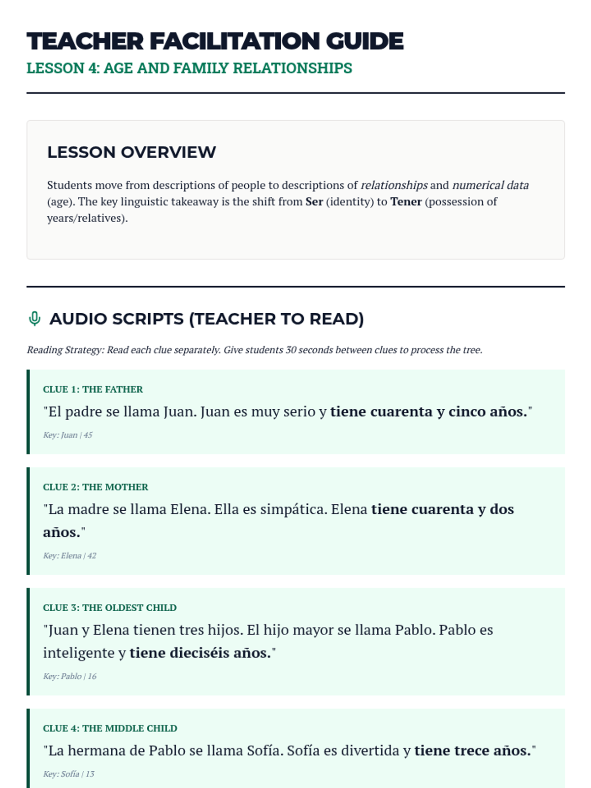 Students practice listening for ages and family relationships in Spanish, distinguishing between 'Ser' (being) and 'Tener' (having) to construct family trees.