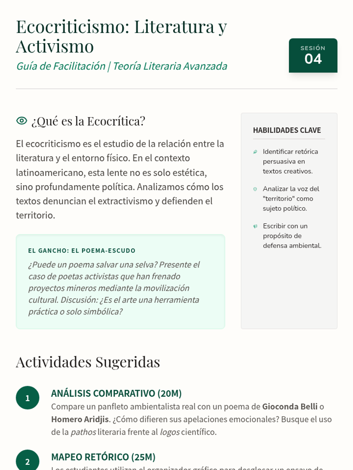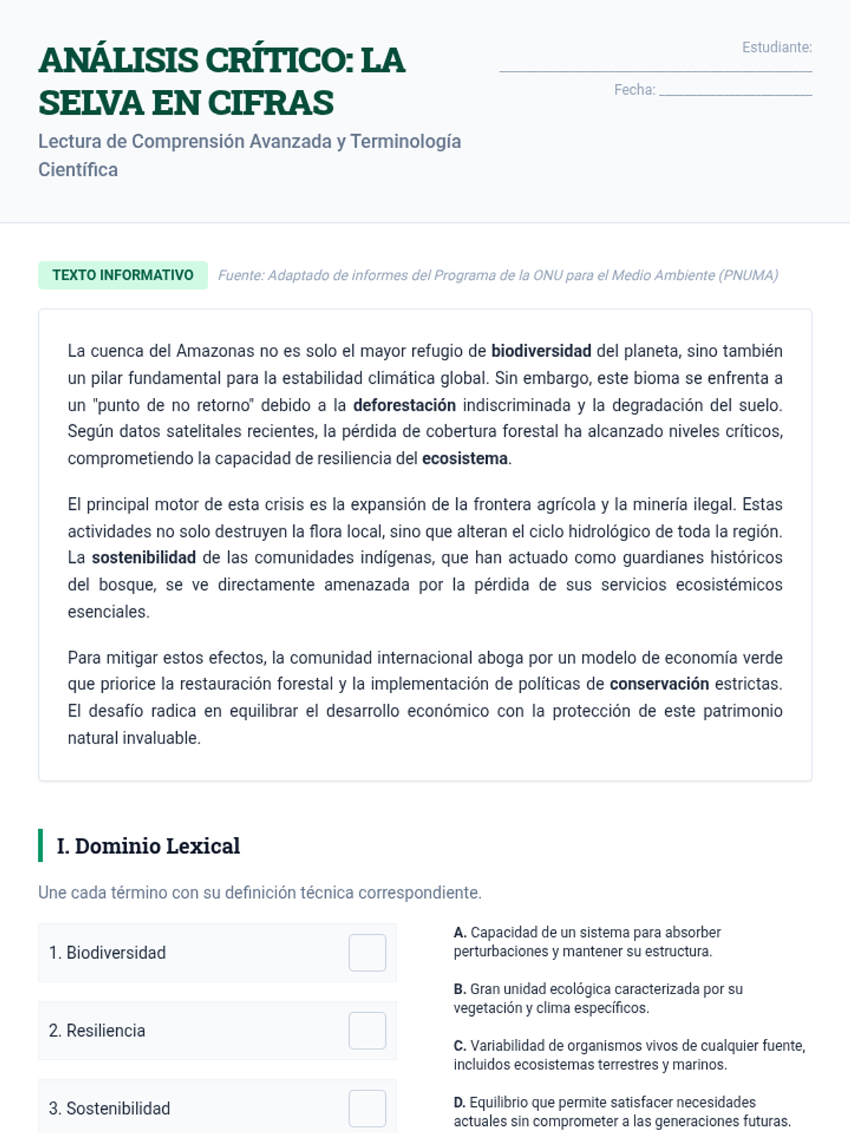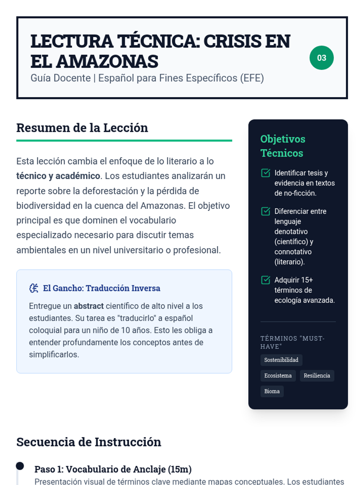 A technical immersion into scientific Spanish, focusing on deforestation in the Amazon. Students practice identifying theses and mastering academic vocabulary related to ecology.