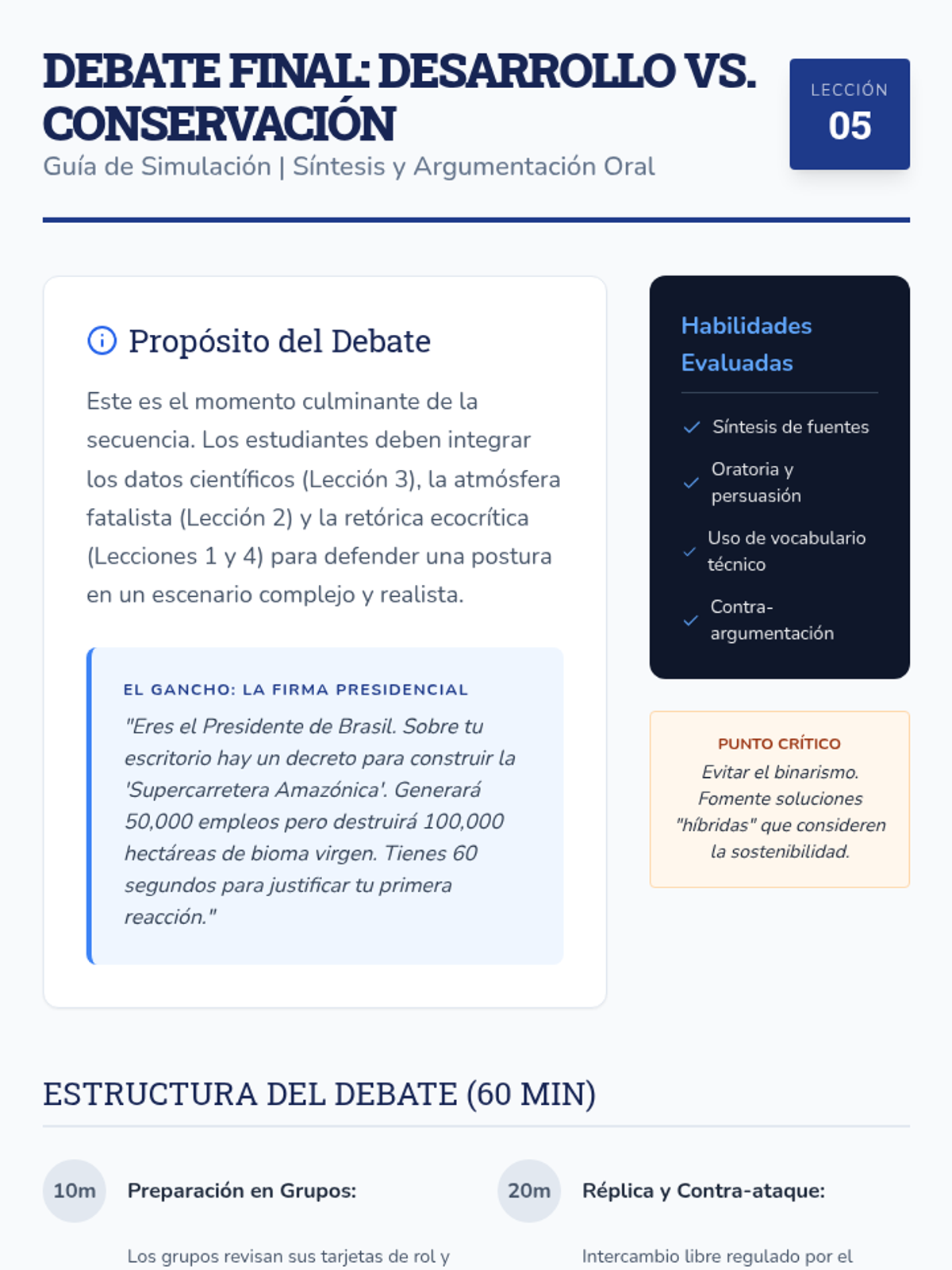 A culminating debate simulation where students synthesize scientific data and literary themes to argue the ethics of economic development versus environmental preservation.