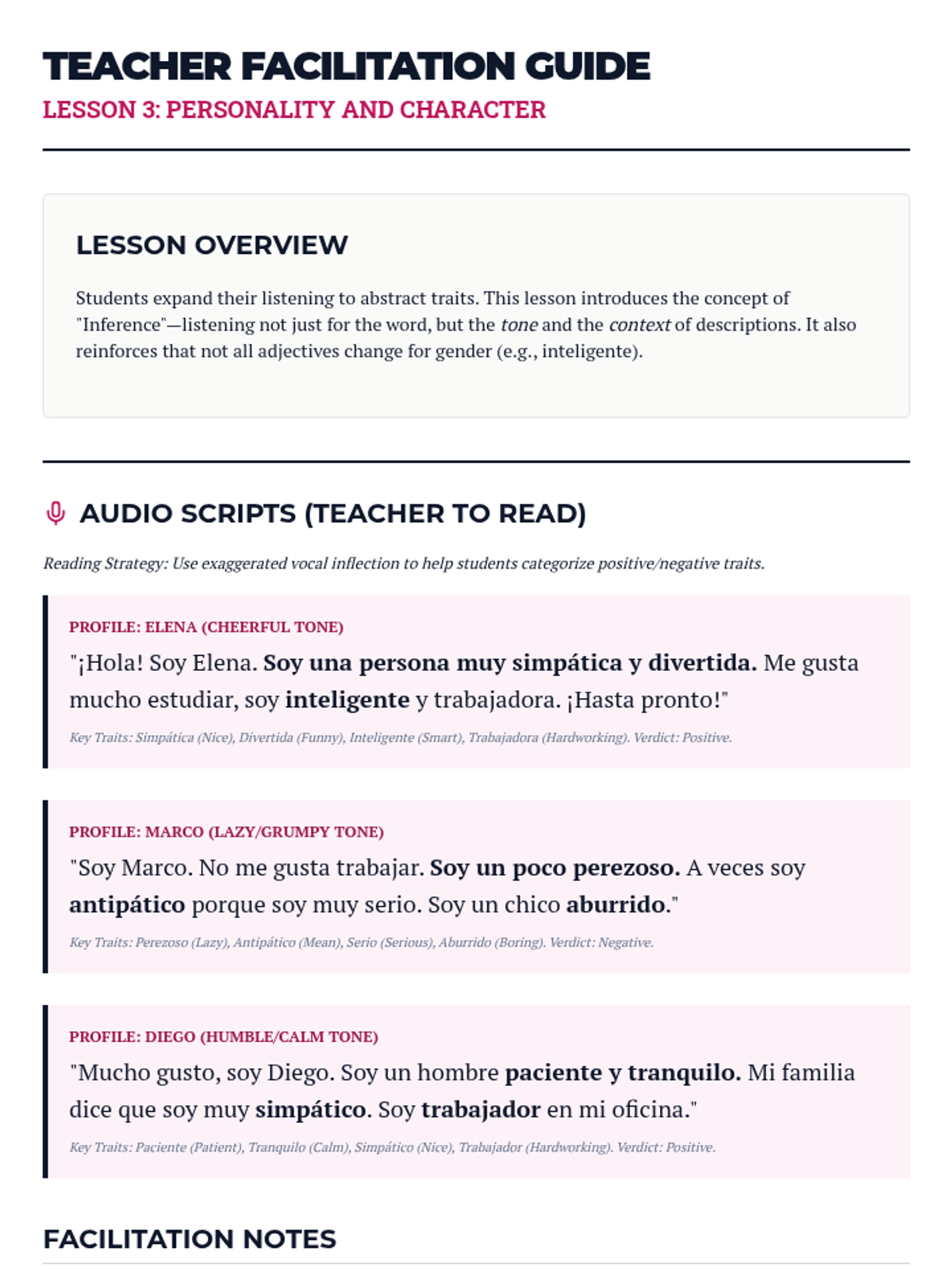 Students explore personality traits through listening, identifying positive and negative influences based on auditory character descriptions.
