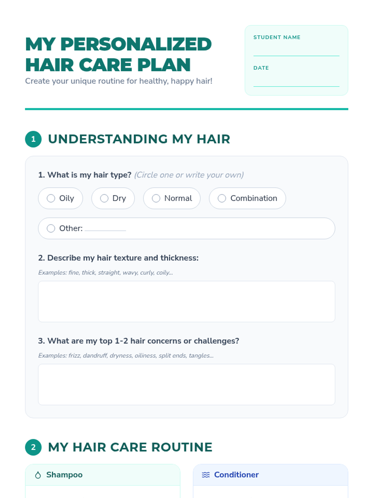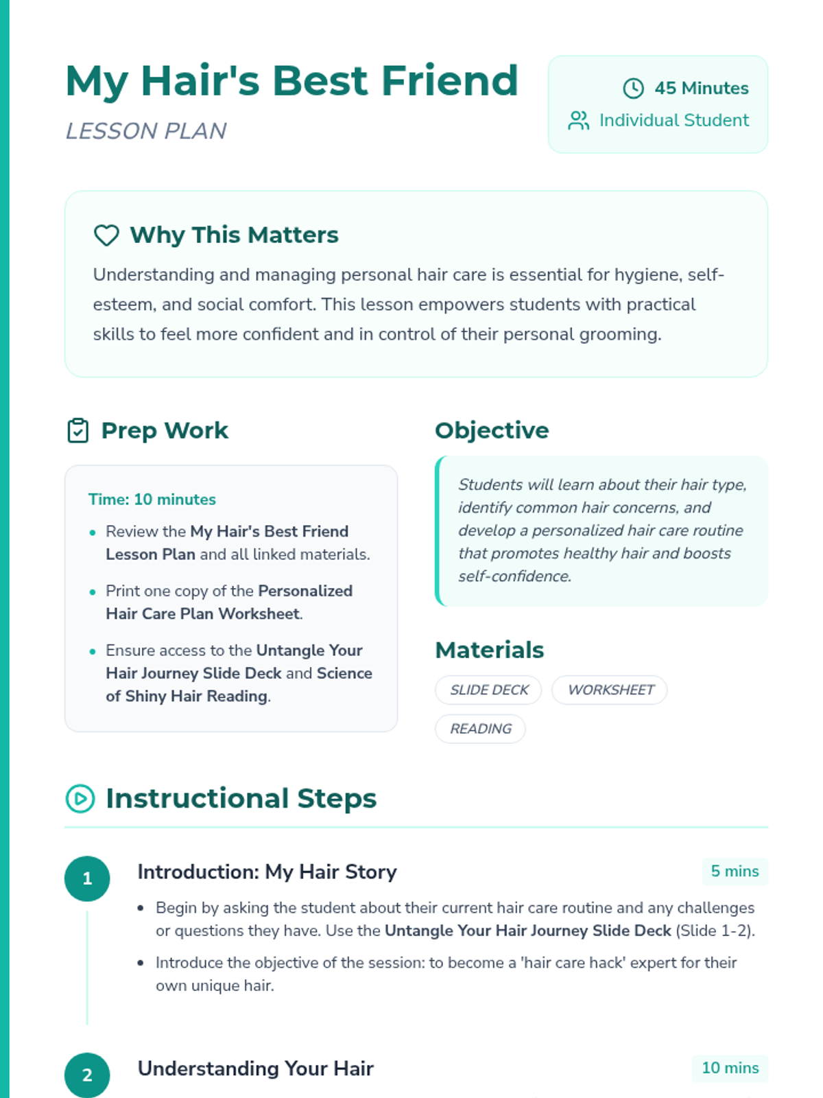 This lesson empowers students with practical hair care tips and personalized routines, addressing common concerns to build confidence and self-efficacy in personal grooming.