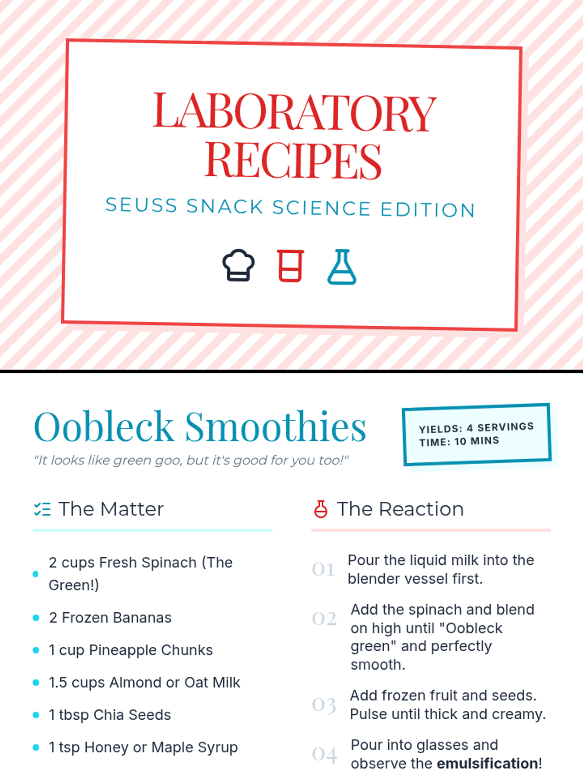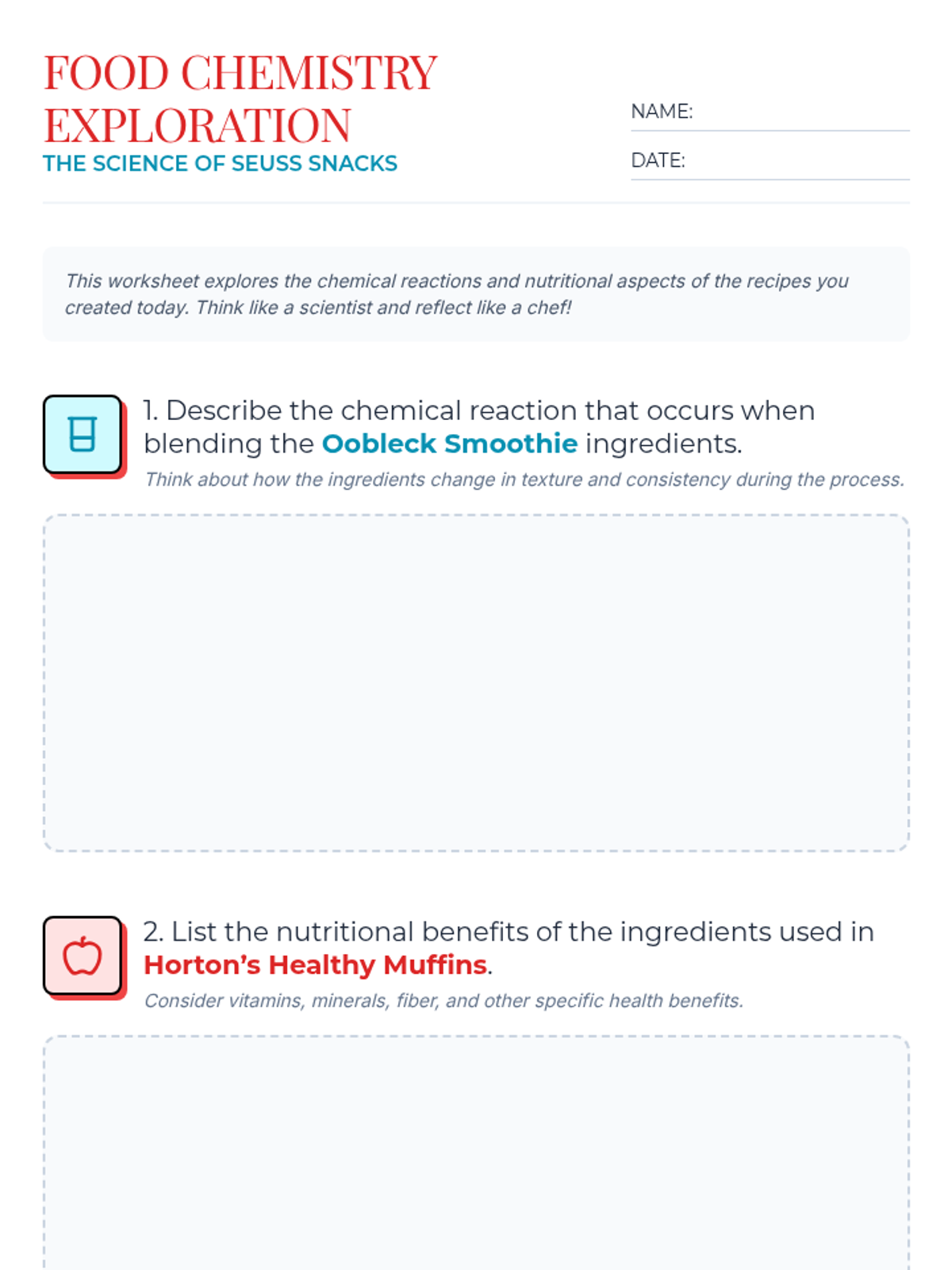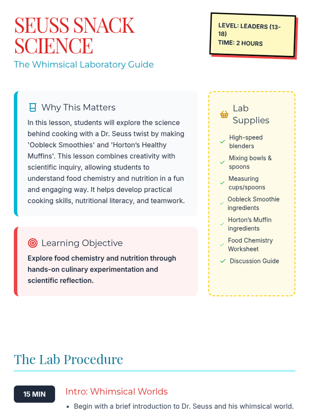 Students explore the chemistry of cooking and nutrition through Dr. Seuss-inspired recipes like Oobleck Smoothies and Horton’s Healthy Muffins. This lesson blends scientific inquiry with practical culinary skills for teens.