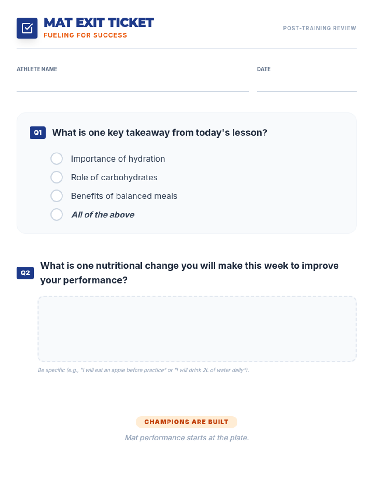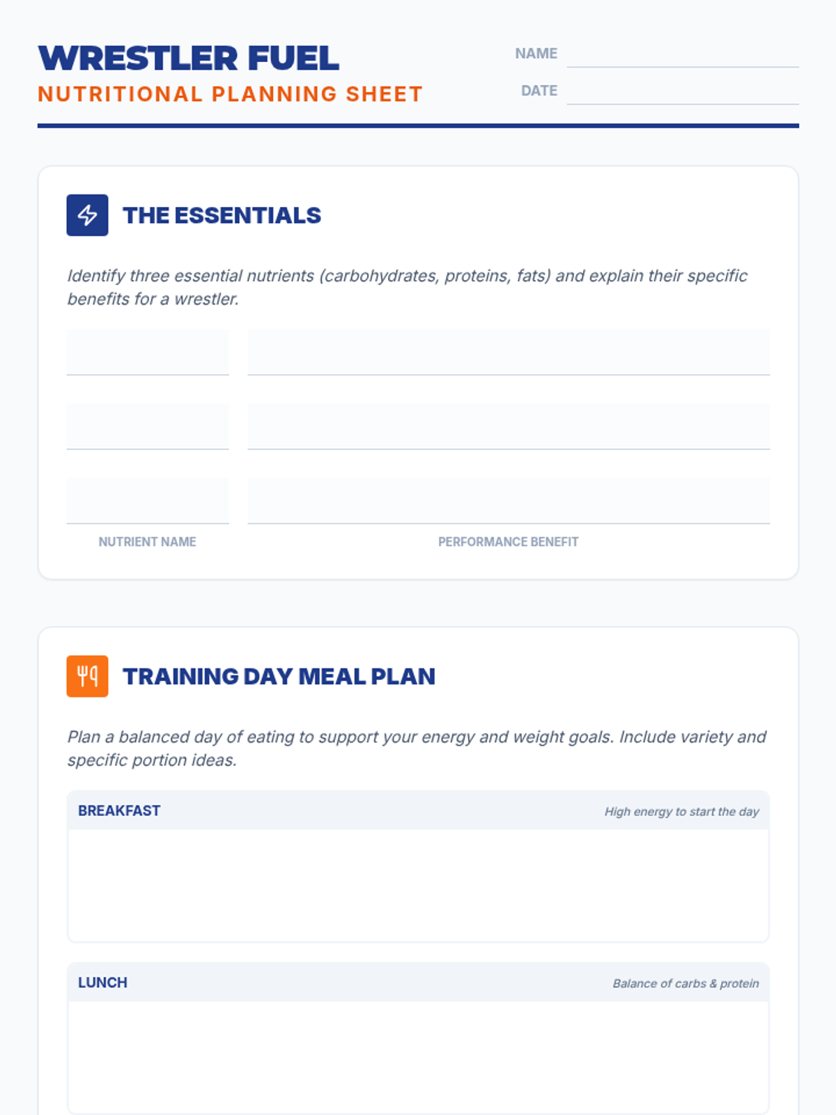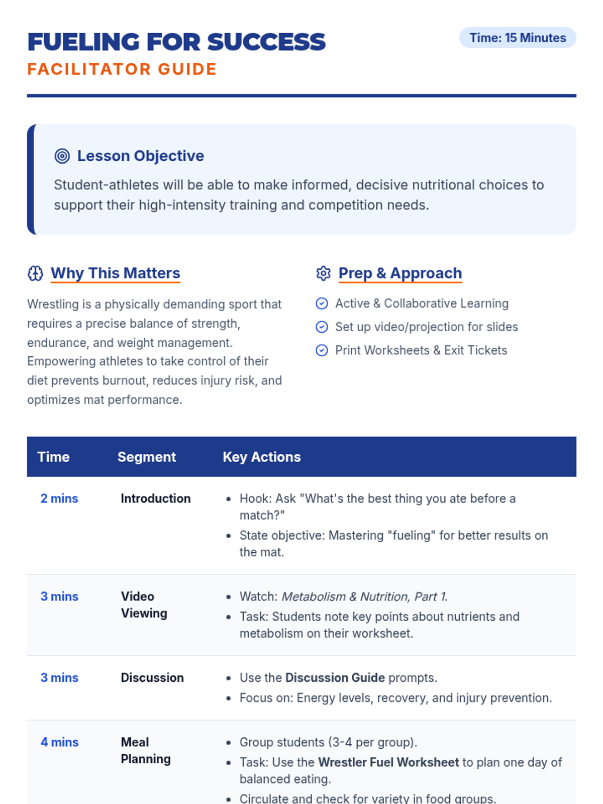 This 15-minute session equips high school wrestlers with essential nutritional knowledge to optimize their performance on the mat through macronutrient understanding and meal planning.